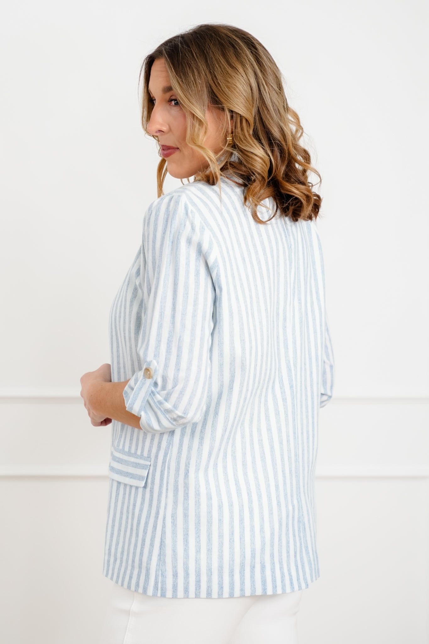 This is the layering piece that instantly pulls everything together. The linen blend keeps it light and breathable, and the soft vertical stripes give it that clean, classic feel. It has enough structure to feel tailored but still moves comfortably with you. Layer it over a simple tank and denim when you want to step things up, or pair it with trousers for an easy office-ready look.