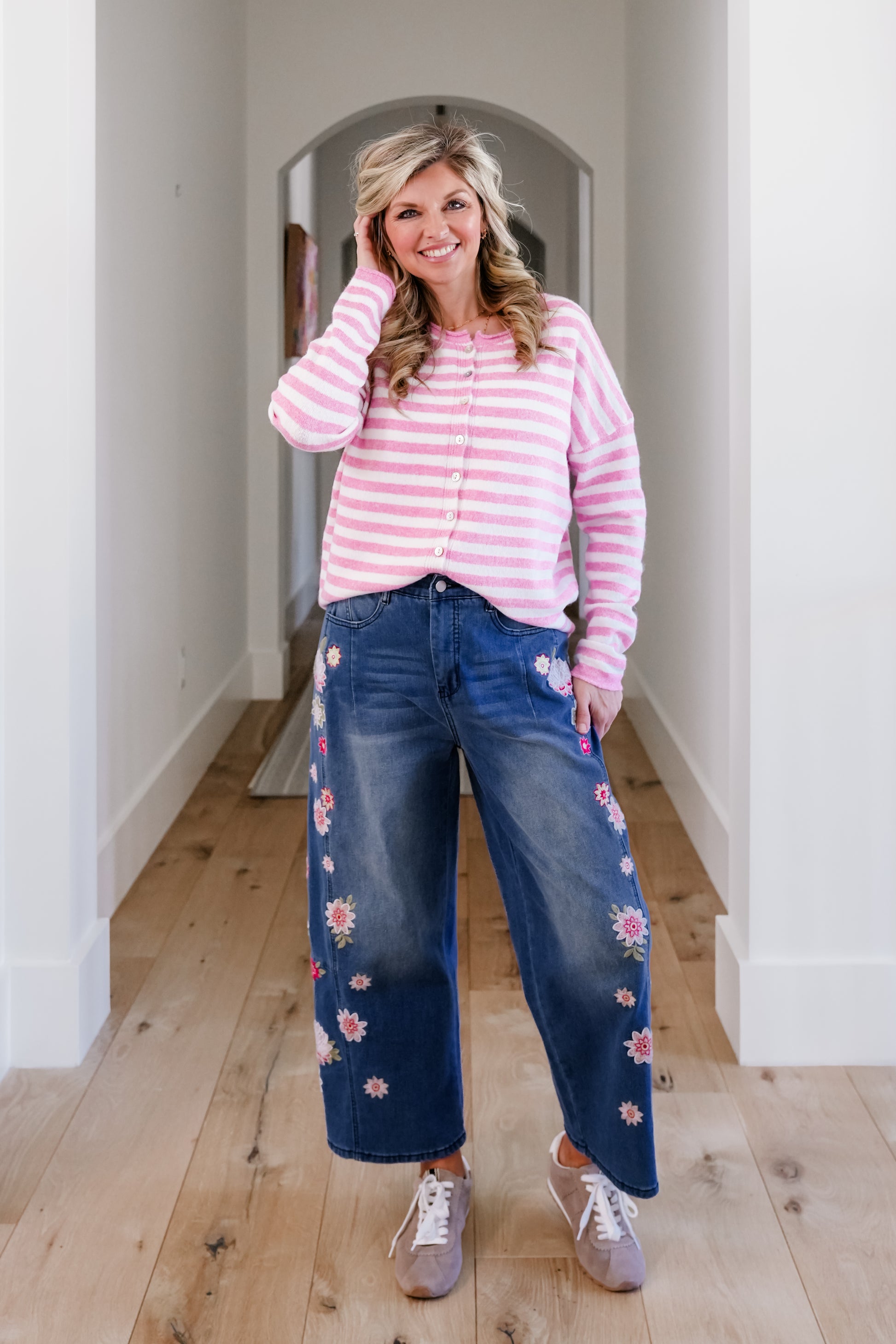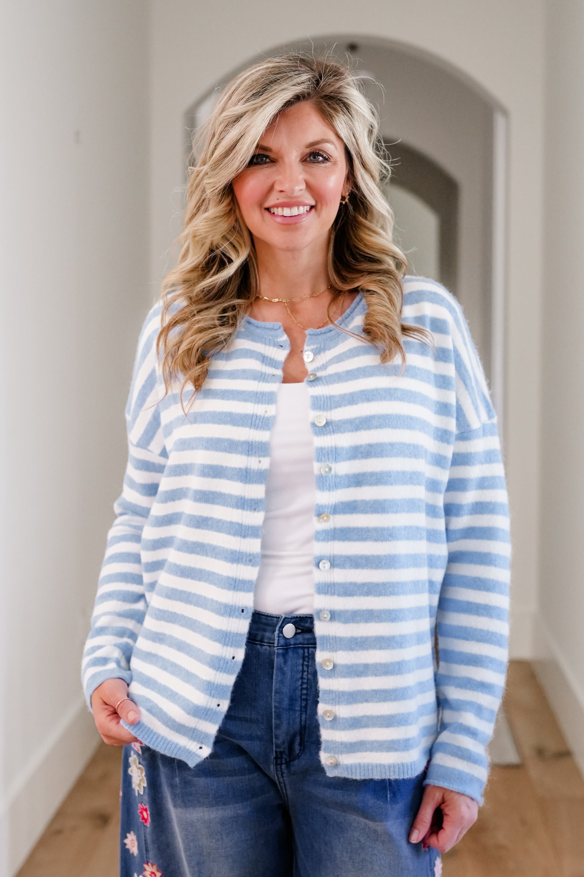 This cardigan is an easy layer that instantly elevates everyday outfits. The classic stripes feel timeless, and the relaxed shape works buttoned up or worn open over tanks and tees.