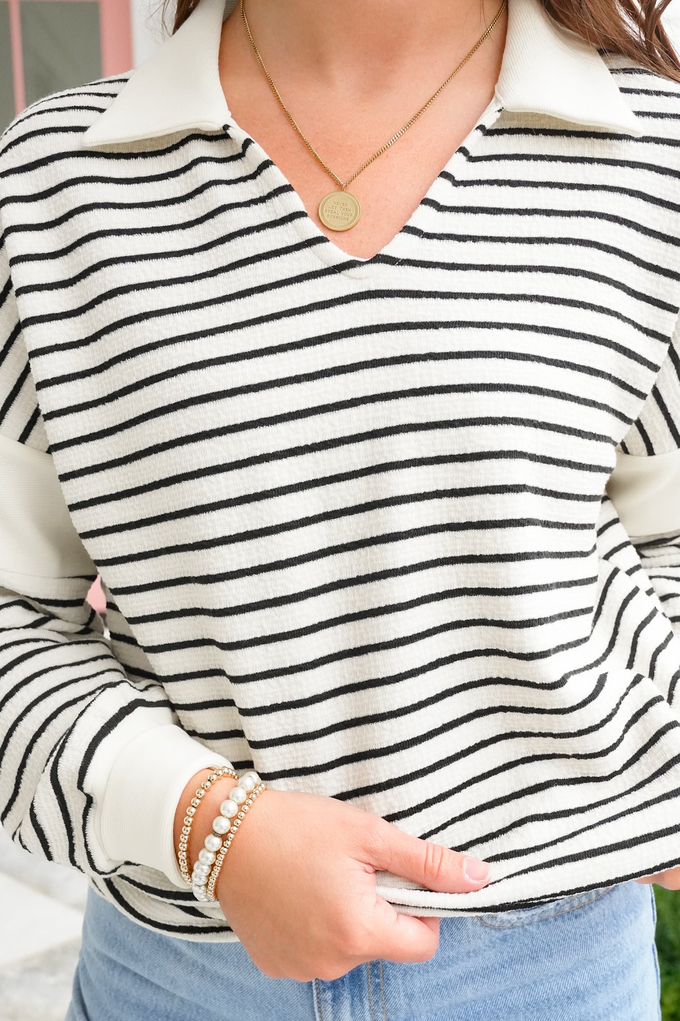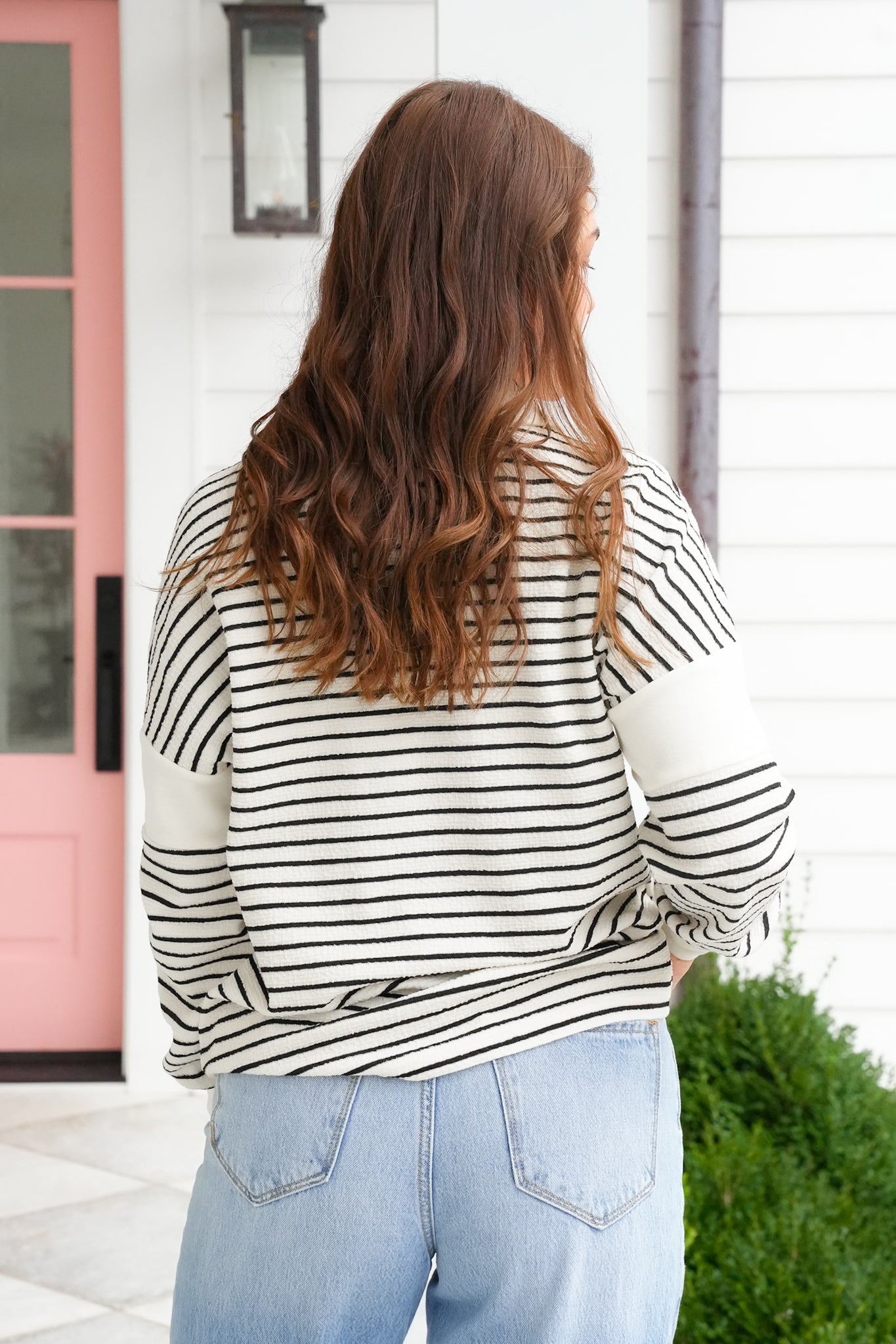 This pullover gives off that effortlessly cool, sporty feel while still keeping things polished and chic. The textured fabric feels so luxe, and the black and cream stripes make it a forever favorite in your closet. Pair it with denim for a casual day out or layer it up for a more elevated look.