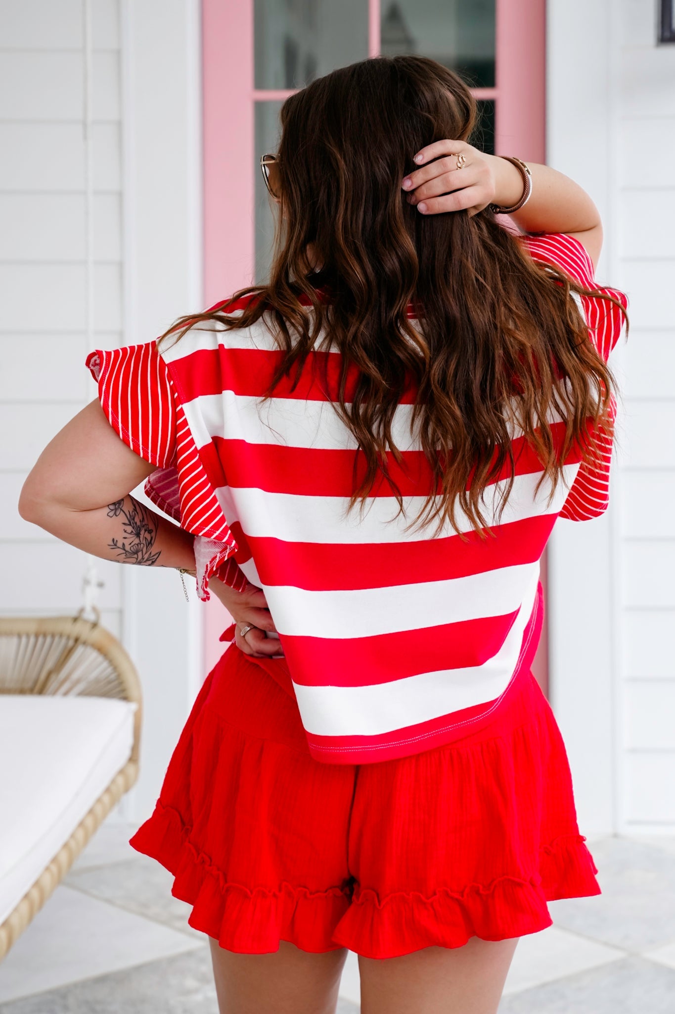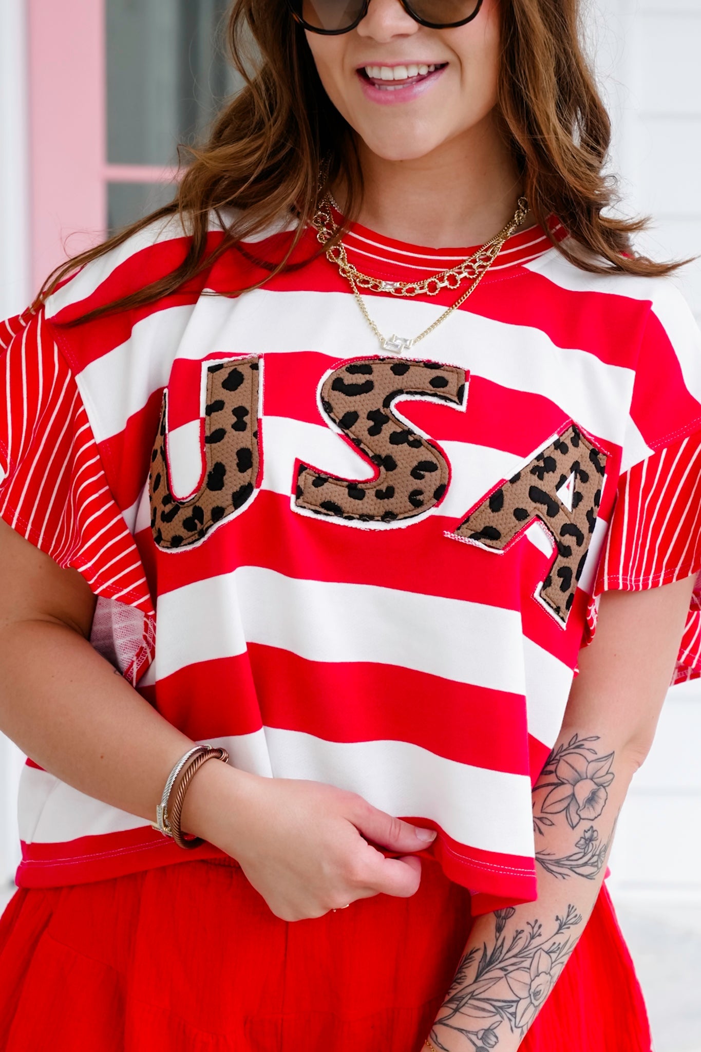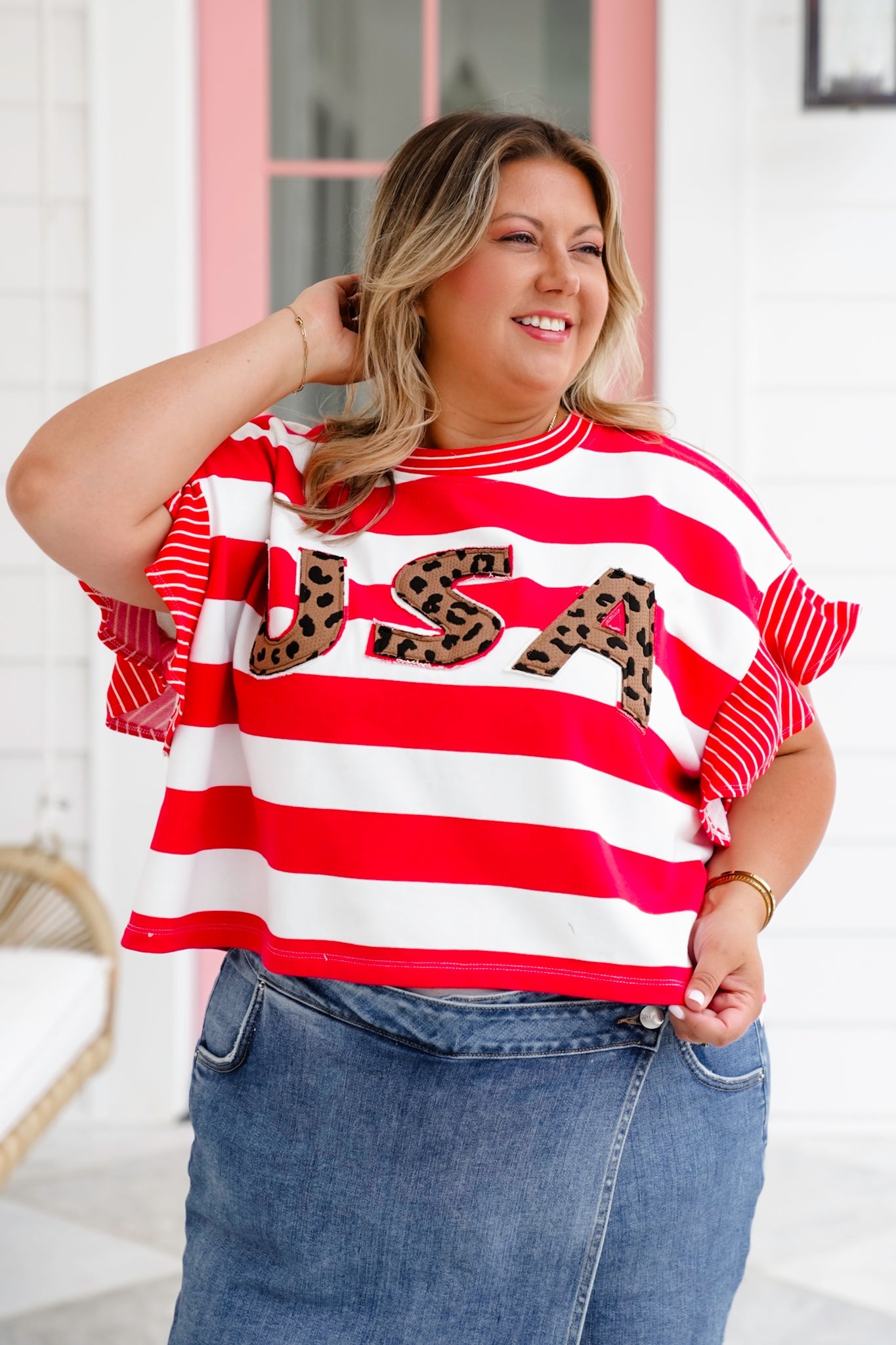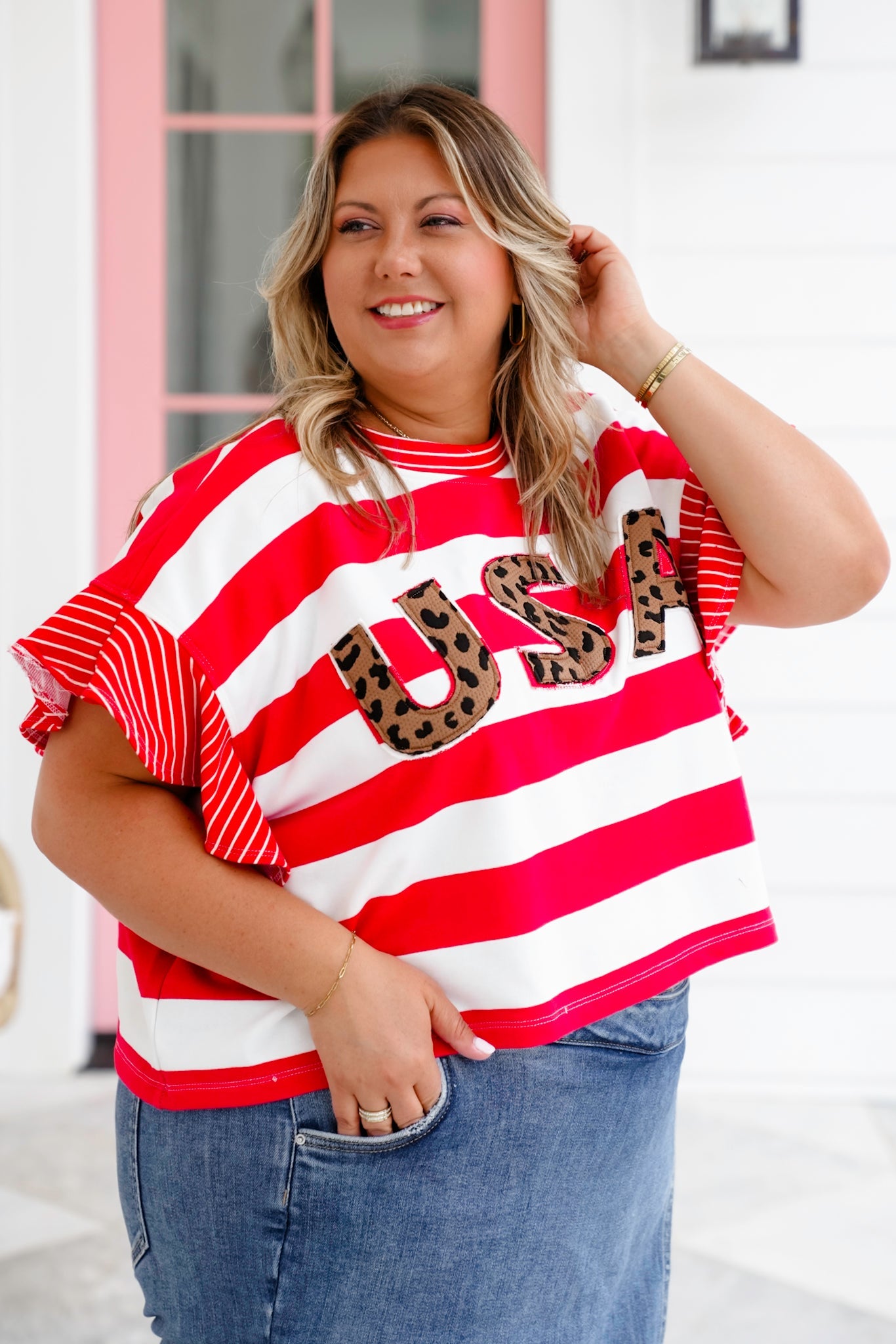 This top brings the bold! With vibrant red and white stripes, flouncy ruffle sleeves, and standout leopard print "USA" lettering, it’s the ultimate mix of fierce and festive. Whether you're headed to a parade or just feel like turning heads, this tee brings all the fun. Pair it with cutoffs, a bright skort, or wide-leg denim for a statement-worthy summer 'fit.
