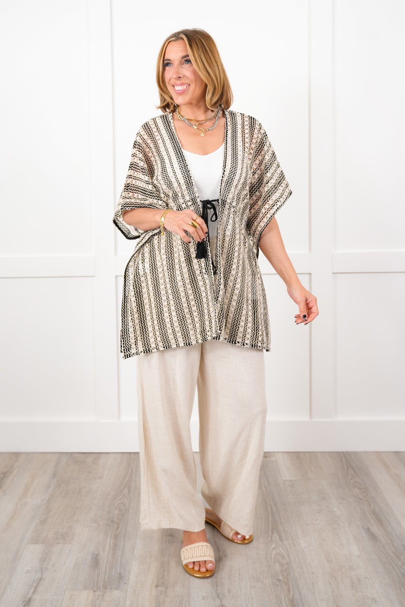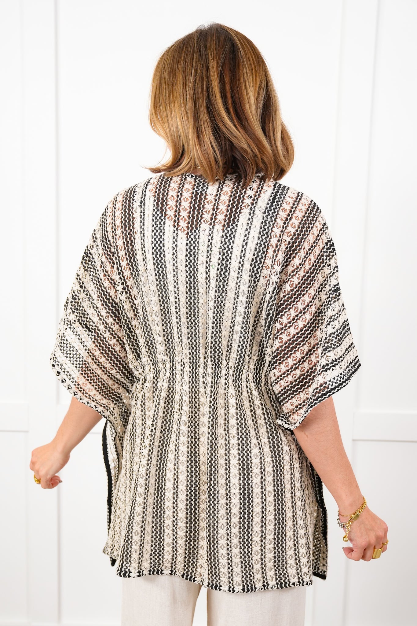 This breezy boho beauty is the layering piece your closet's been craving! The open-knit design, playful stripes, and flowy poncho sleeves make it a dreamy match for tanks, dresses, or swimsuits. And with a functional drawstring waist, you can cinch it for shape or leave it loose for laid-back lounging. You’ll want both colorways for mix-and-match magic!