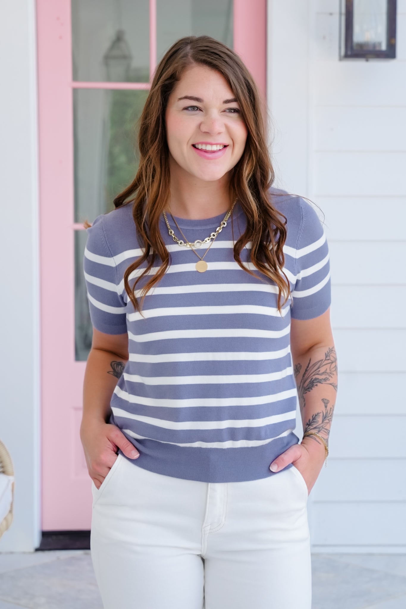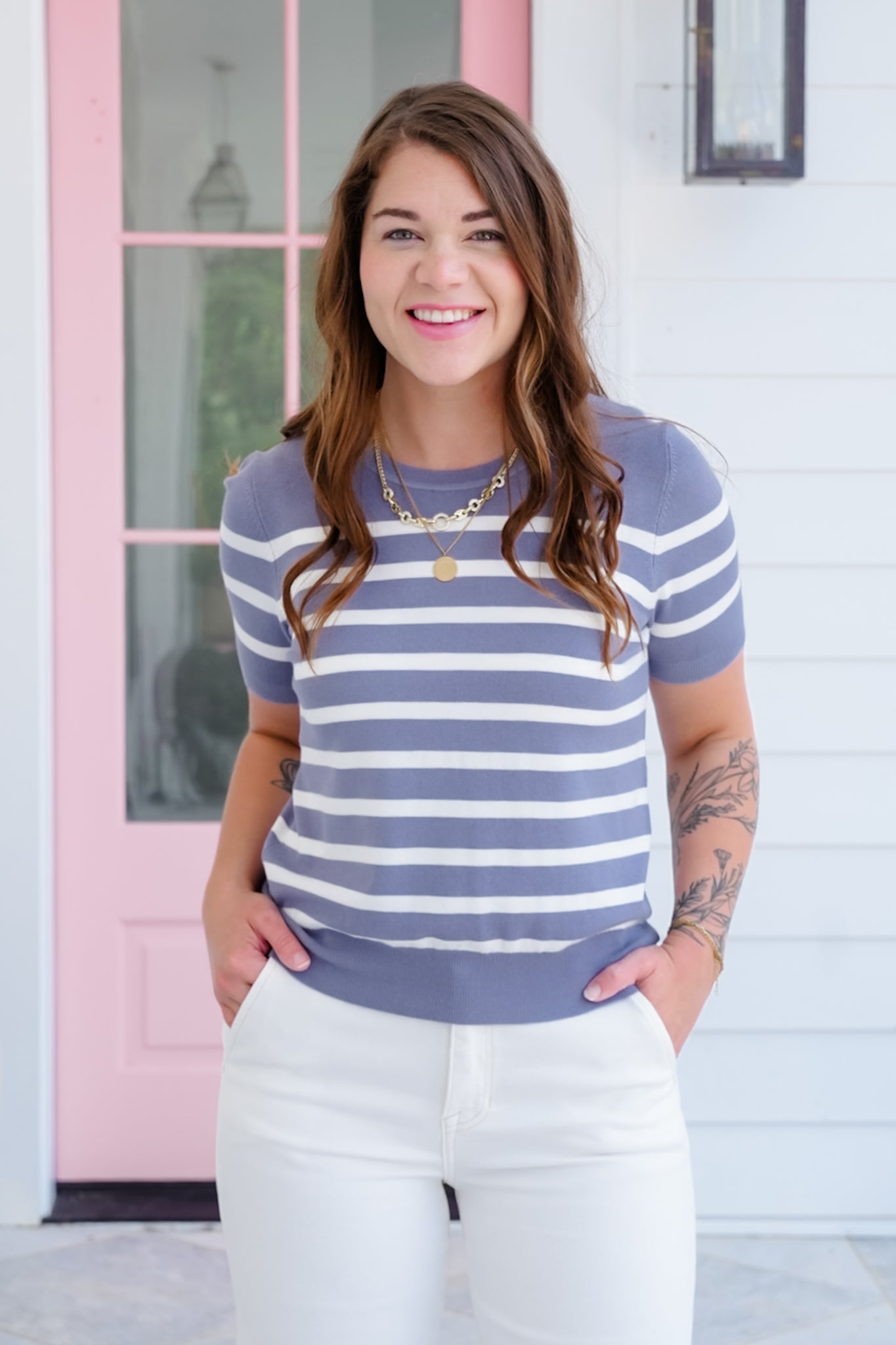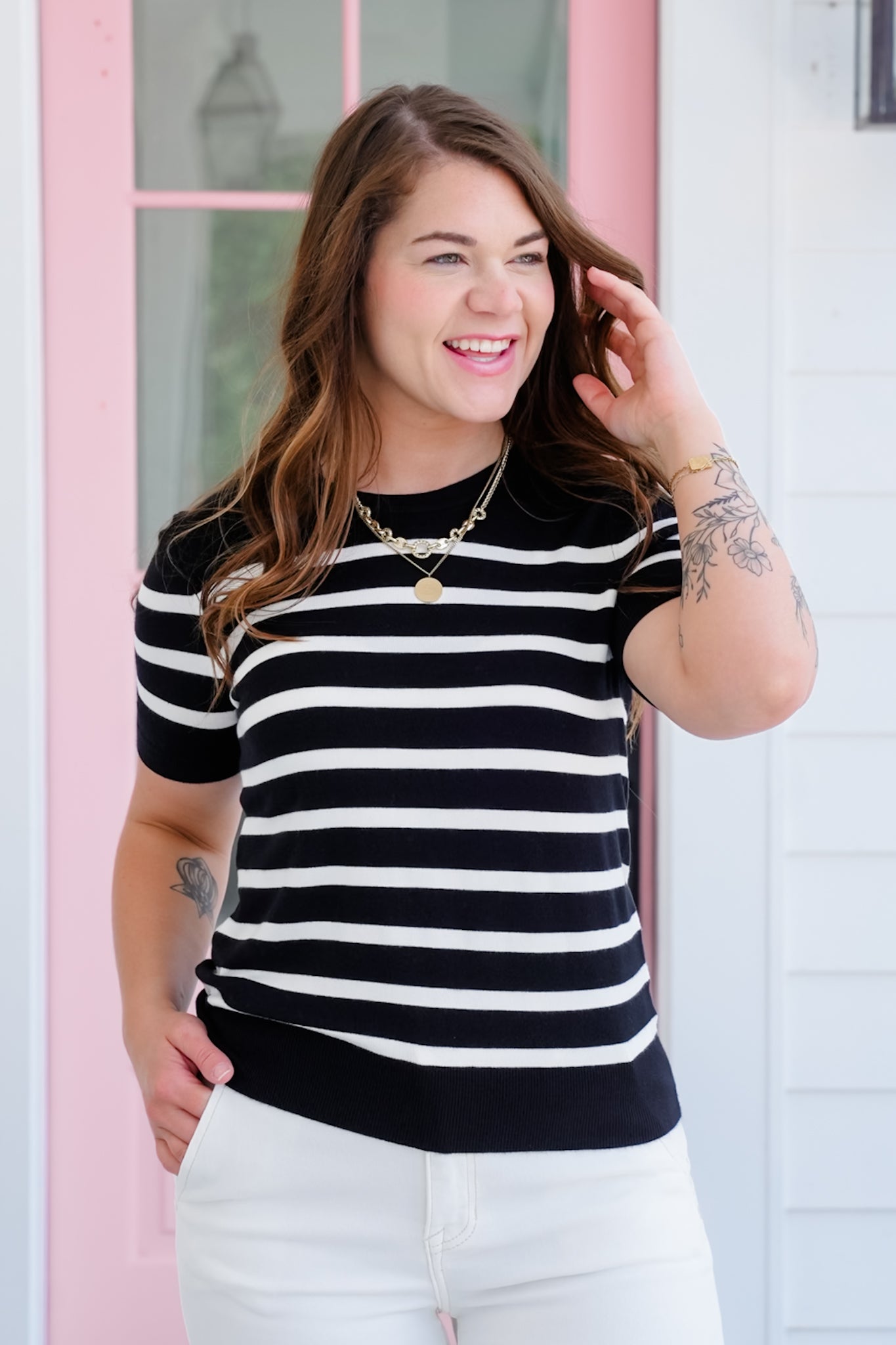 Classic stripes meet cozy comfort in this short-sleeved sweater top. The soft, stretchy knit hugs you in all the right places without feeling bulky. Style it with white denim for a crisp daytime look, tuck it into a midi skirt for brunch, or layer it with a blazer for casual workdays. It’s an easy piece to transition from day to night!