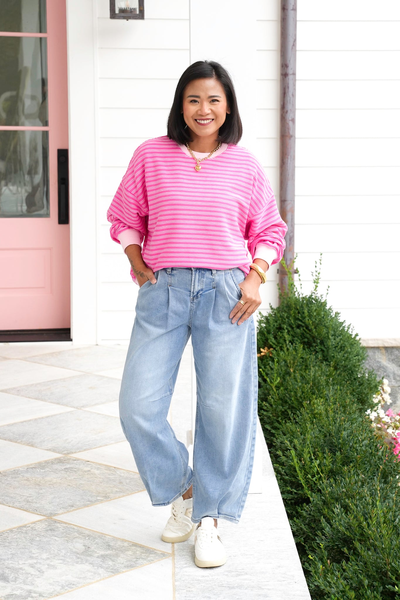 This striped knit pullover is an easy favorite for your everyday lineup! The soft stretch knit and relaxed cut give it that comfy, laid-back vibe while still looking polished. Pair it with jeans, leggings, or layer it over a collared shirt for a cute, casual combo.