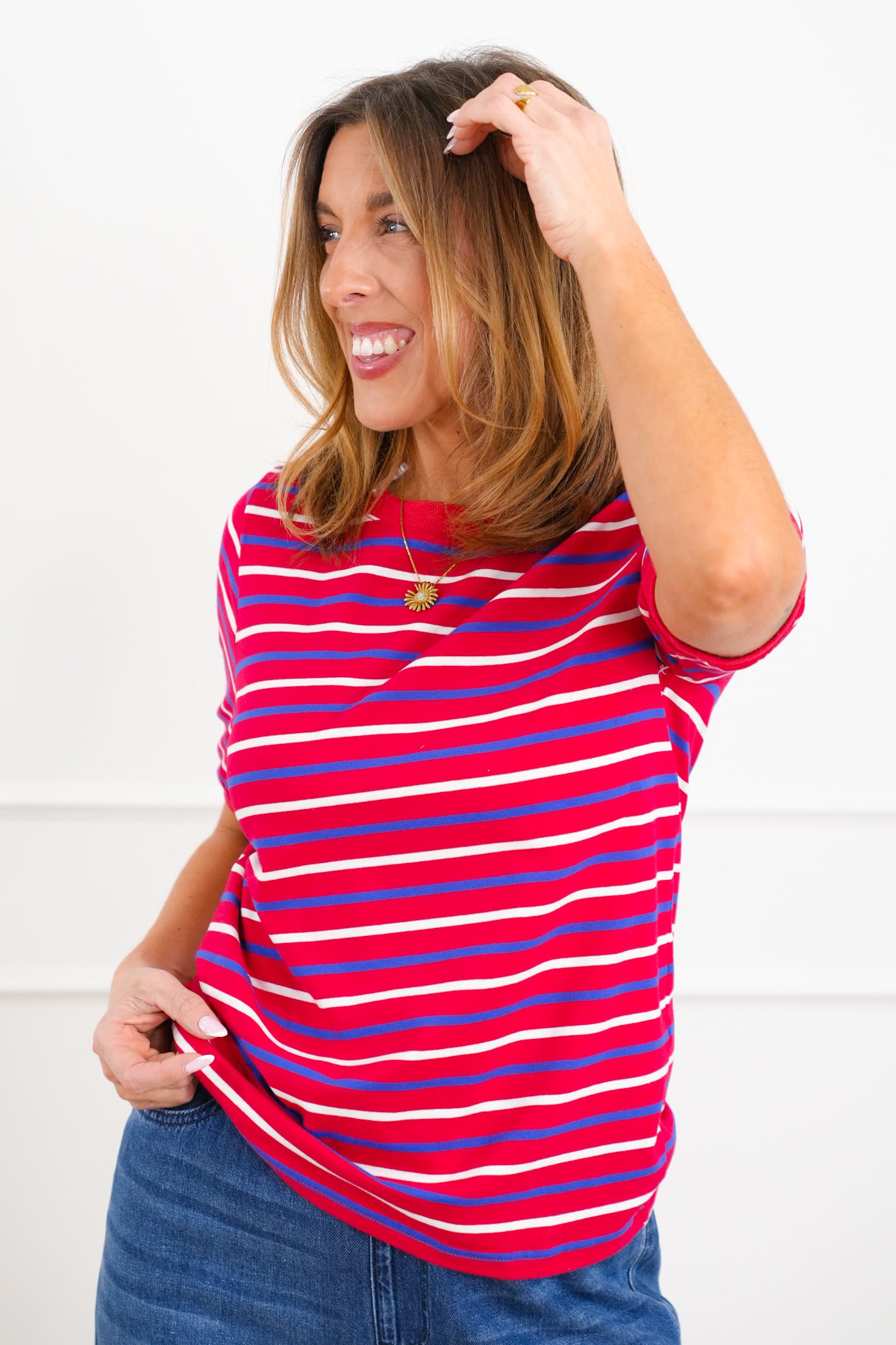This top is one of those easy wins you can throw on and instantly feel put together. The soft, stretchy fabric keeps it comfortable, while the classic stripes make it an effortless match with denim, shorts, or layered under jackets for everyday wear.
