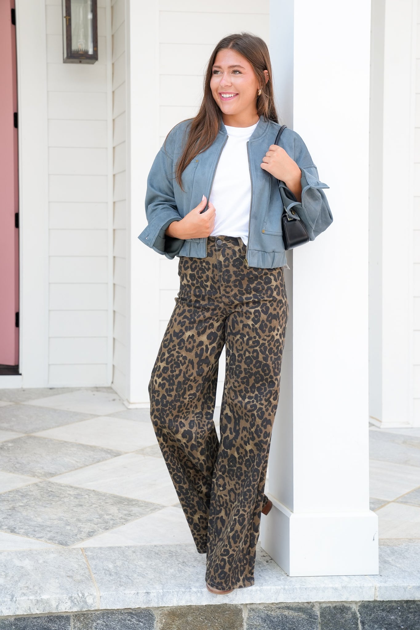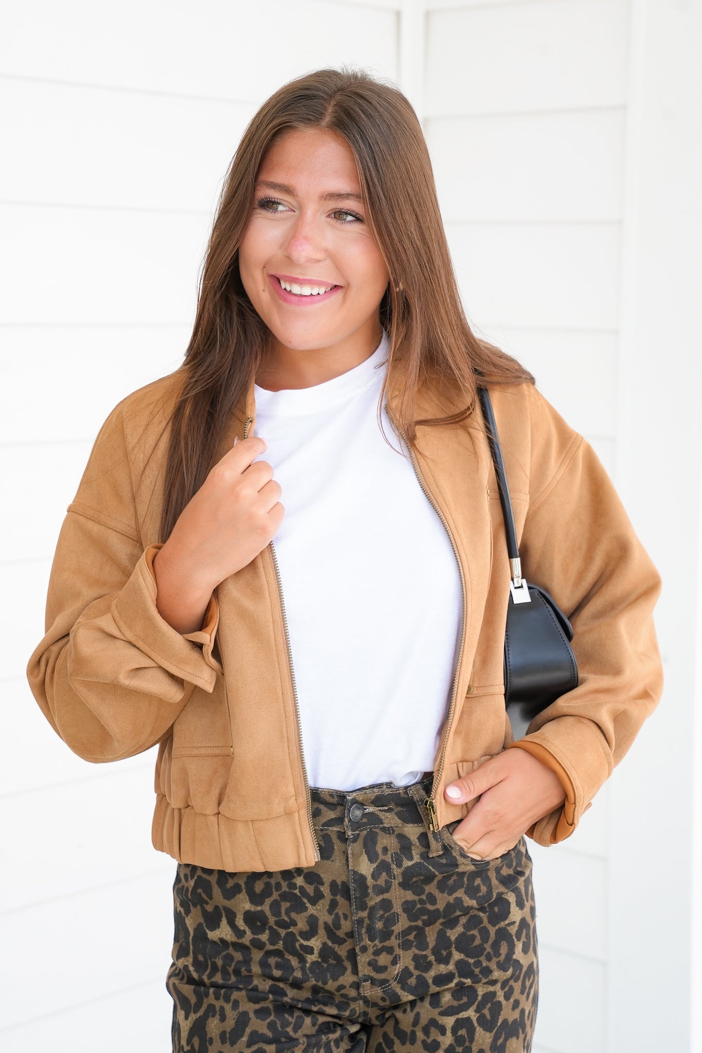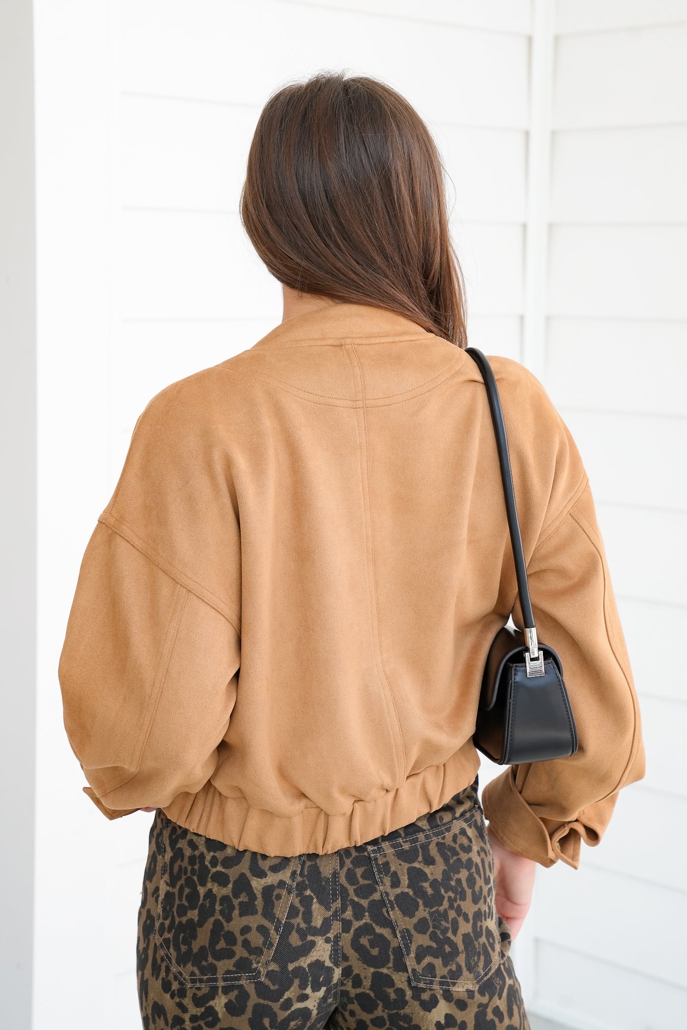 This bomber jacket is the definition of cool-meets-polished. The vegan suede finish instantly elevates your look, whether you’re running errands in joggers or layering it over a slip dress for date night. With its cropped shape and elastic waistband, it hits at just the right spot for a flattering, feminine fit.