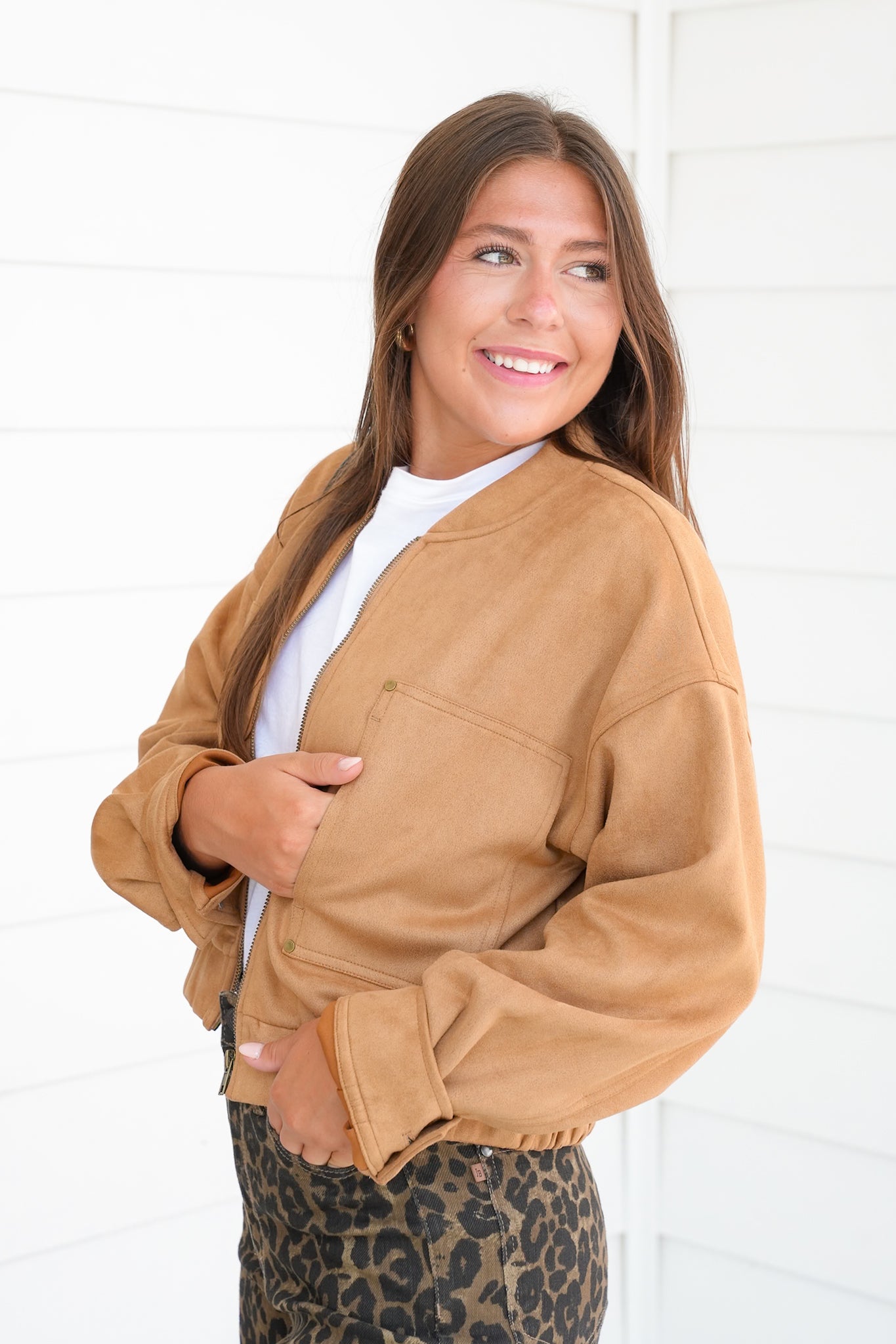 Vegan Suede Long Sleeve Zip Up Bomber Jacket