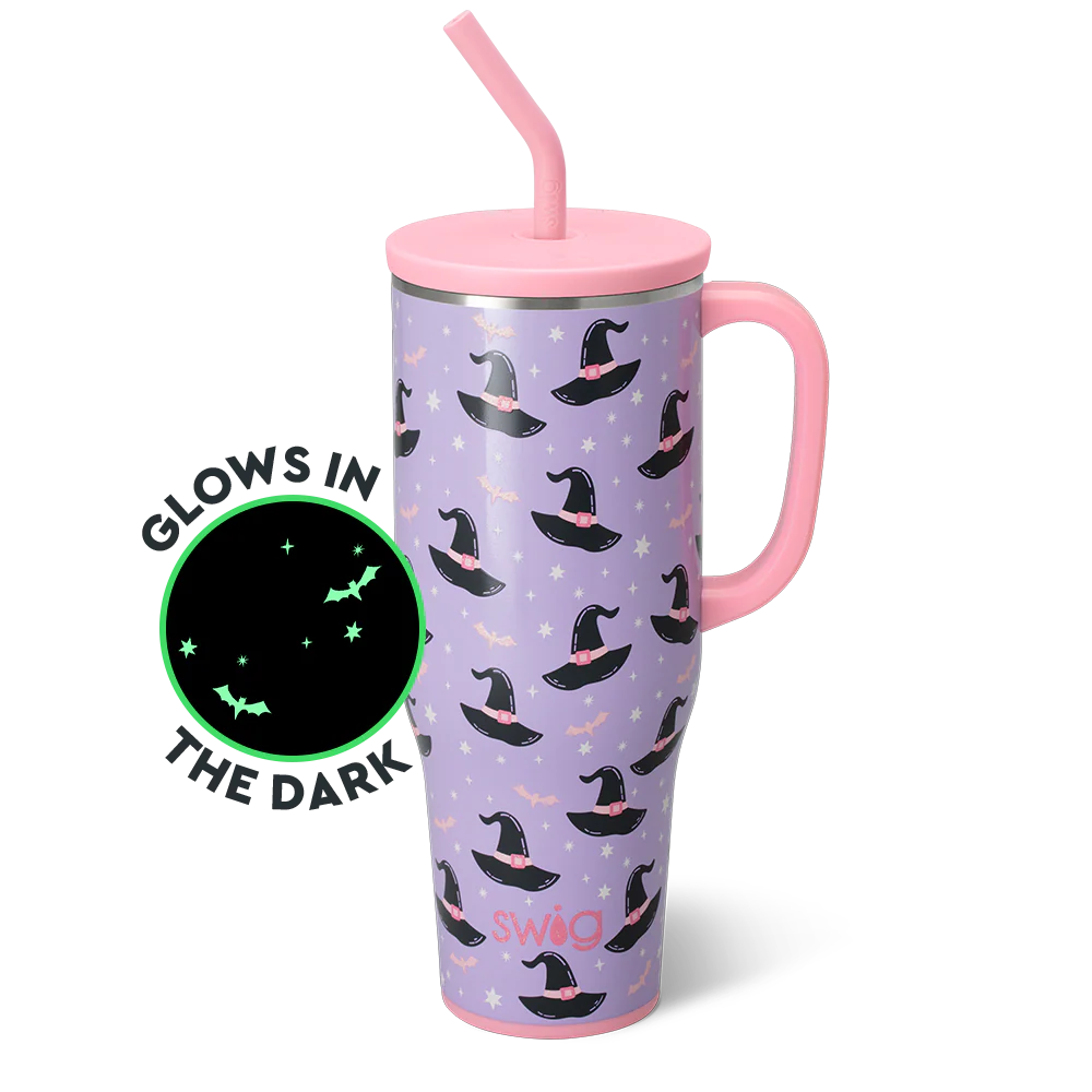Glitter, glow-in-the-dark bats and stars float among whimsical witch hats on a glitter lavender background. Available in two cup styles so you can pick your favorite (or collect them all!).
