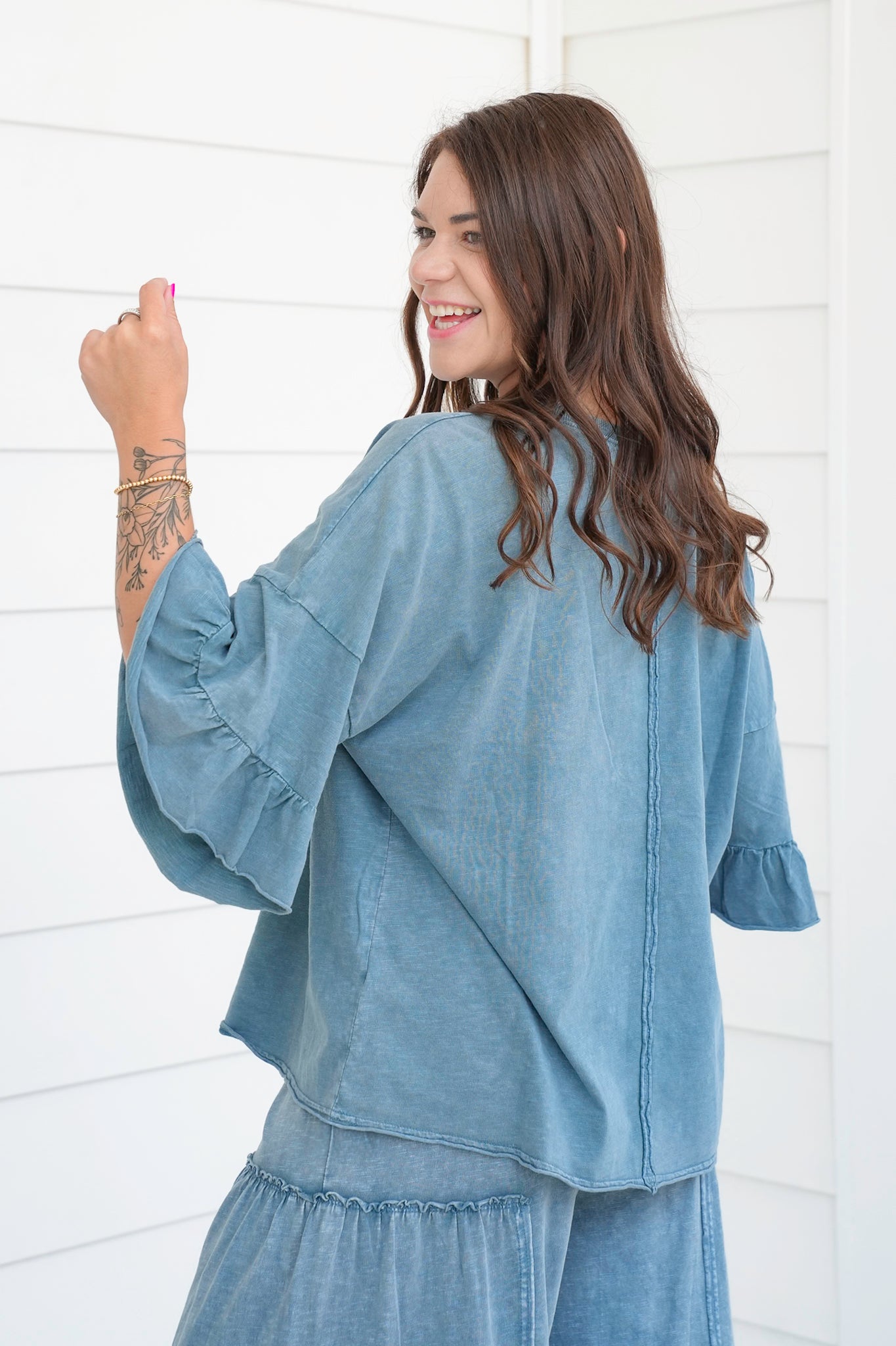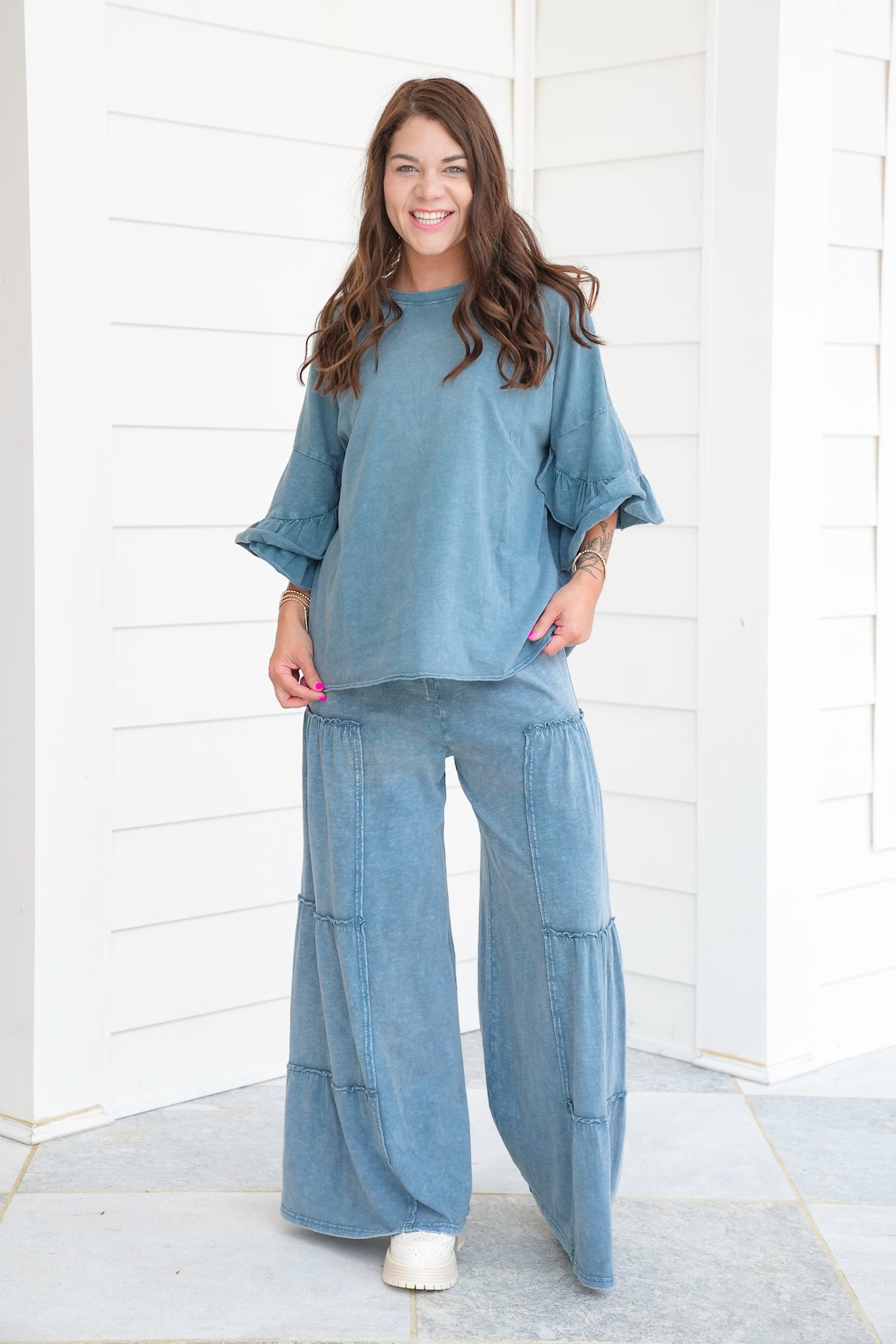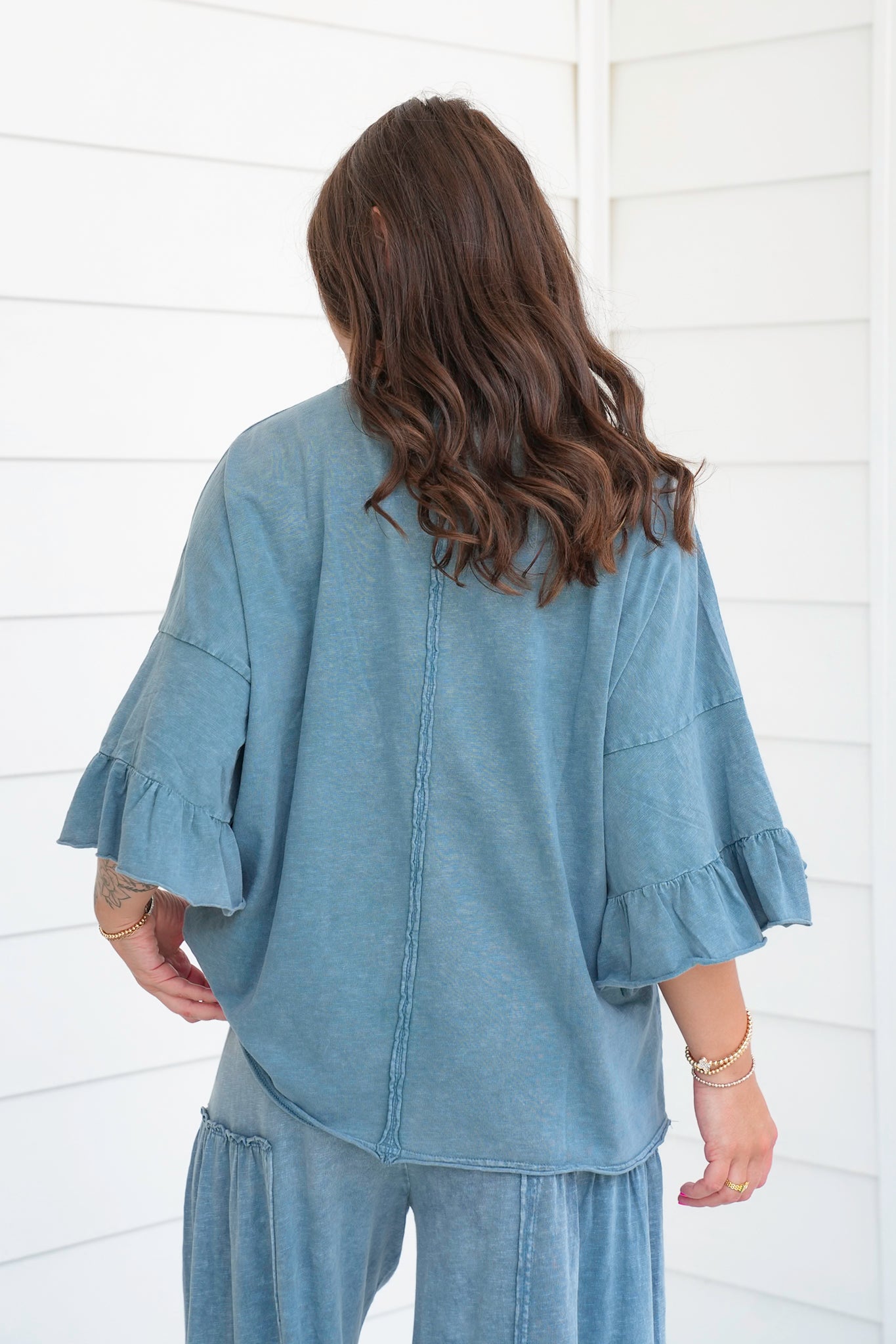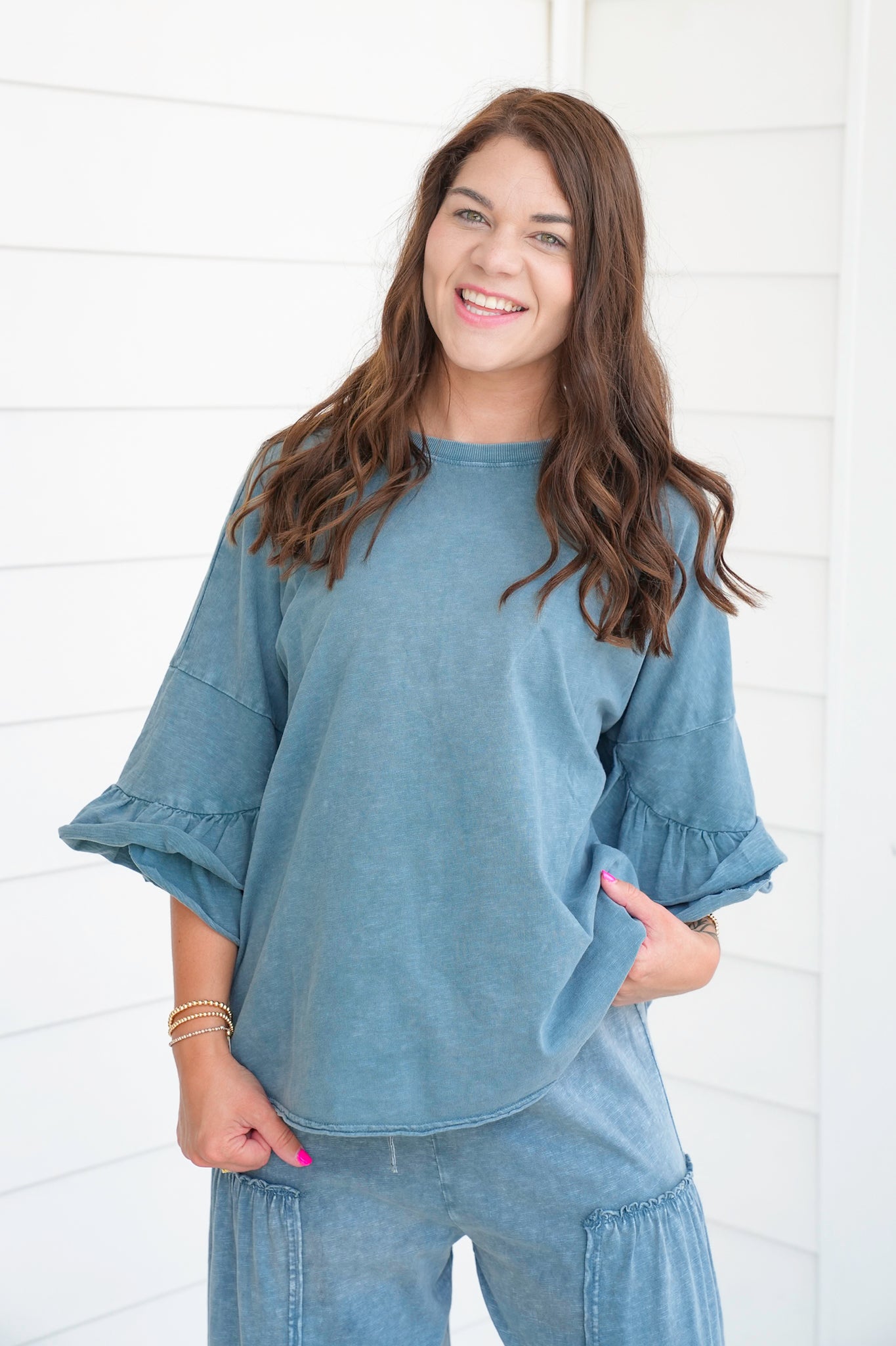 This top is the definition of relaxed chic. The oversized cut paired with flirty ruffle sleeves gives it that perfect balance of casual and fun. The mineral wash adds depth and character, making it an instant favorite. Wear it with the matching pants for a breezy set or style with cutoffs for an easy summer outfit.