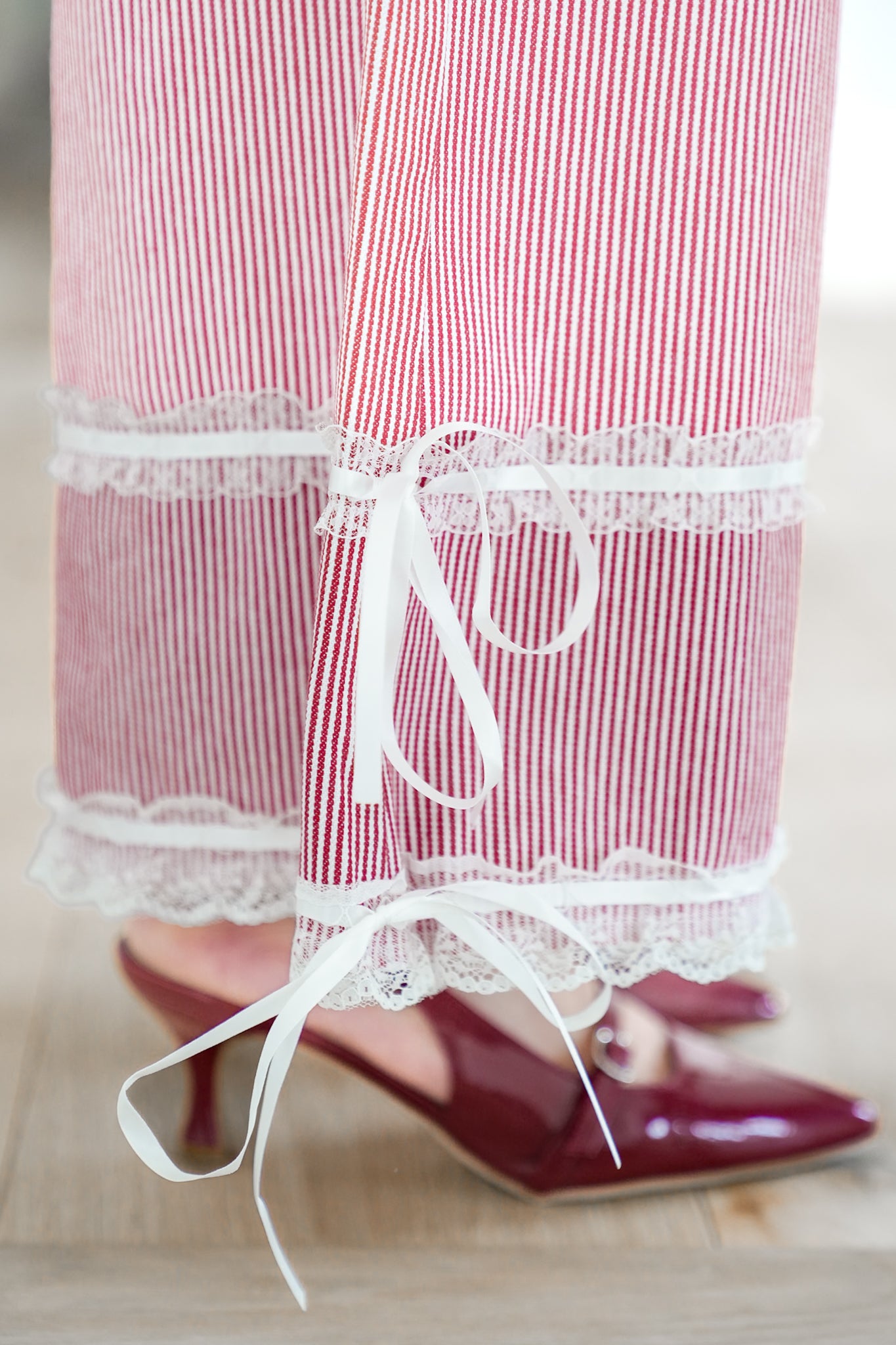 Plus/Reg Stripe Cropped Wide Leg Pants with Lace Detail