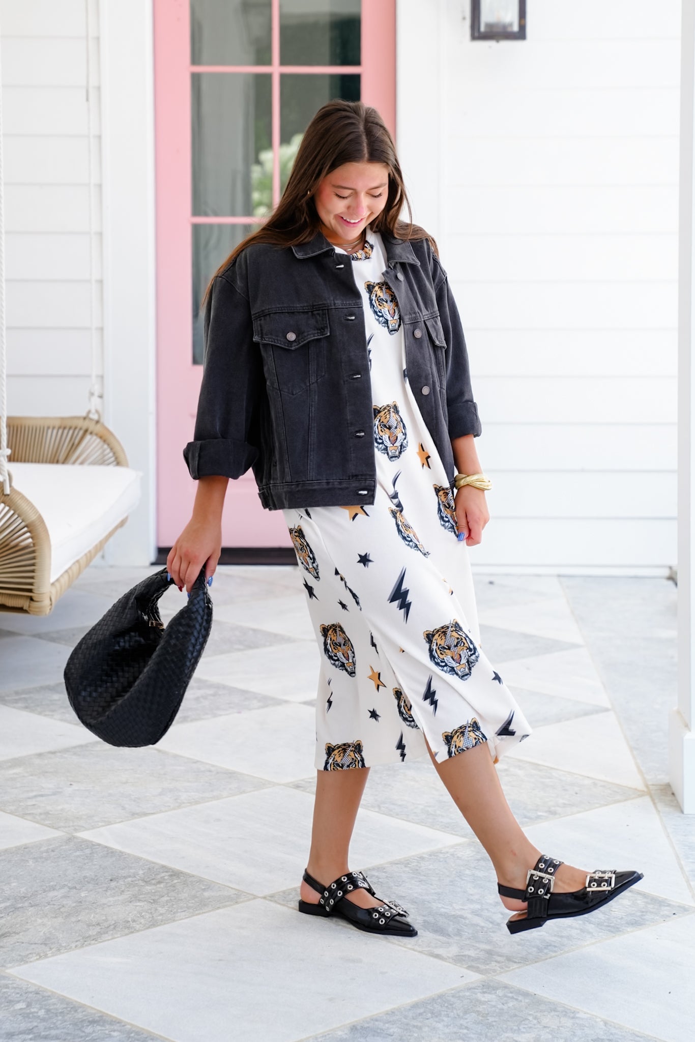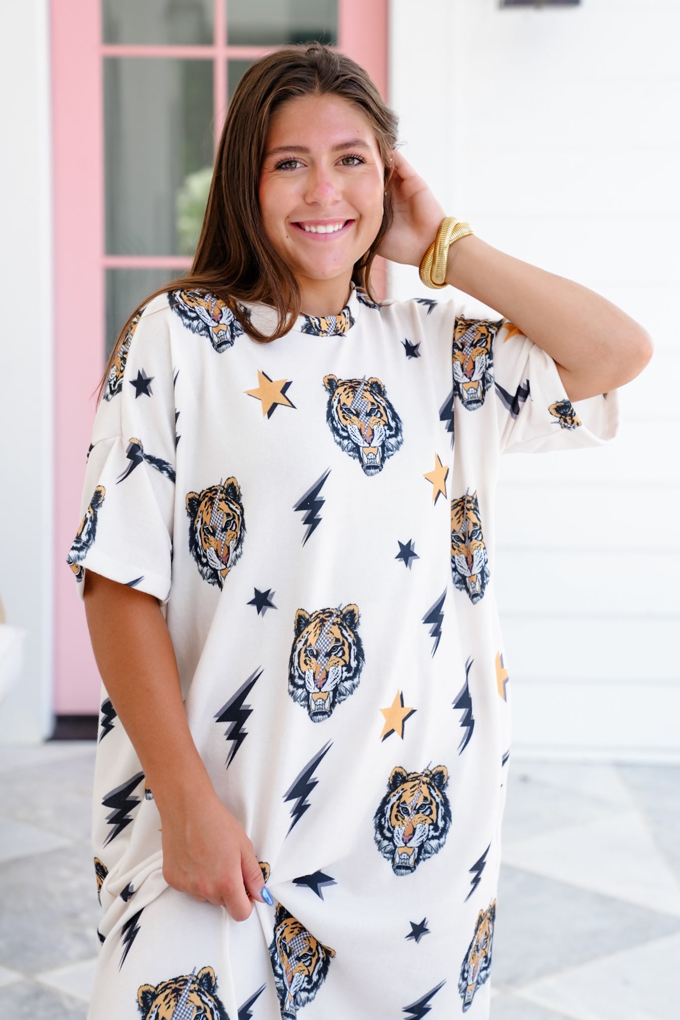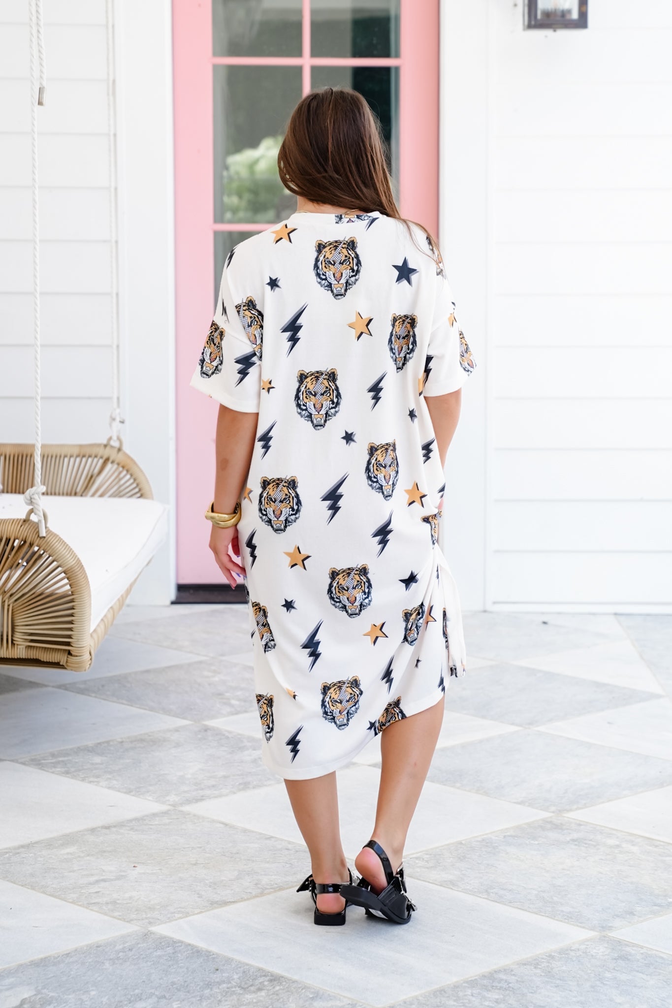 This midi dress is a true statement-maker, covered in fierce tiger prints and playful lightning bolts that instantly stand out. The cuffed short sleeves and side slit balance the bold print with a casual, laid-back feel, making it an easy piece to wear for both everyday errands and fun outings.
