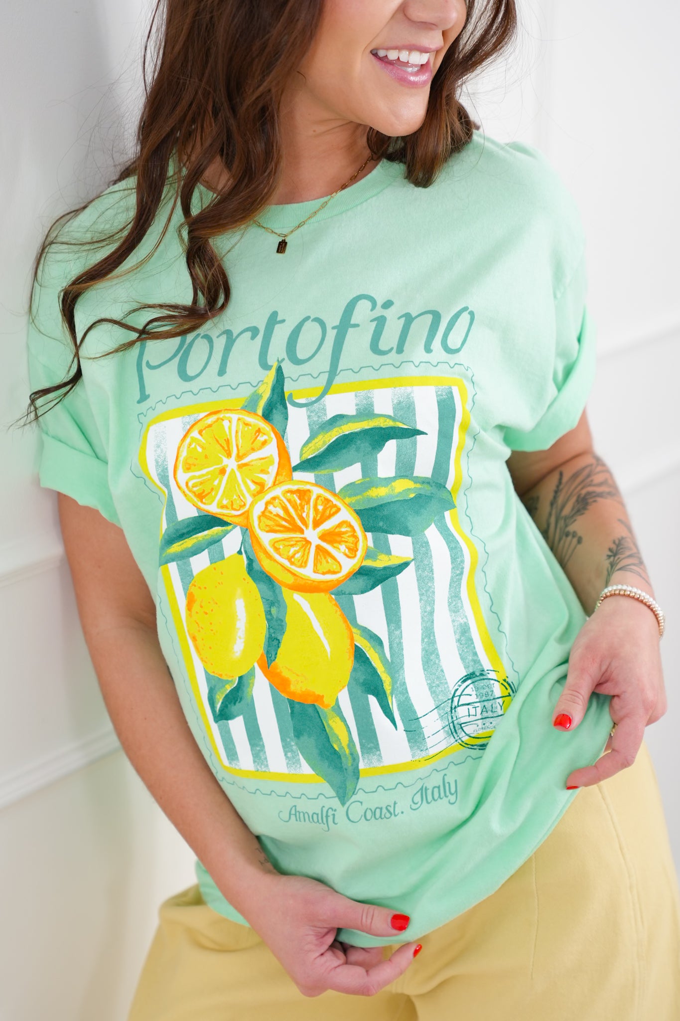 * Bold “Portofino” Amalfi Coast graphic with bright citrus artwork