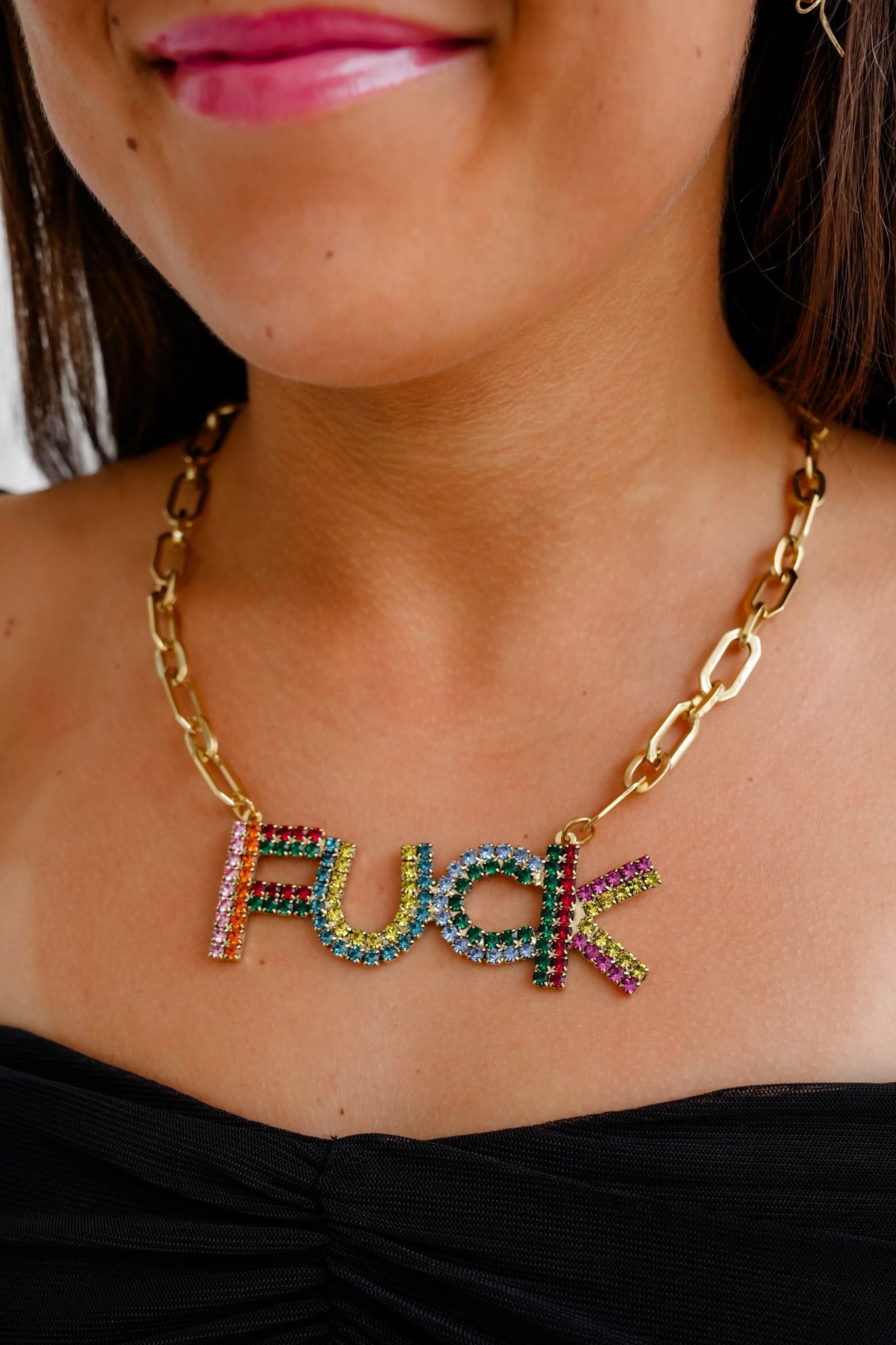 This chain doesn’t whisper, it roars. With chunky links and a sparkling charm that spells it out in bold rainbow stones, this necklace brings glam and grit in one unapologetic piece. Style it with a plunging neckline or layer it with daintier chains for that "good girl gone glam" moment.