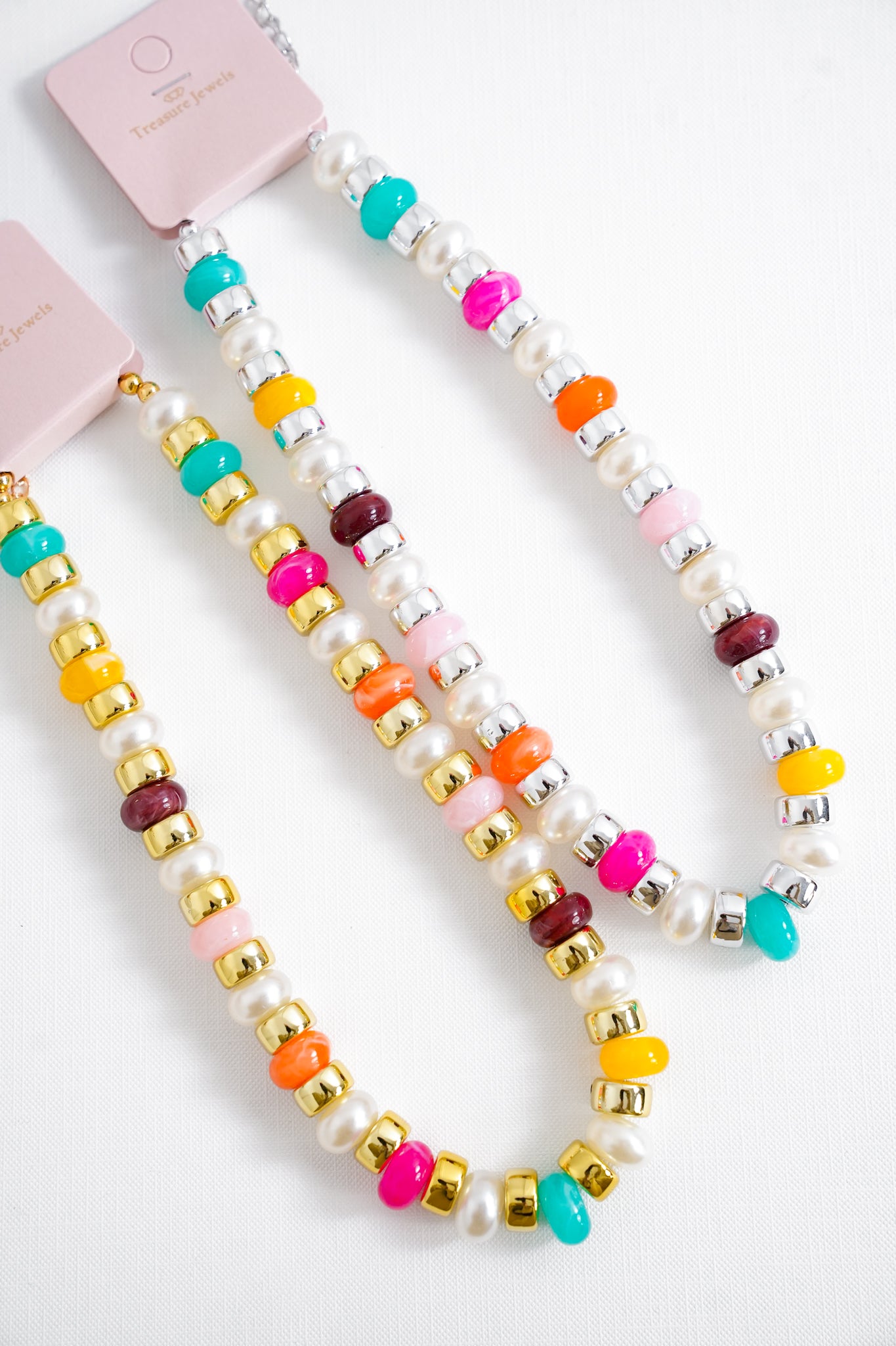 Bring instant happiness to your look with the Joyful Beaded Necklace by Treasure Jewels. Bursting with pops of vibrant color, chic metallic accents, and glossy faux pearls, this necklace makes every outfit feel fun and stylish. Whether you’re pairing it with a simple tee and denim or dressing up a flowy dress, this playful piece adds a pop of personality that turns heads.