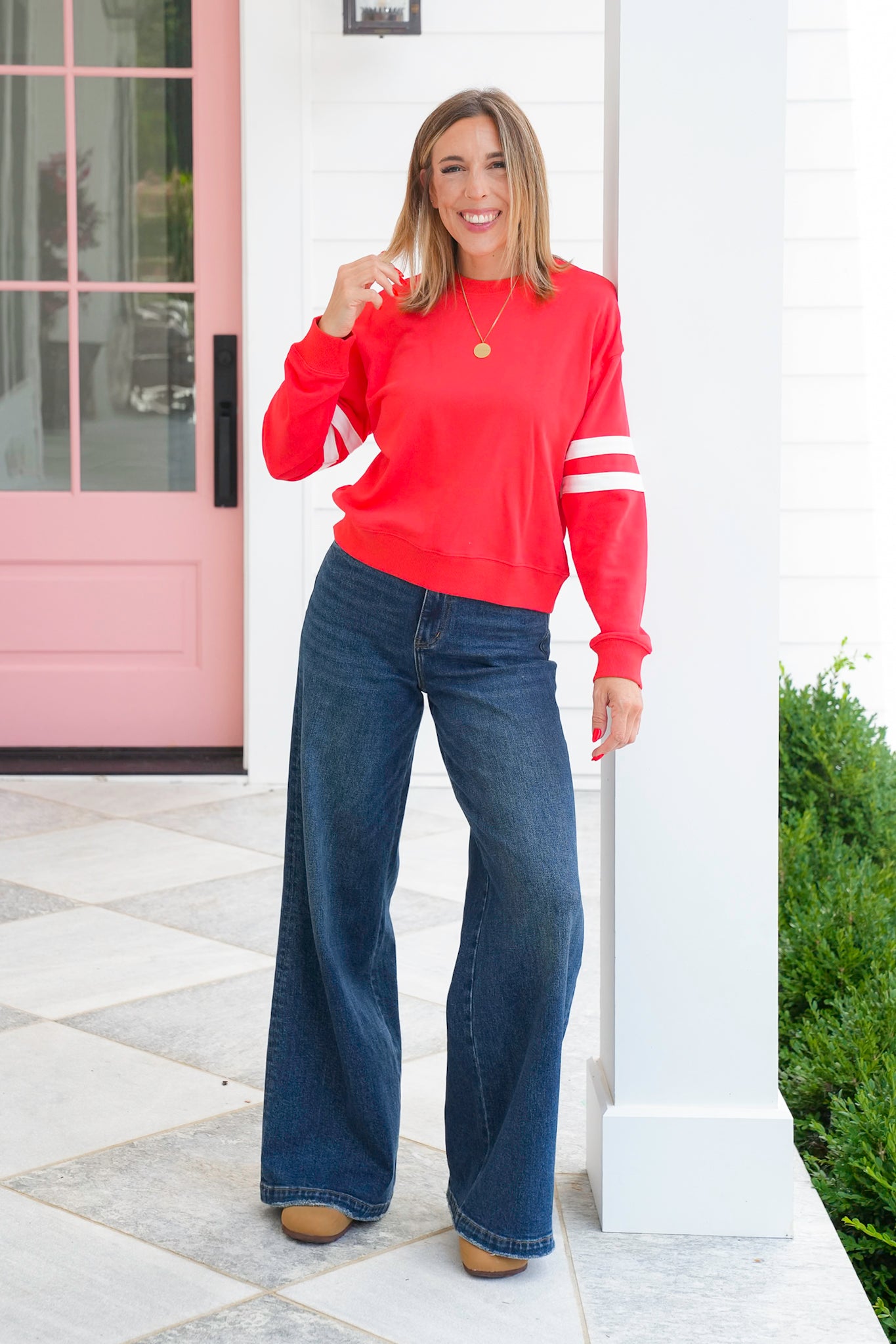 This pullover brings a playful, athletic-inspired look to your everyday lineup. The varsity stripes instantly give it that sporty-cool feel, while the soft knit keeps it wearable from lounging at home to running errands or cheering at the game. Style it with denim and sneakers for a laid-back weekend outfit, or layer it with joggers and a baseball cap for a sporty streetwear moment.