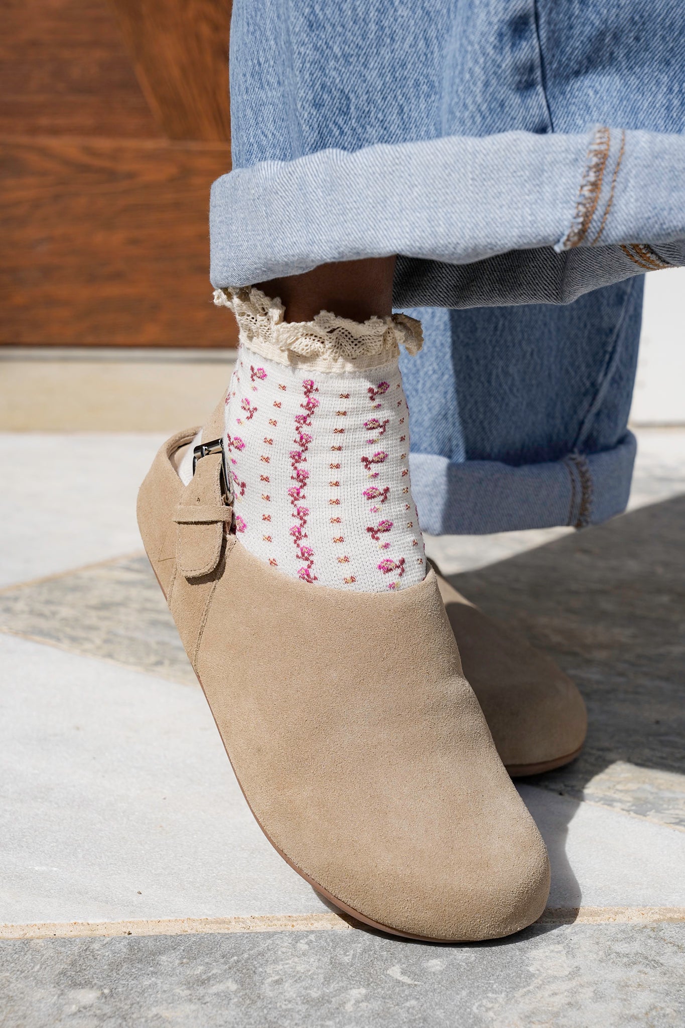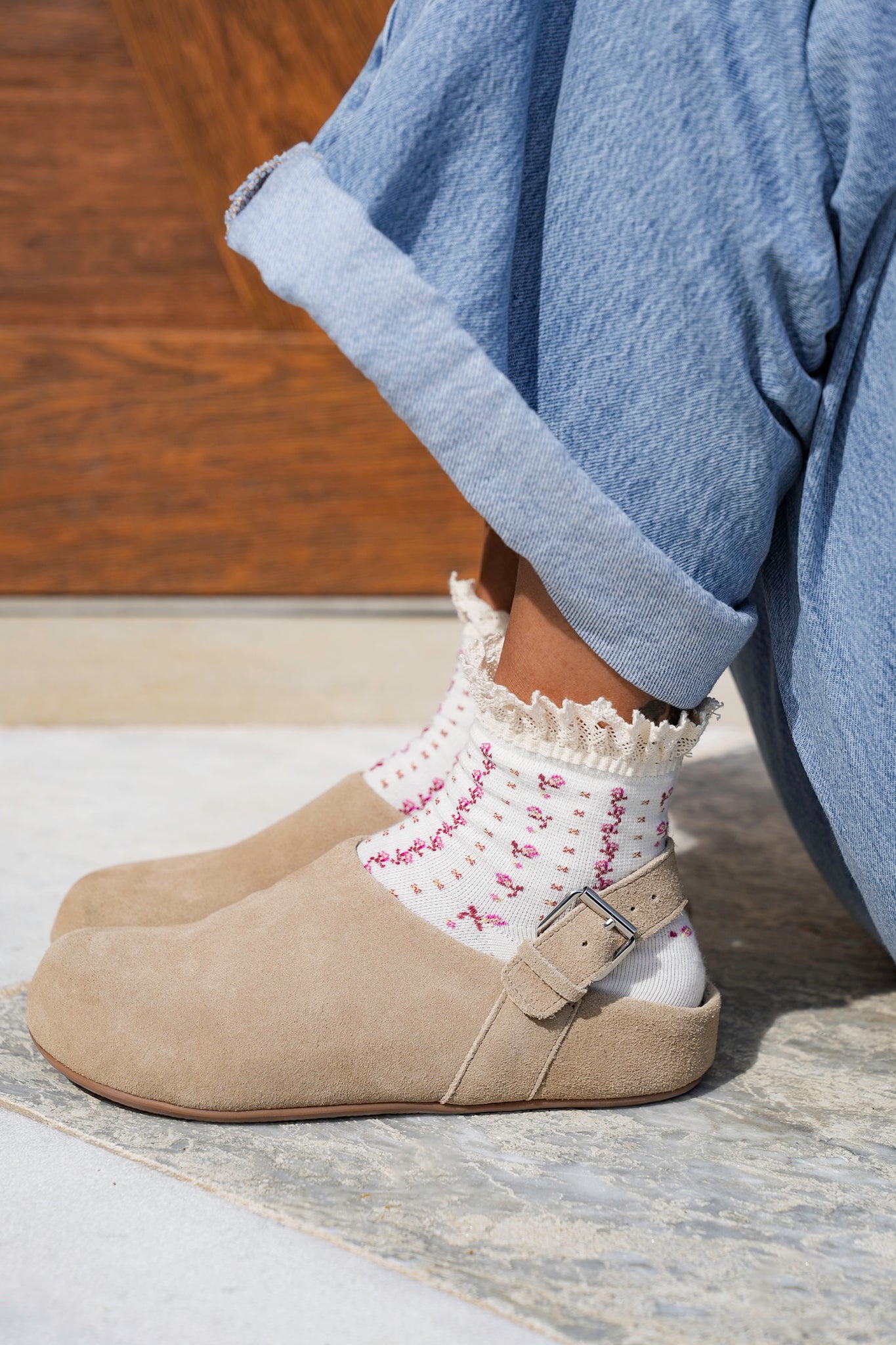 Fit: True to size fit with a comfortable footbed that supports you all day. If you’re between sizes, half sizes can go down for a more secure, snugger fit. The adjustable back strap allows for flexibility, making them easy to wear with or without socks.