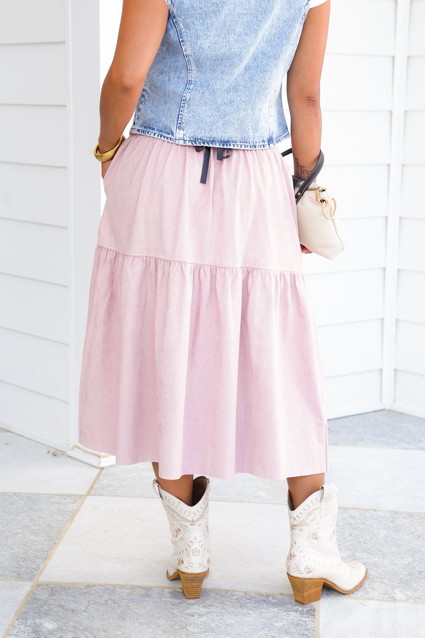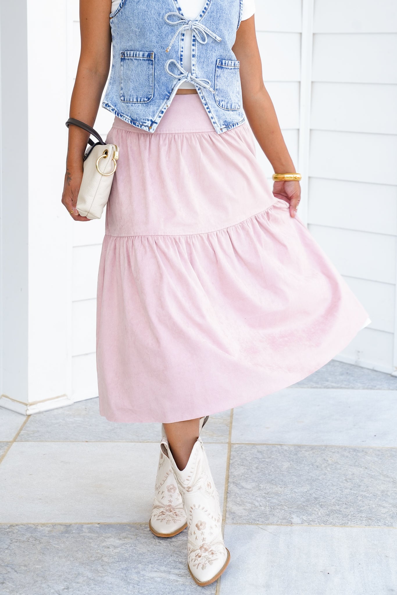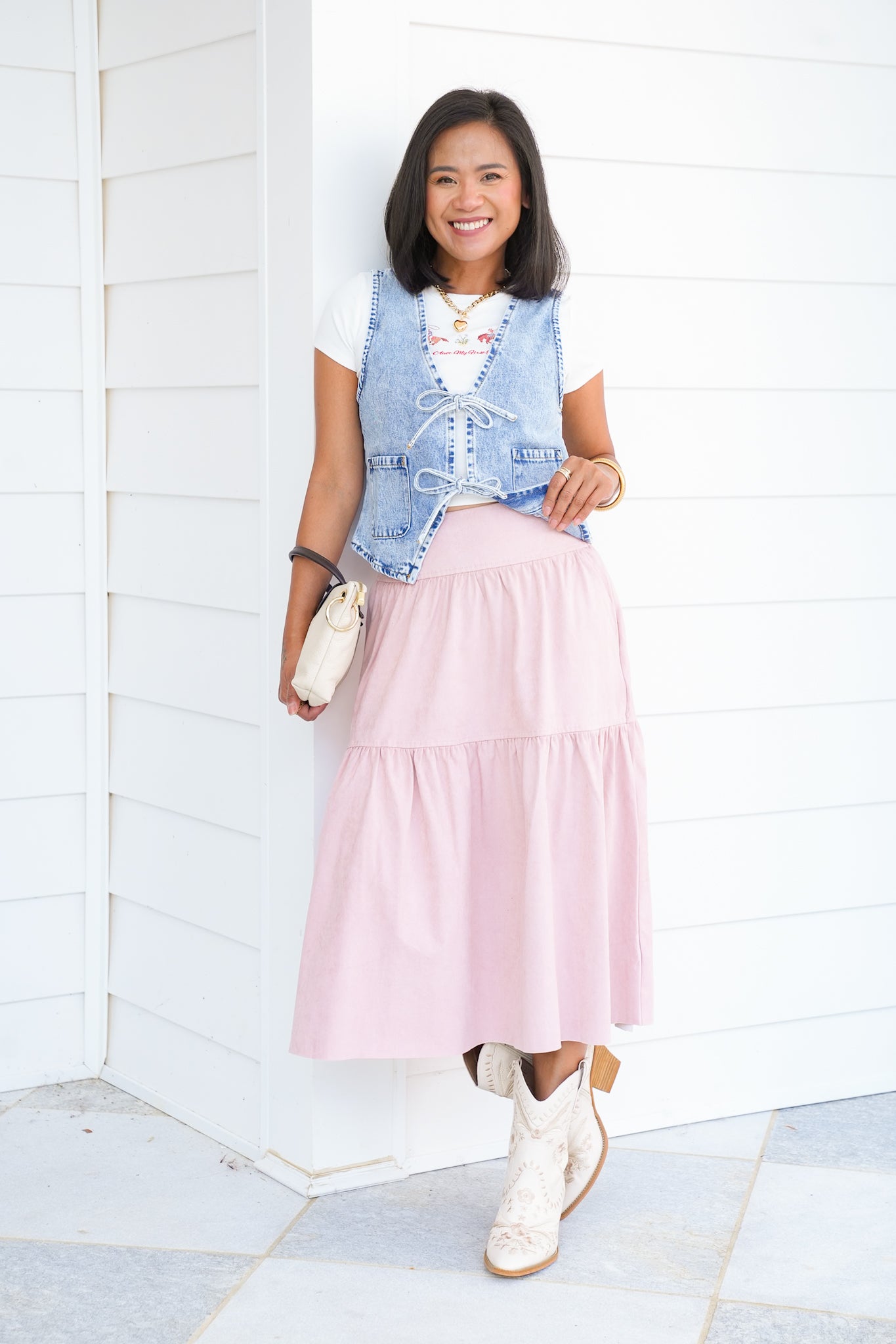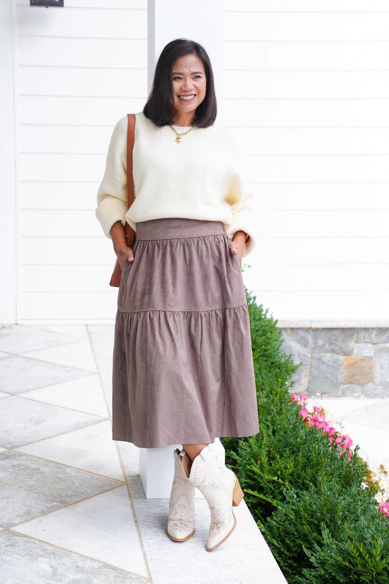 This skirt is the definition of feminine meets elevated chic. The vegan suede drapes beautifully while still feeling buttery soft, and the tiered cut creates movement that’s both playful and sophisticated.