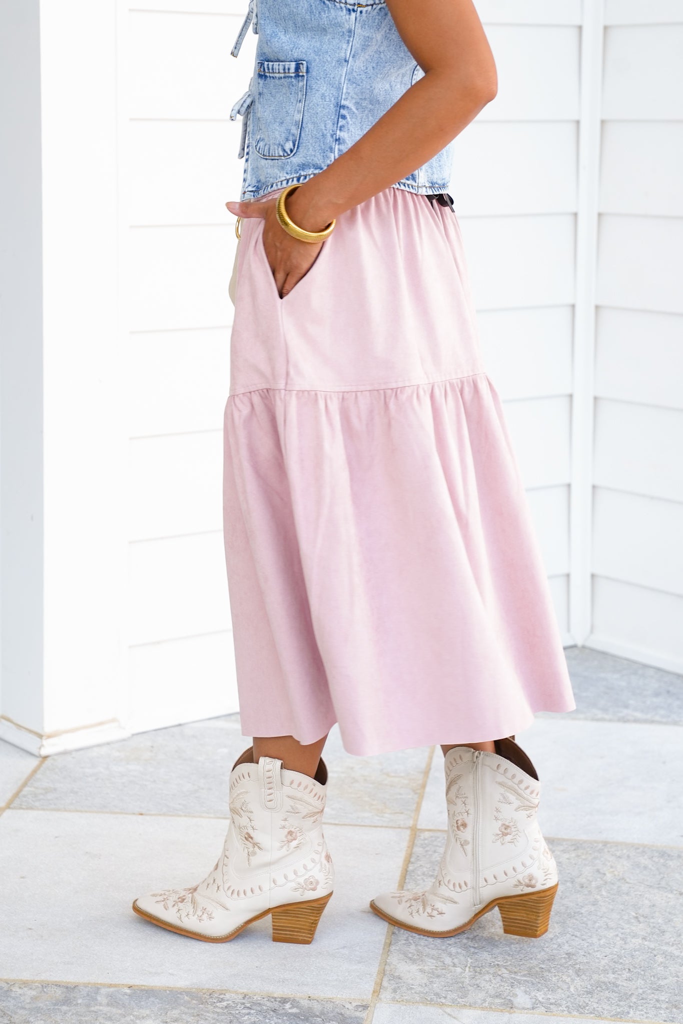 Vegan Suede Tiered Midi Skirt with Lace Detail