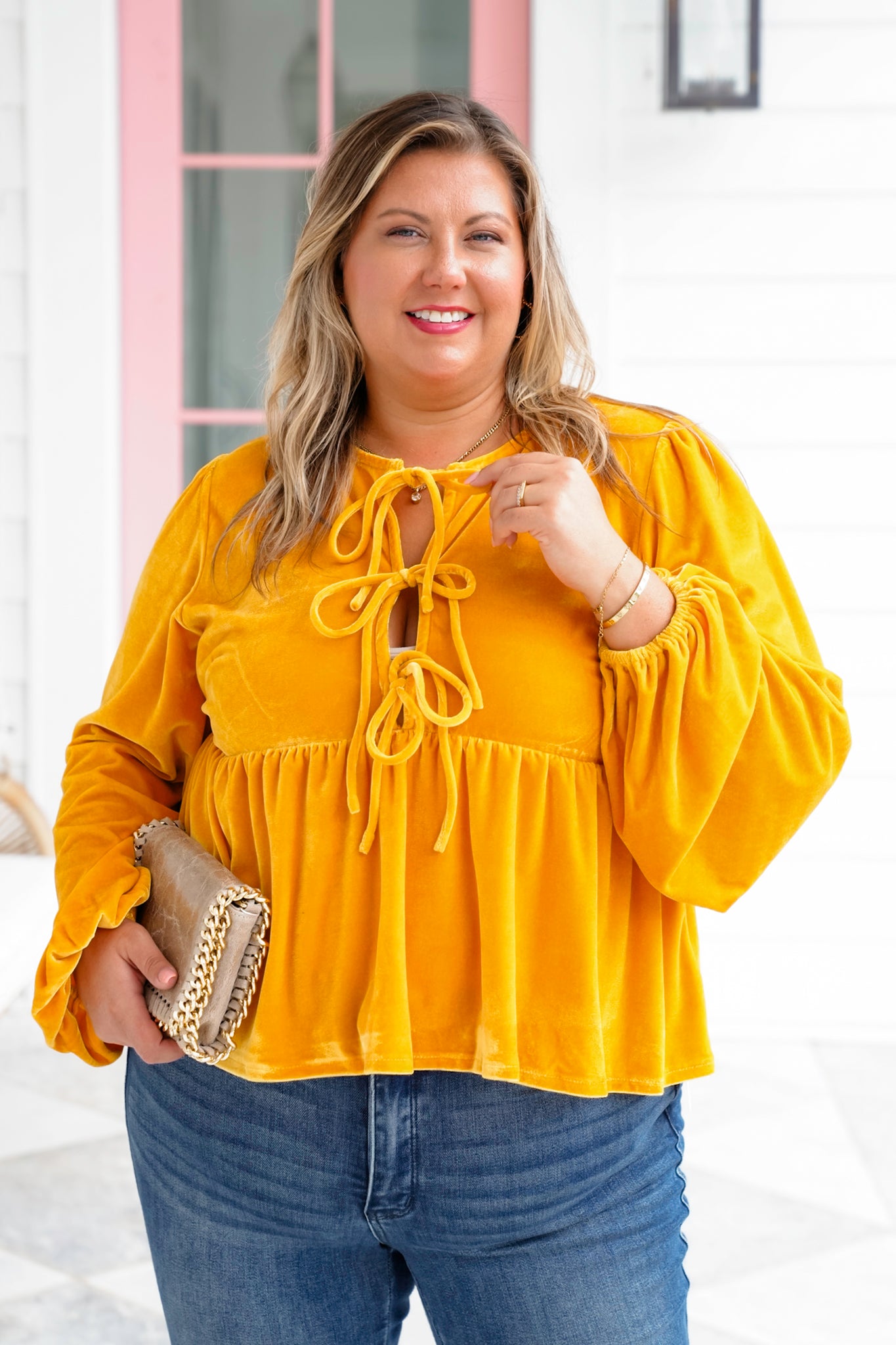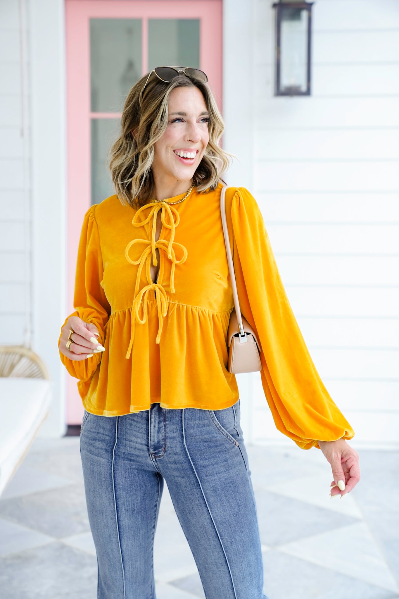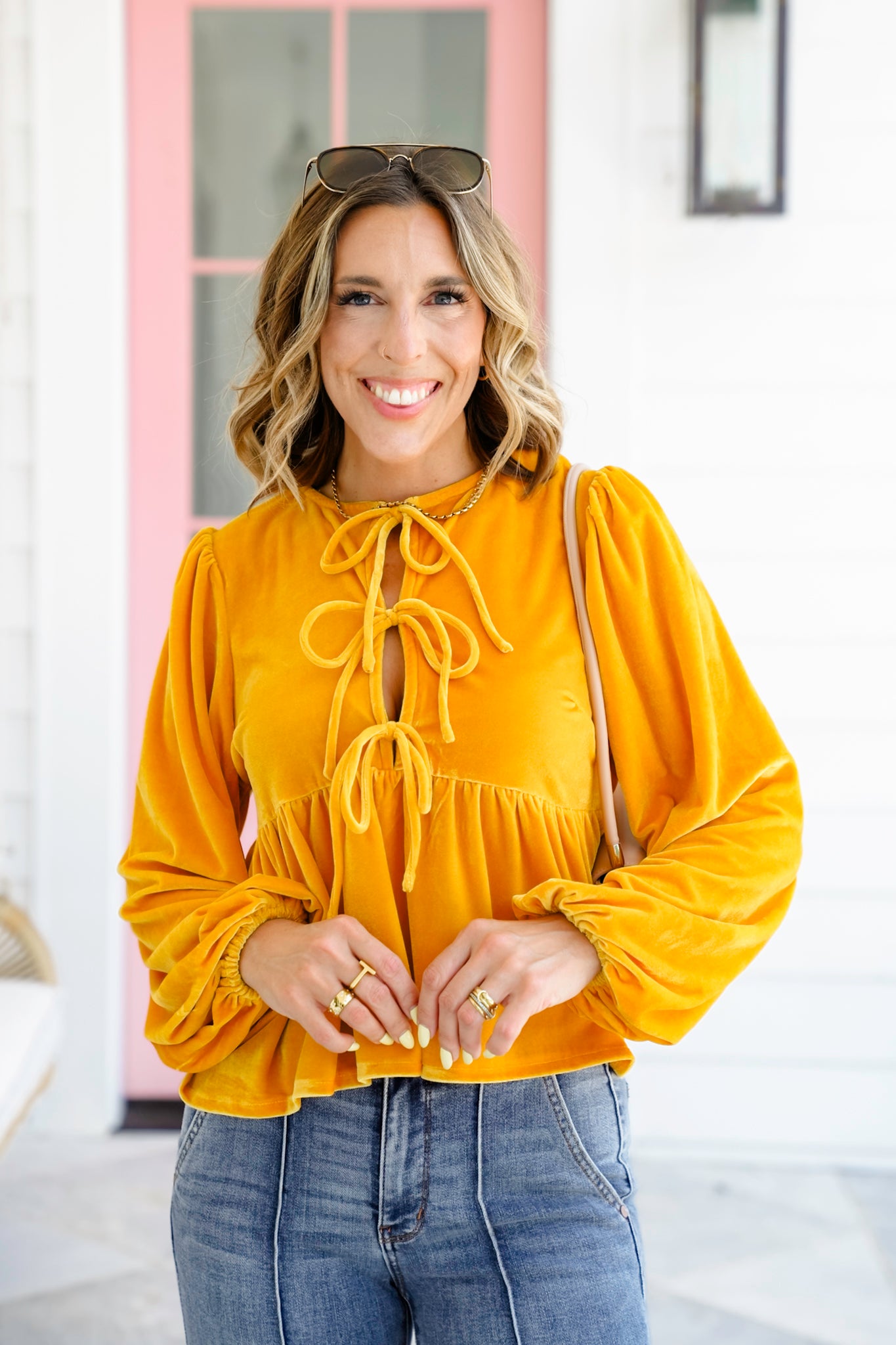 This velvet balloon sleeve top is a statement-maker, with its rich color and luxe, soft feel. The babydoll silhouette gives it a playful and flattering shape, while the functional front tie closures add a charming, boho touch. Billowy balloon sleeves bring a hint of drama, making it perfect for everything from a casual coffee date to a festive night out.