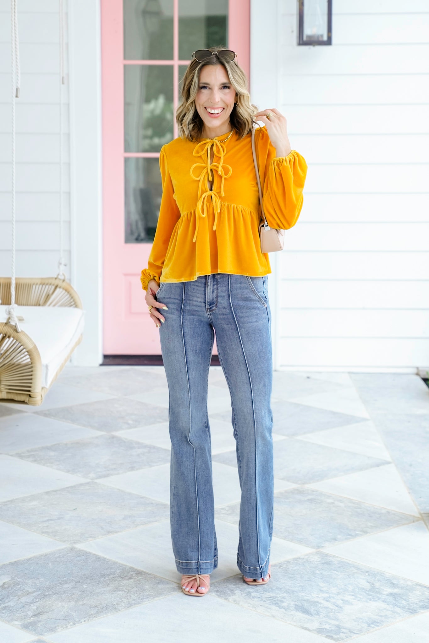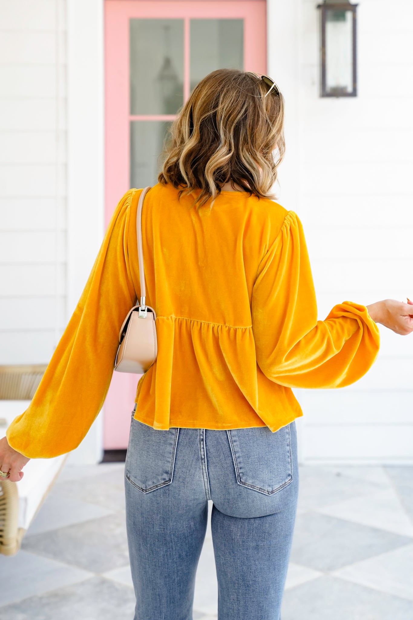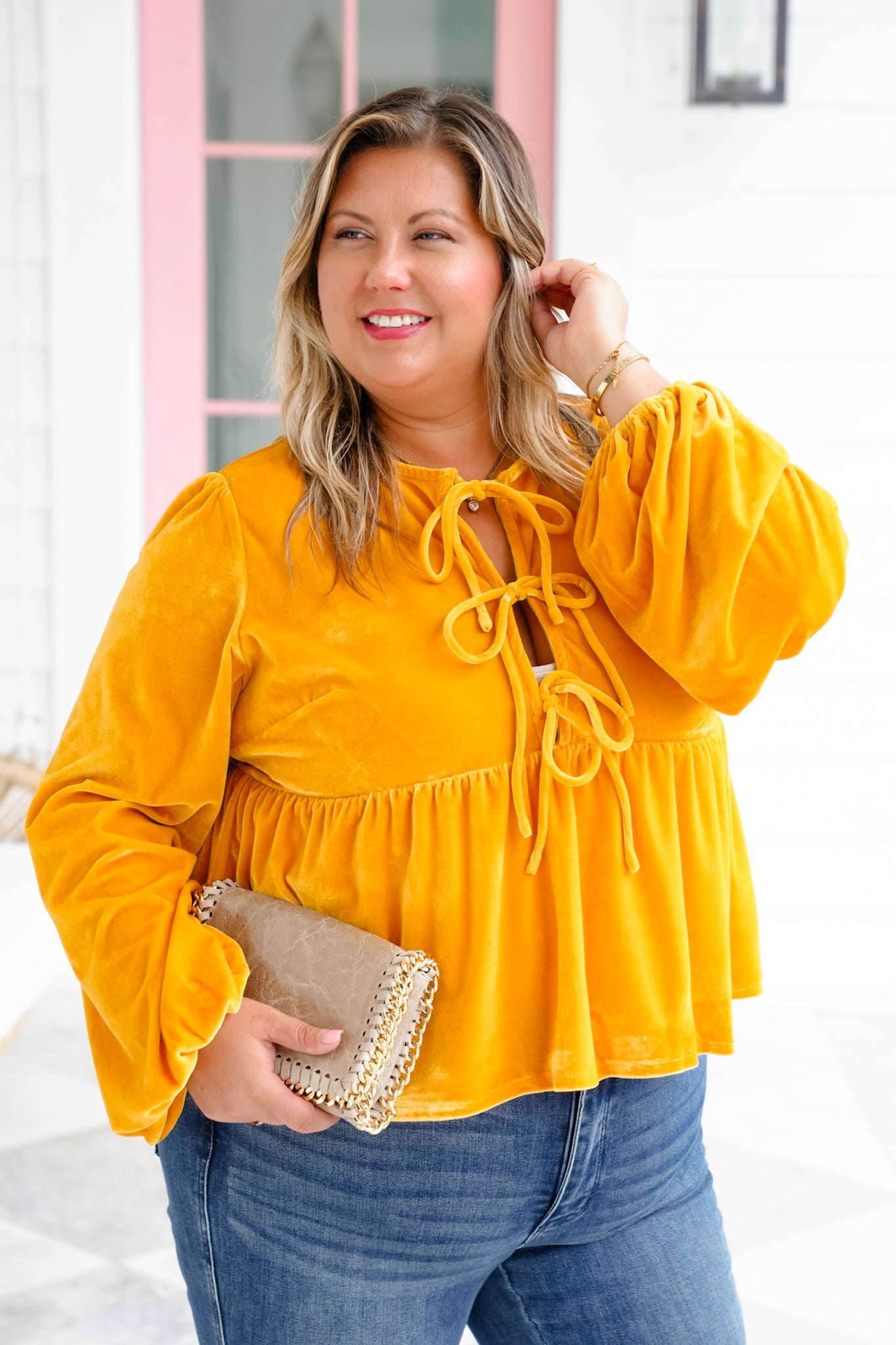This velvet balloon sleeve top is a statement-maker, with its rich color and luxe, soft feel. The babydoll silhouette gives it a playful and flattering shape, while the functional front tie closures add a charming, boho touch. Billowy balloon sleeves bring a hint of drama, making it perfect for everything from a casual coffee date to a festive night out.
