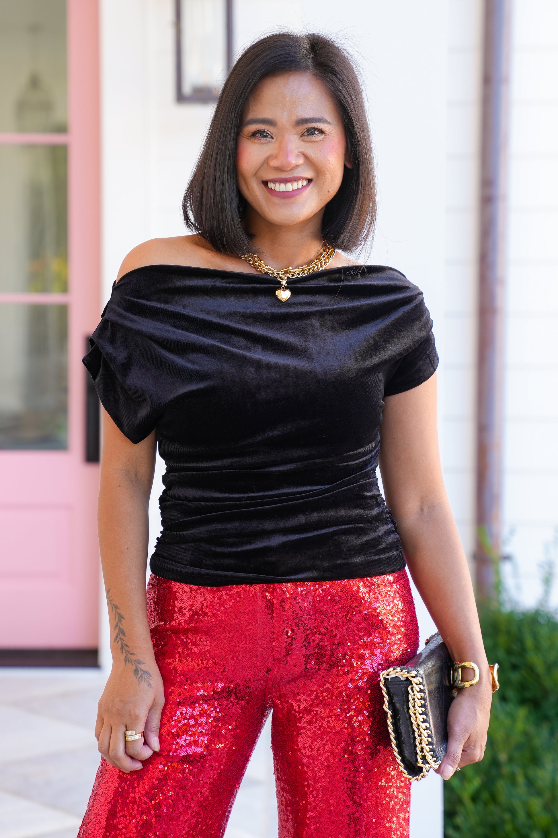 All eyes on you! This ruched velvet top brings the glam factor with its soft, shimmery texture and flattering gathered silhouette. The neckline can be worn off one shoulder or across both for two stunning looks. Pair it with sequin pants or sleek denim for a show-stopping outfit that feels as amazing as it looks.