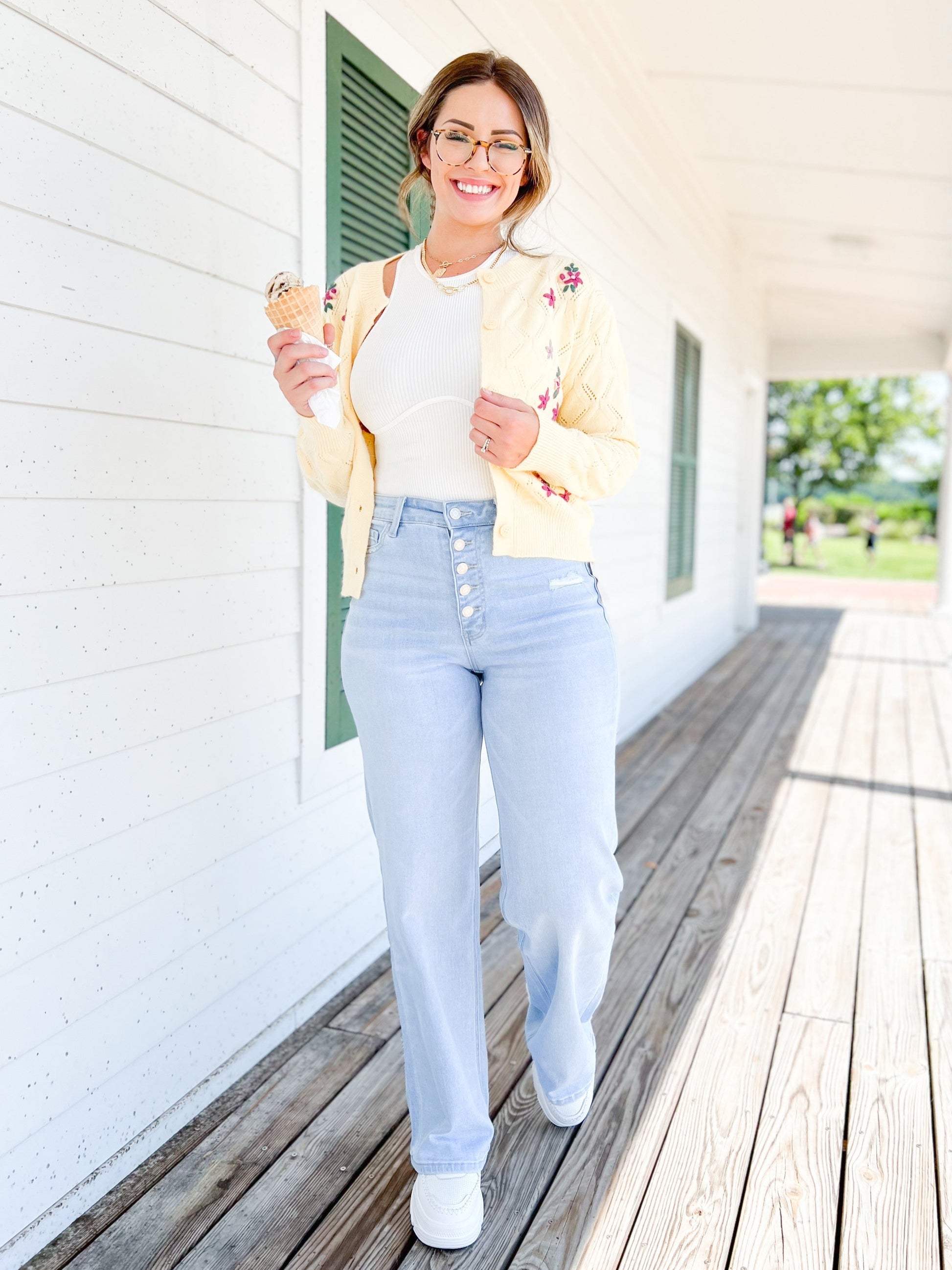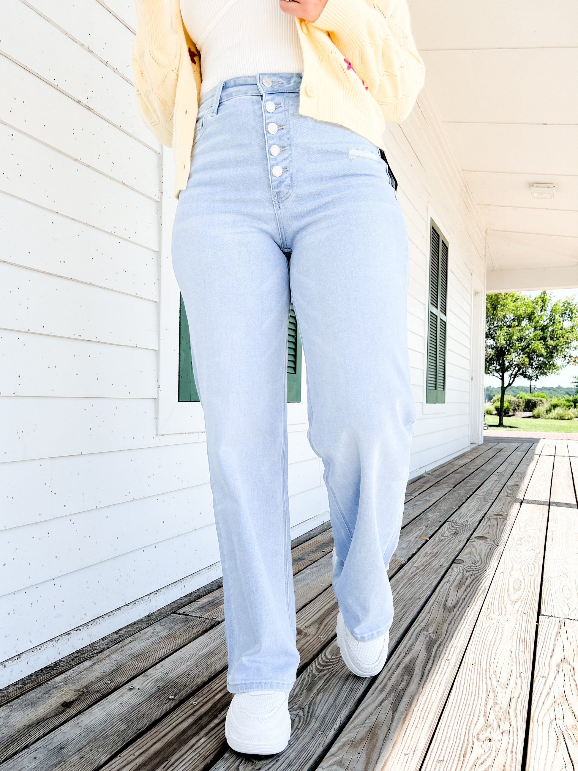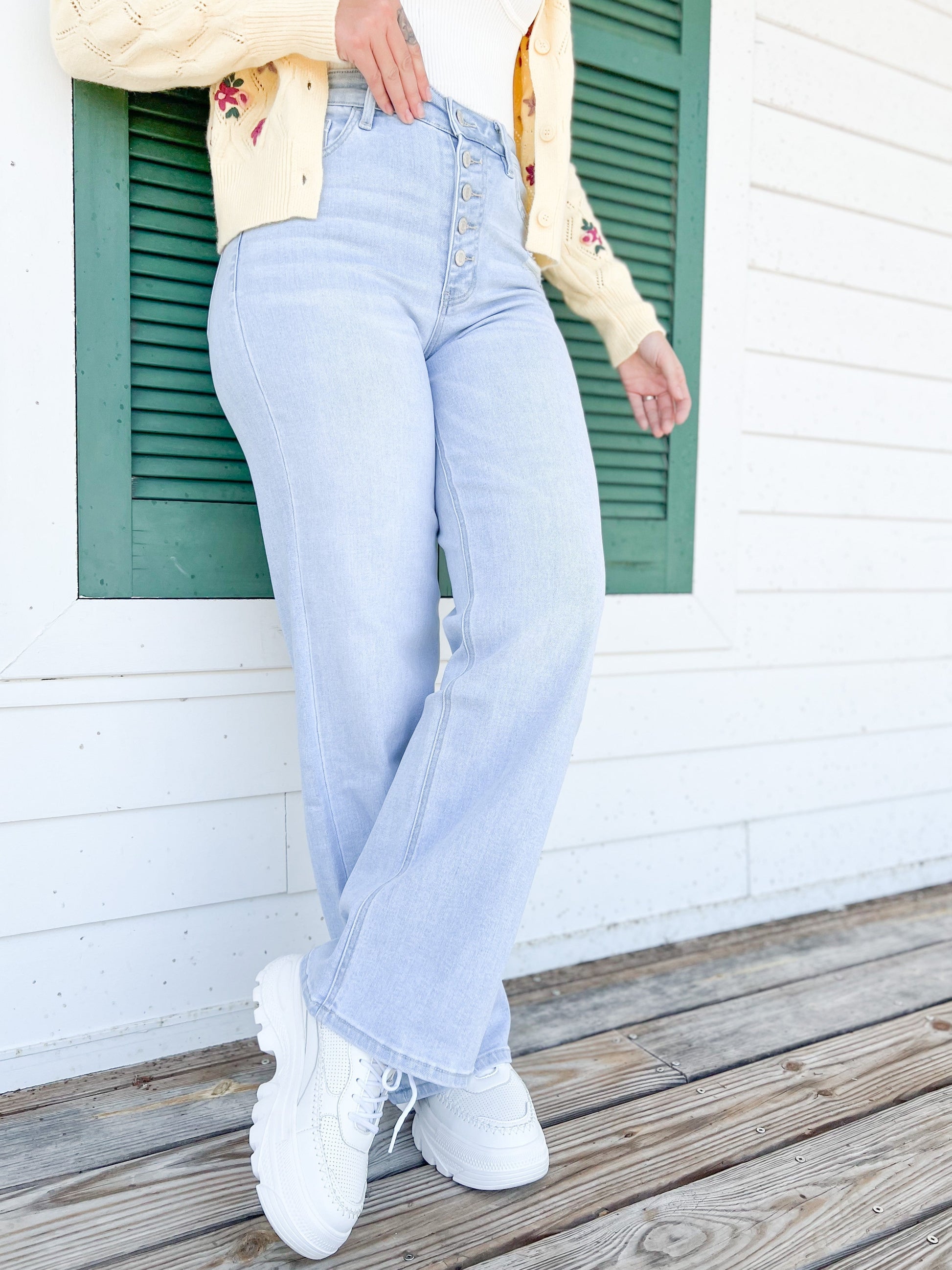 This pair of jeans are straight out of the 90s y'all! They give you legs a mile long with a wide leg cut and high rise waist, complete with a button fly. They've got barely there distressing and a gorgeous light wash that gives any outfit a vintage style. Pair them with a flowy blouse or a boho cardigan for the perfect outfit!