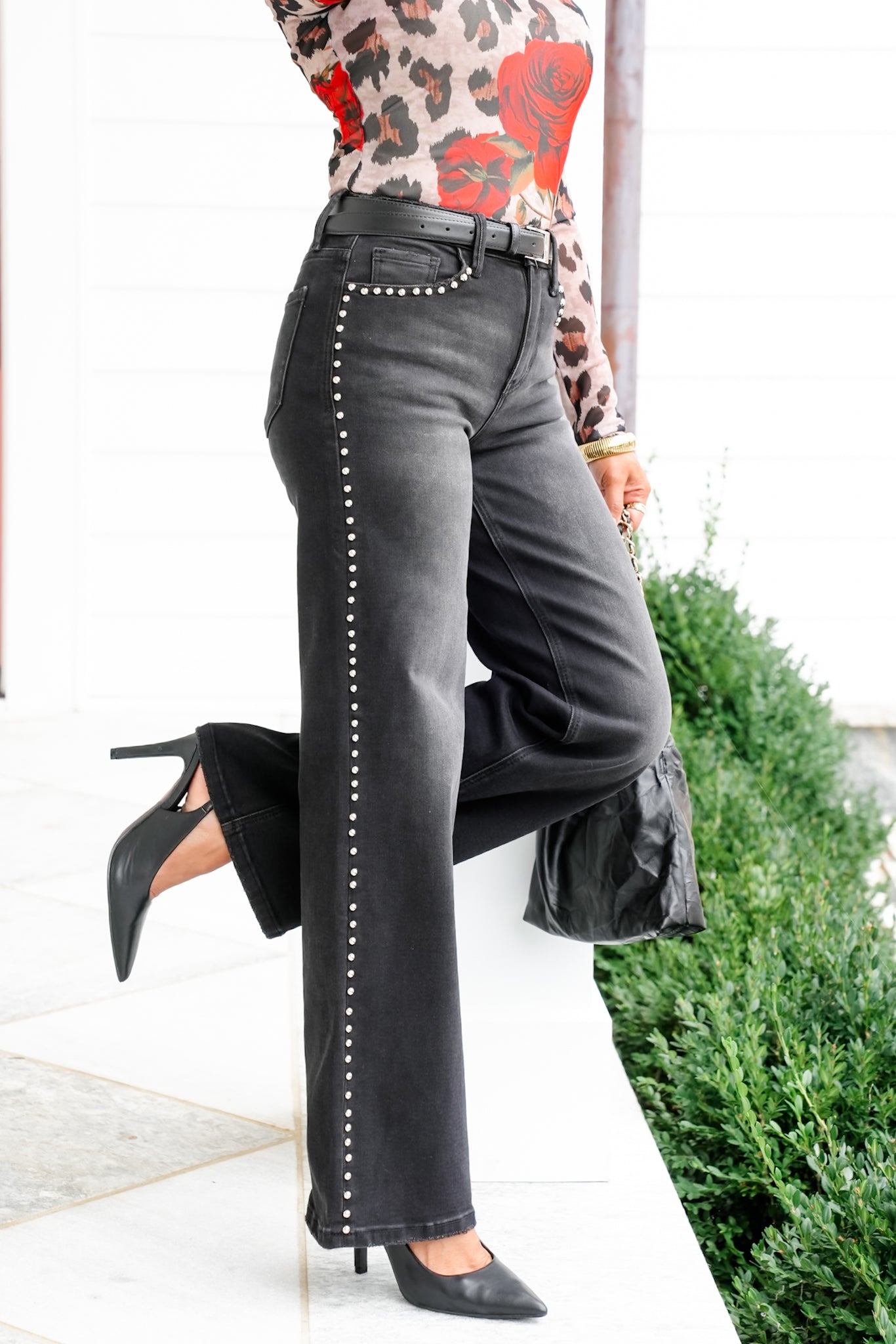These jeans are made to stand out in the best way possible. The high rise waist gives a figure-flattering base, while the stud detailing instantly elevates your denim game. The wide leg drape keeps things modern and chic, and the black wash makes them endlessly versatile.