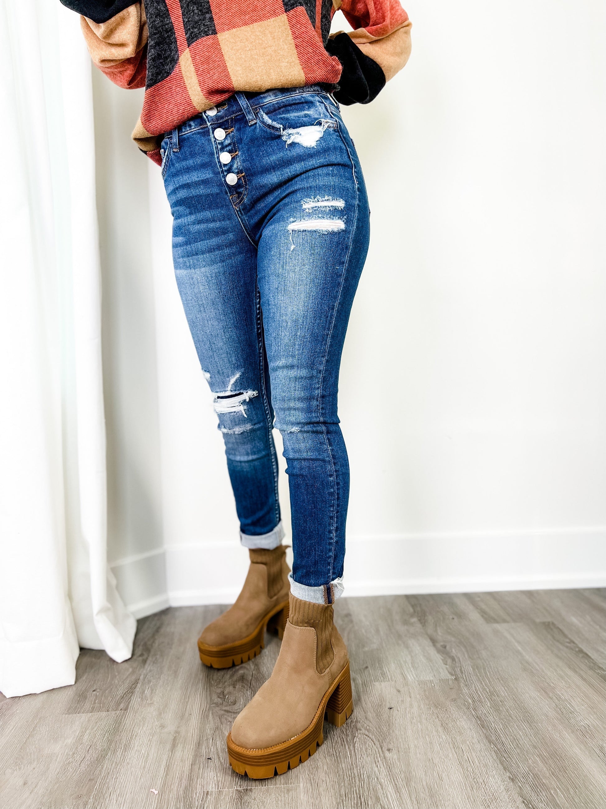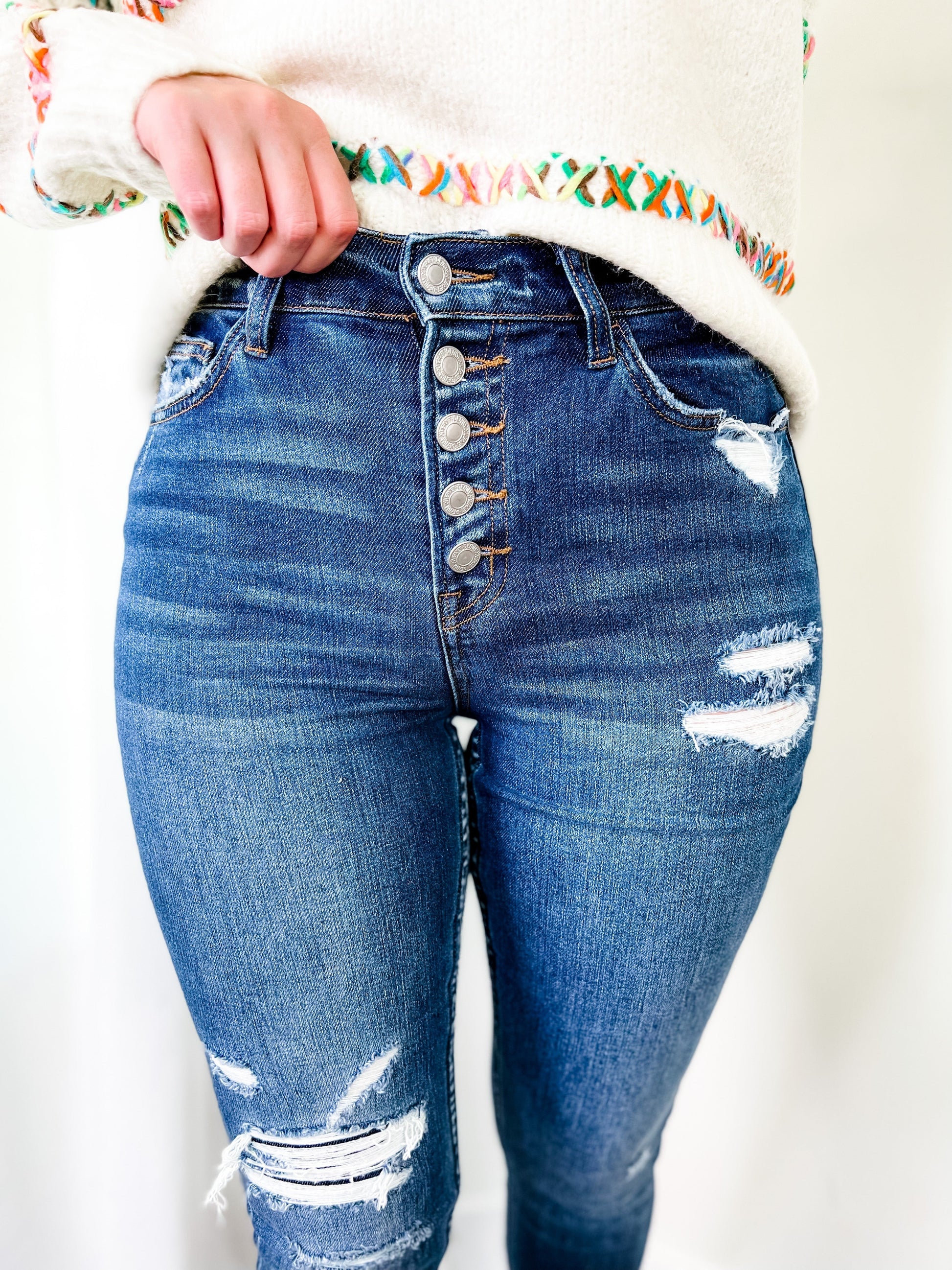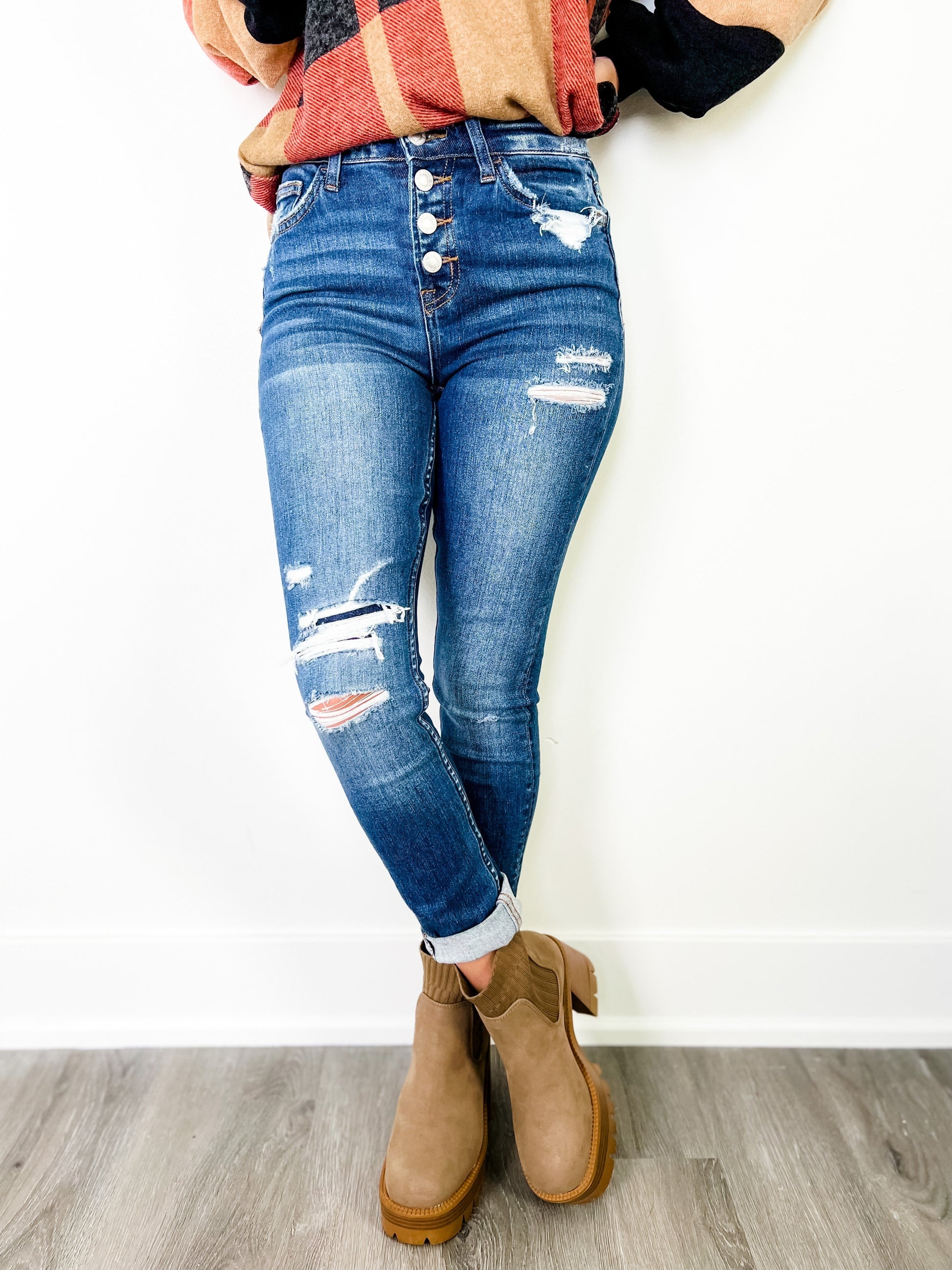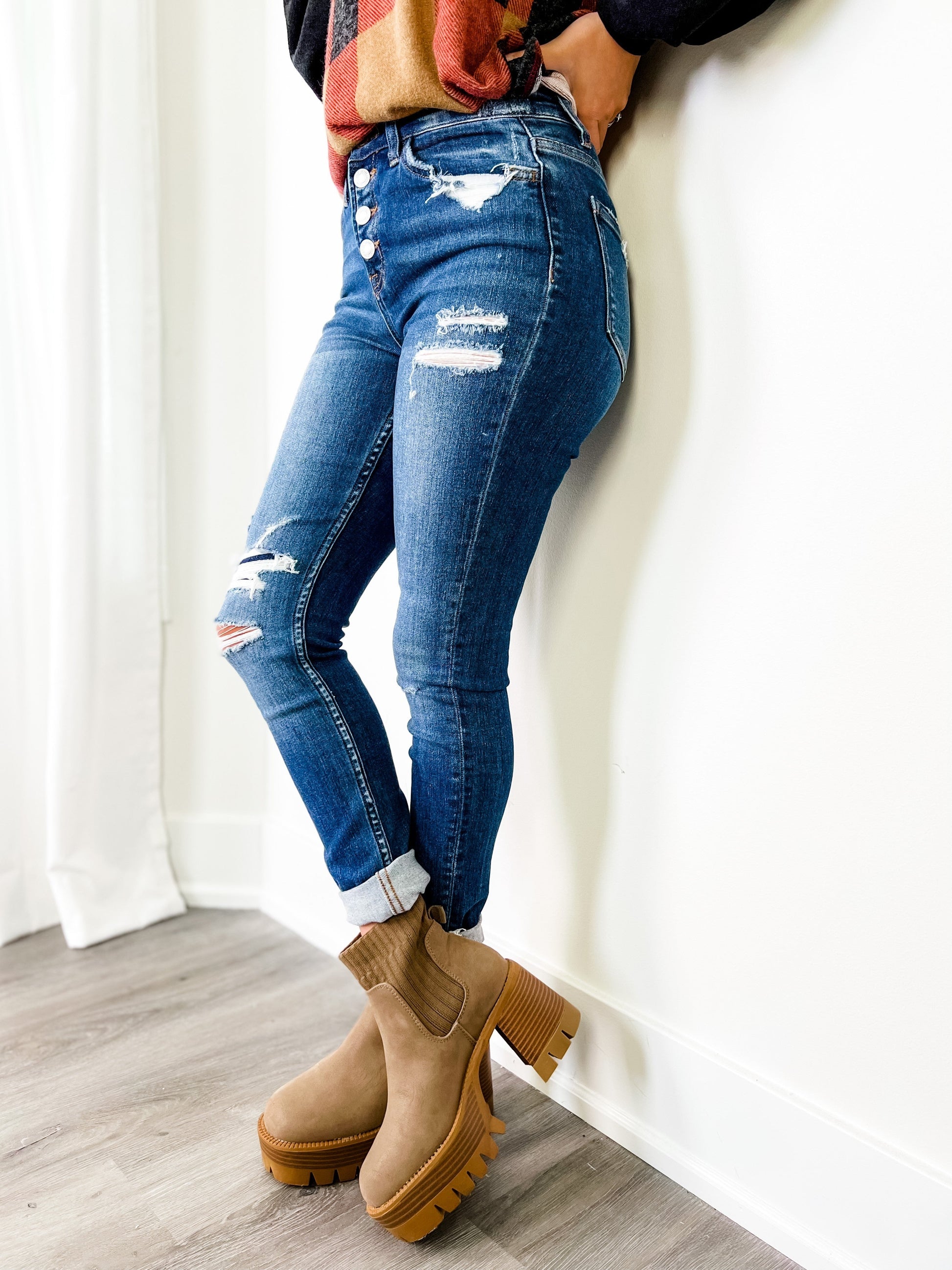 These skinnies by Vervet come to you with a gorgeous two-toned wash and distressed details throughout, including a patch detail at one of the openings. They give everyone who wears them an ultra-flattering figure due to their button-fly waist and high-rise cut. You can dress them up with a blouse or blazer or keep it casual with a tee shirt y'all!
