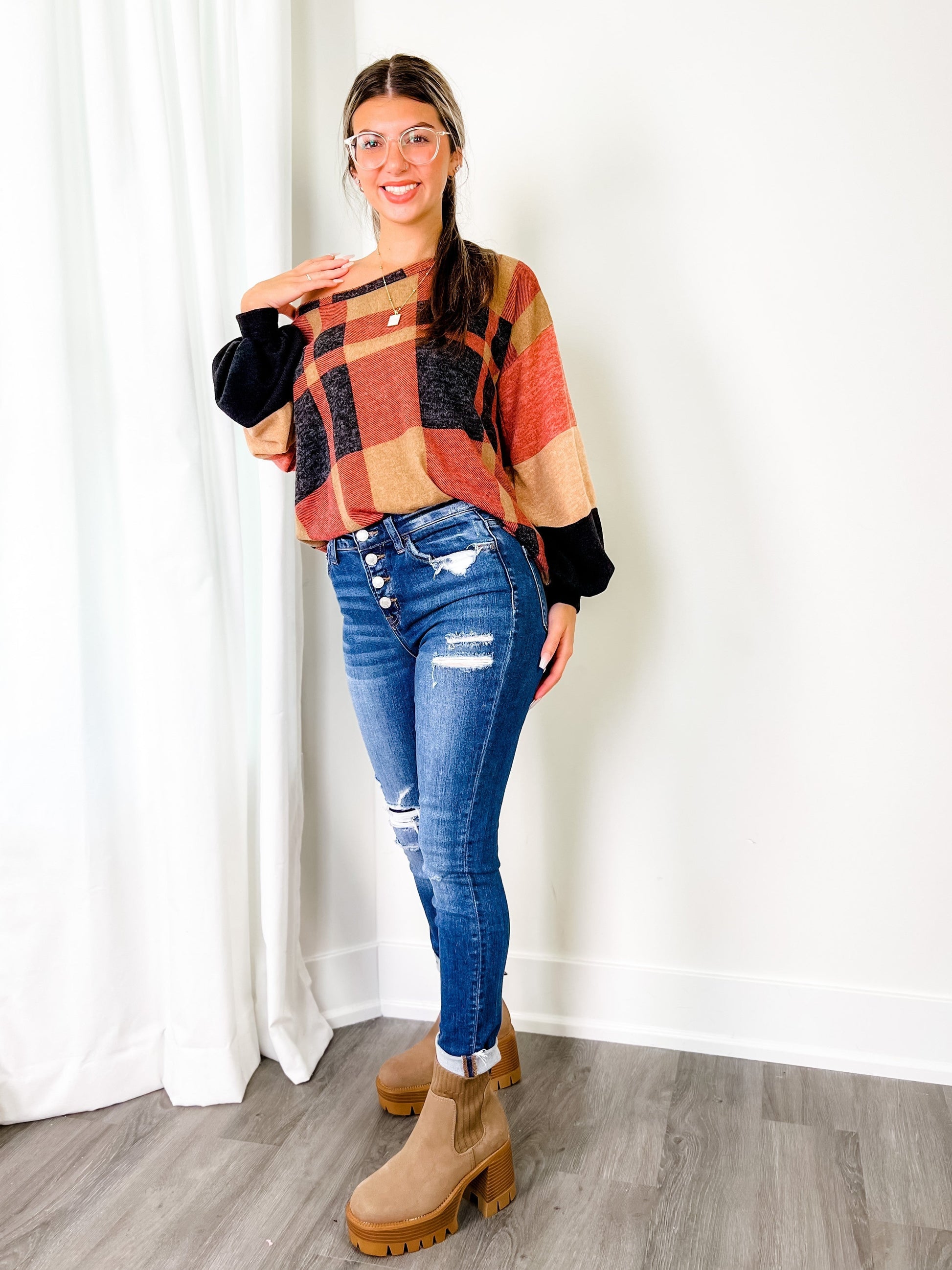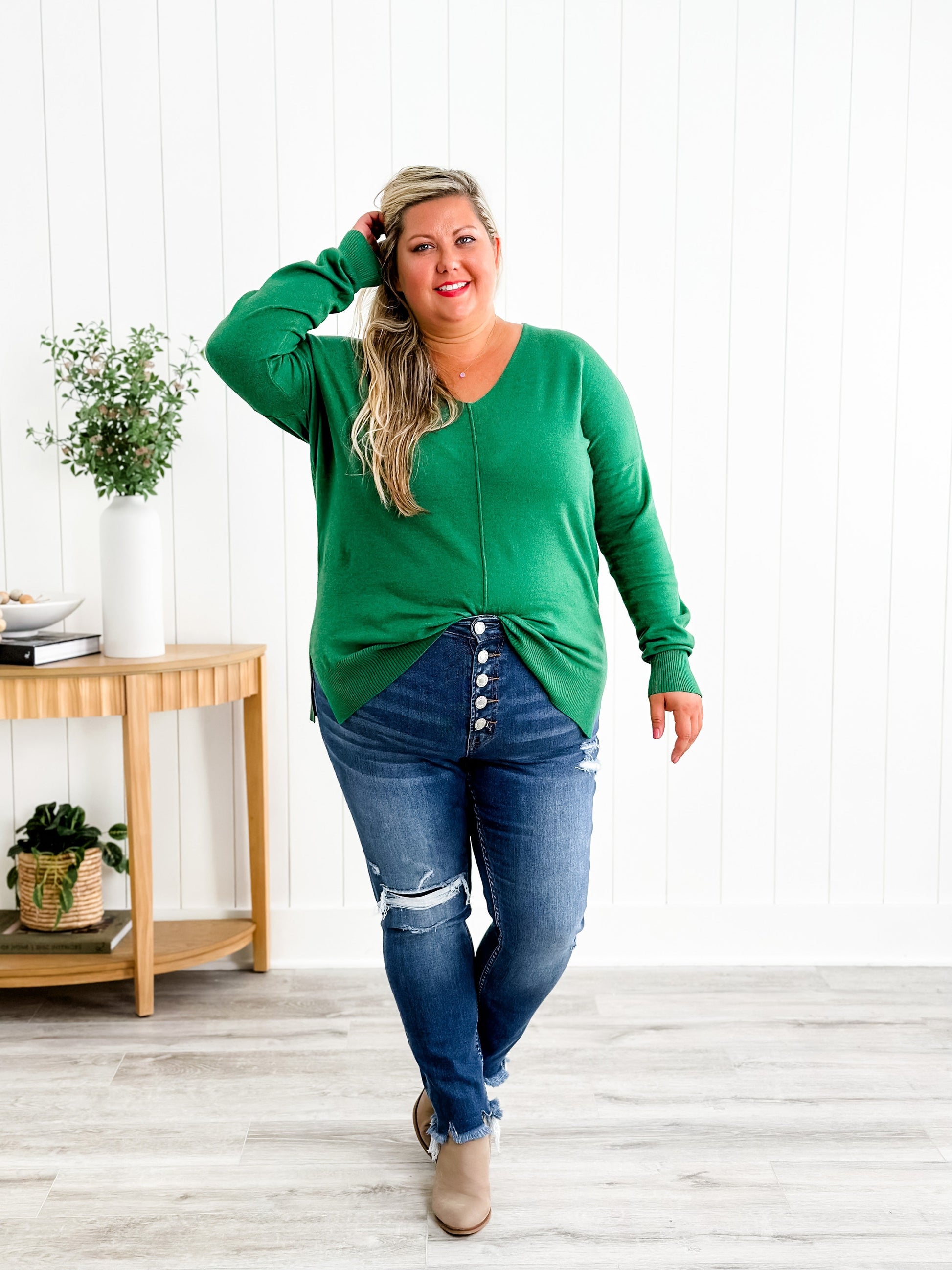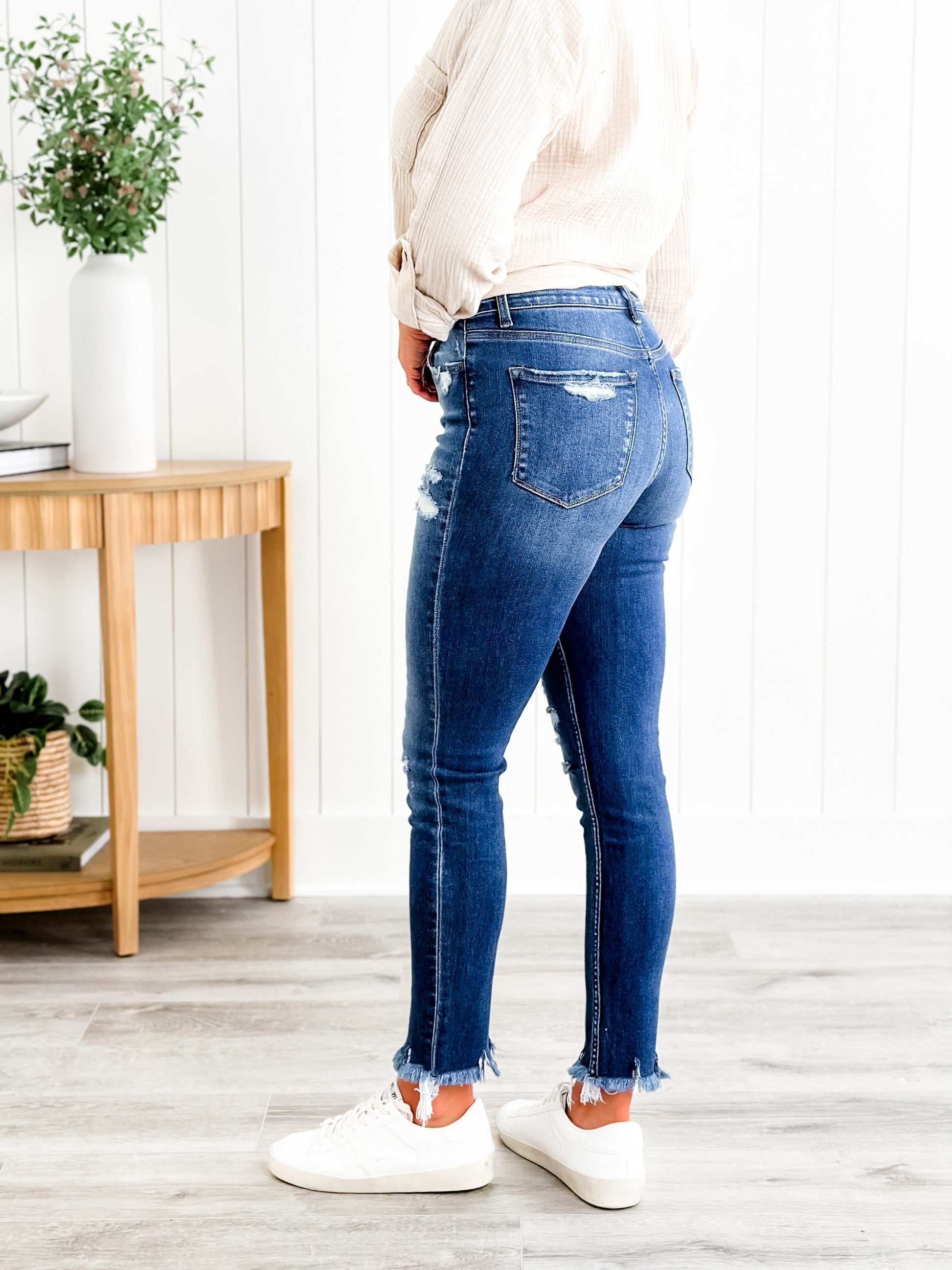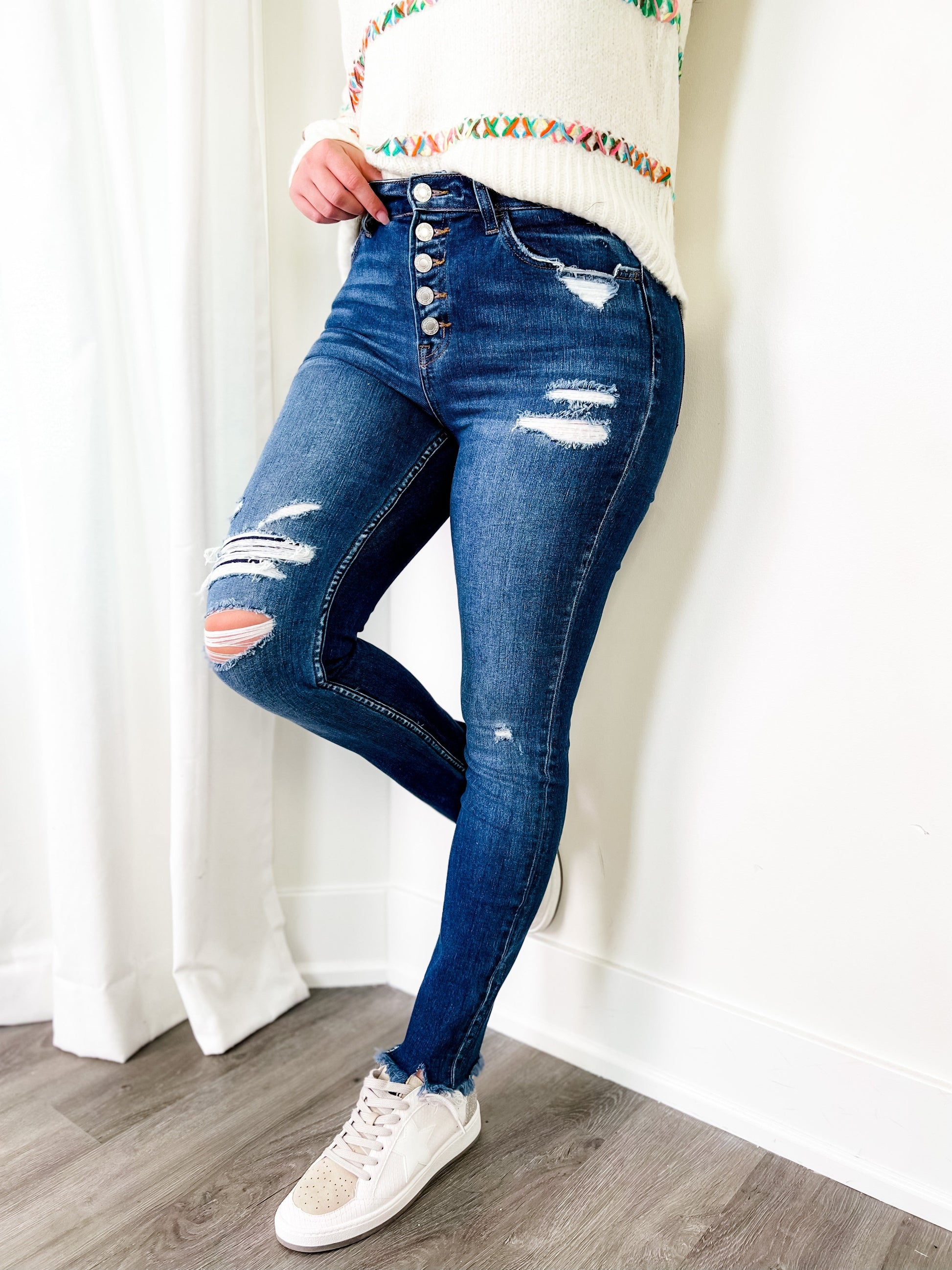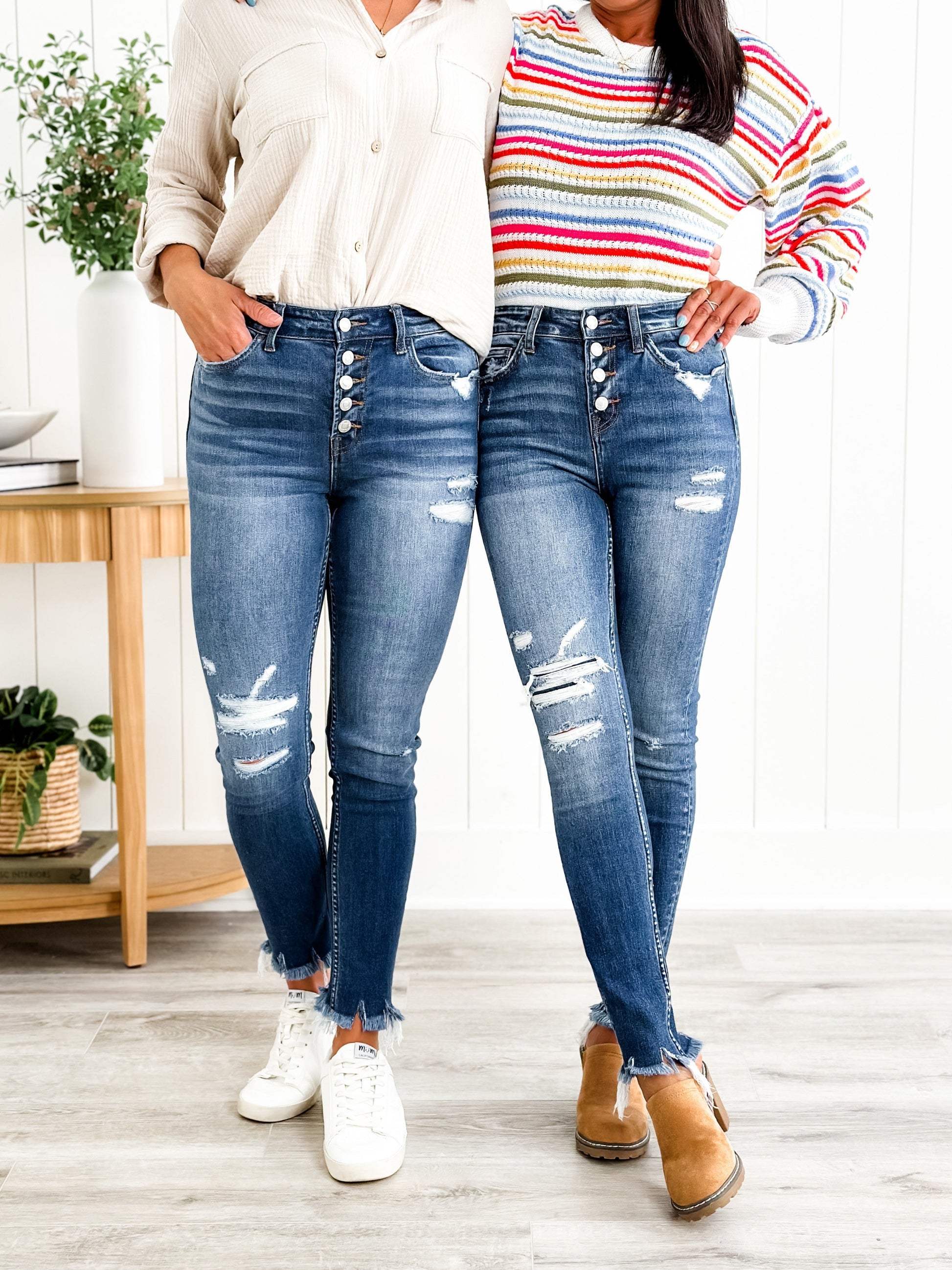 These skinnies by Vervet come to you with a gorgeous two-toned wash and distressed details throughout, including a patch detail at one of the openings. They give everyone who wears them an ultra-flattering figure due to their button-fly waist and high-rise cut. You can dress them up with a blouse or blazer or keep it casual with a tee shirt y'all!