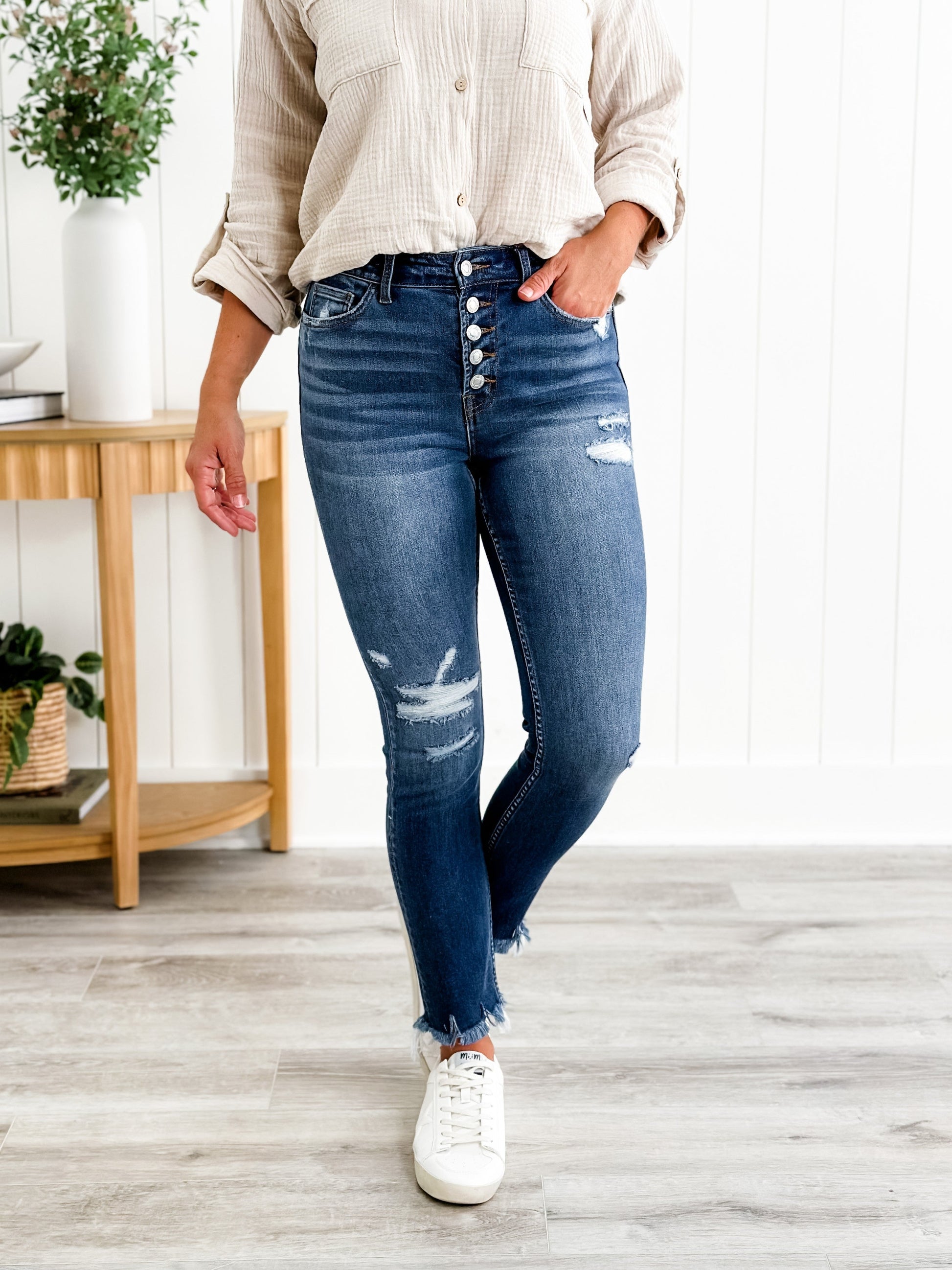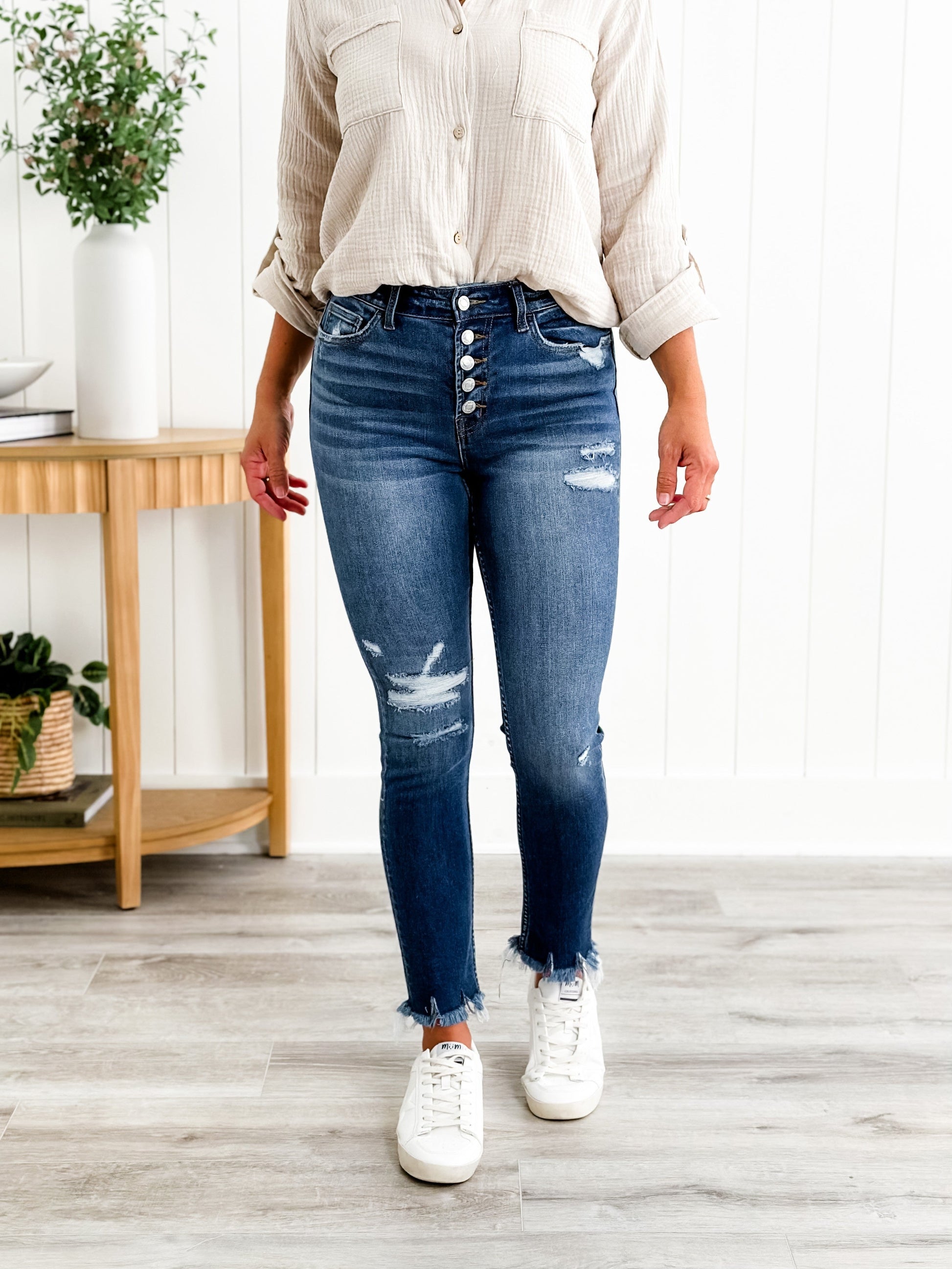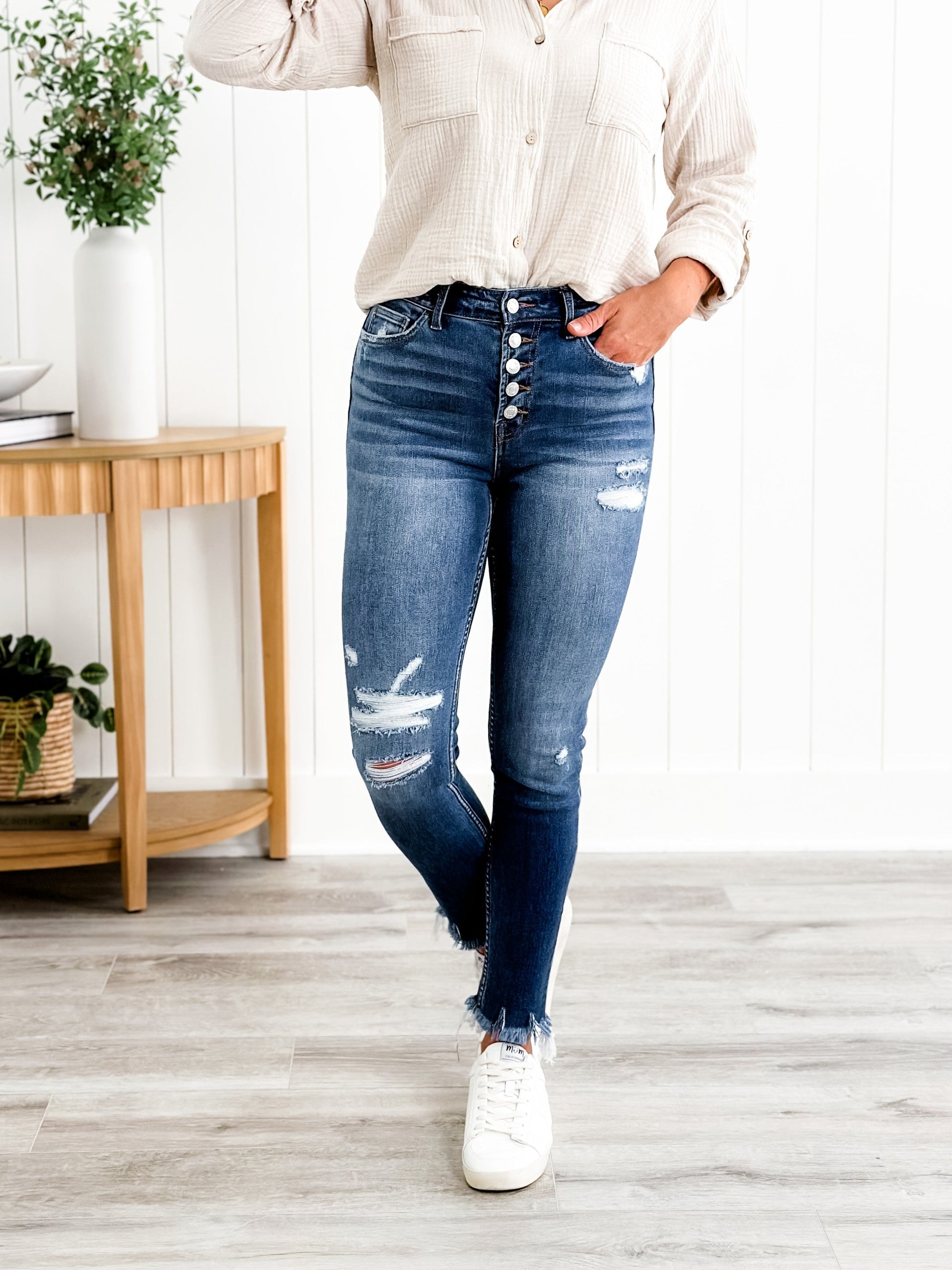 Vervet Parkside Medium Wash Distressed Button Down Skinny Jeans with Raw Ankle Hem