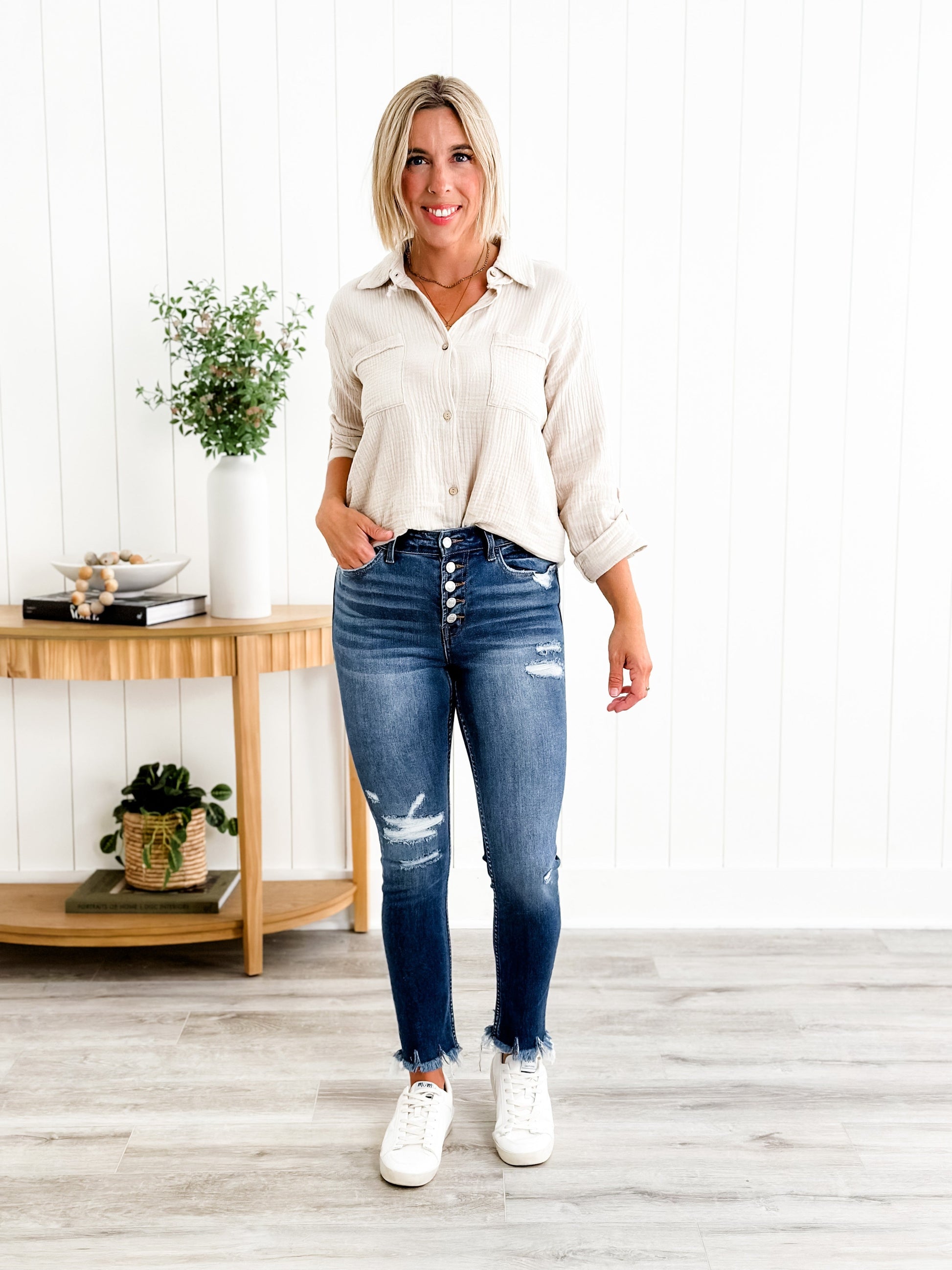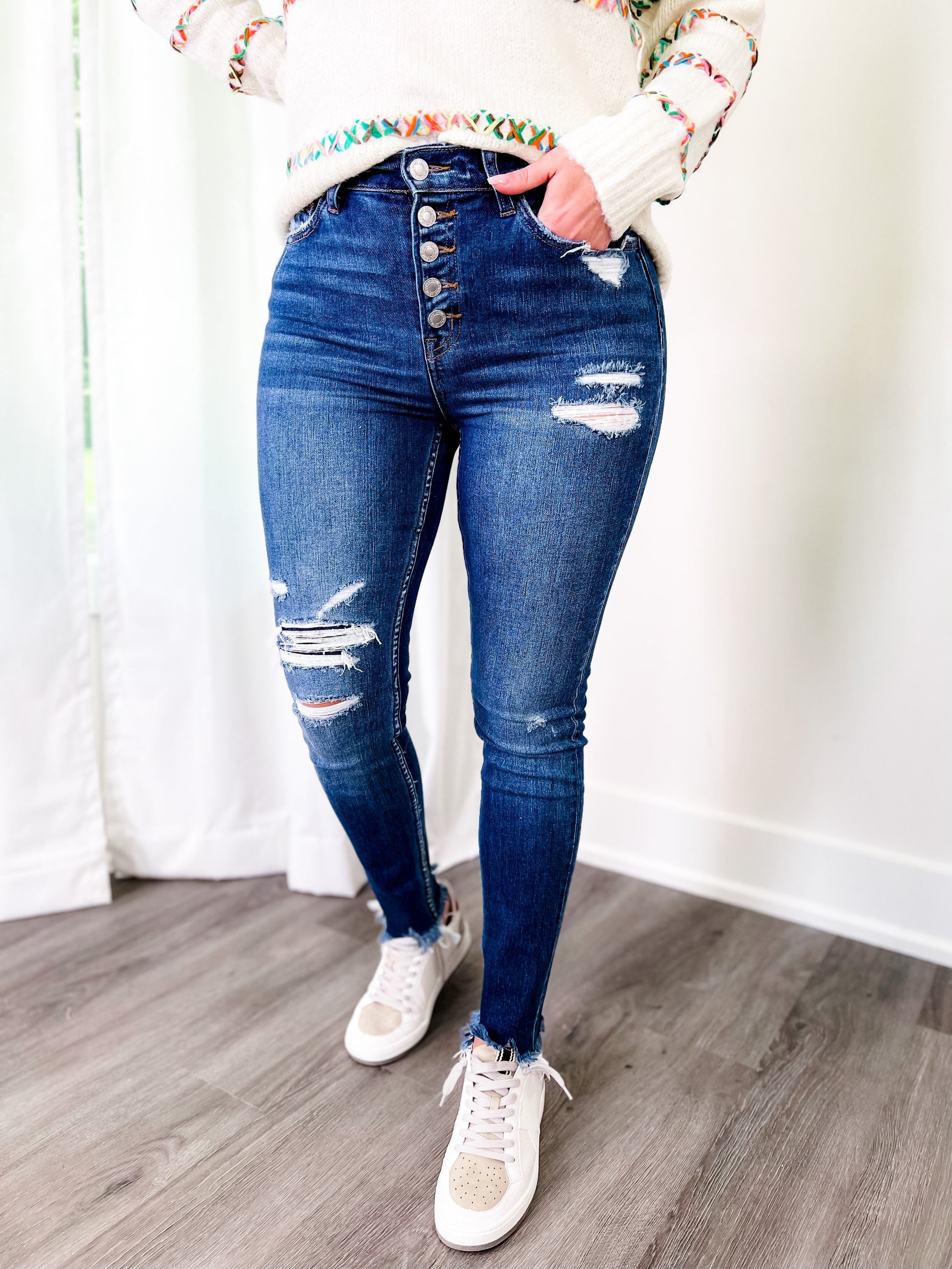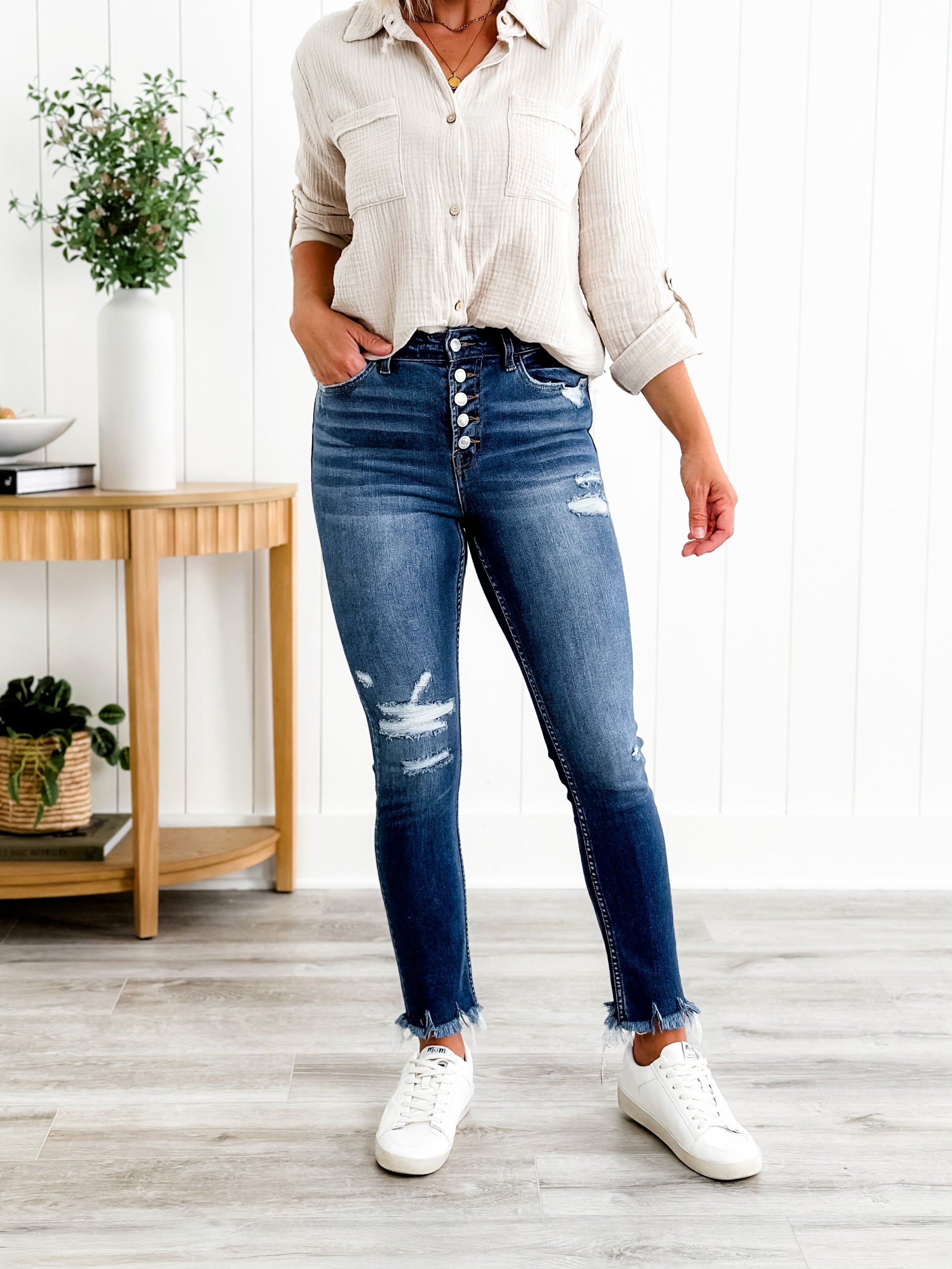 Vervet Parkside Medium Wash Distressed Button Down Skinny Jeans with Raw Ankle Hem