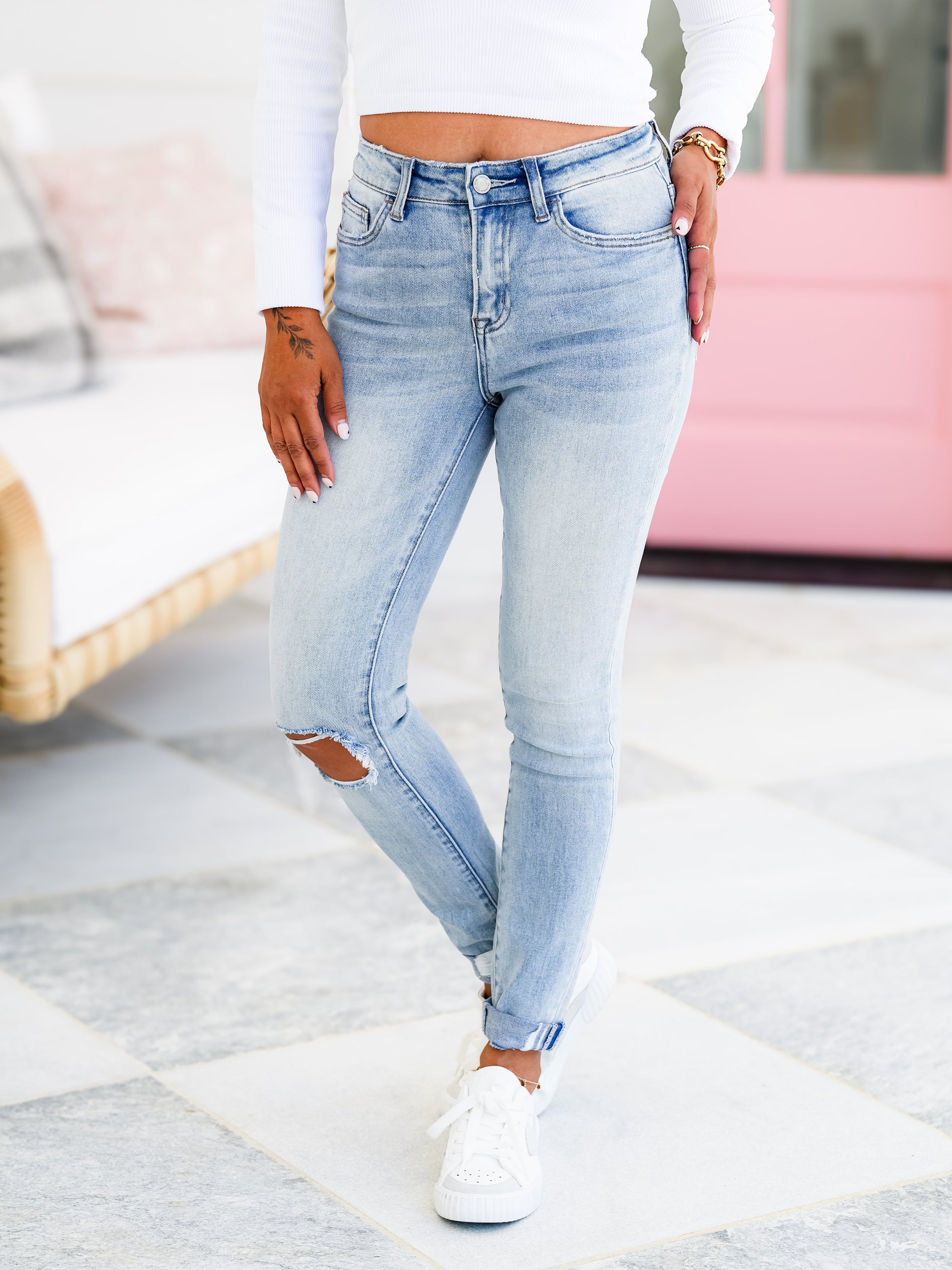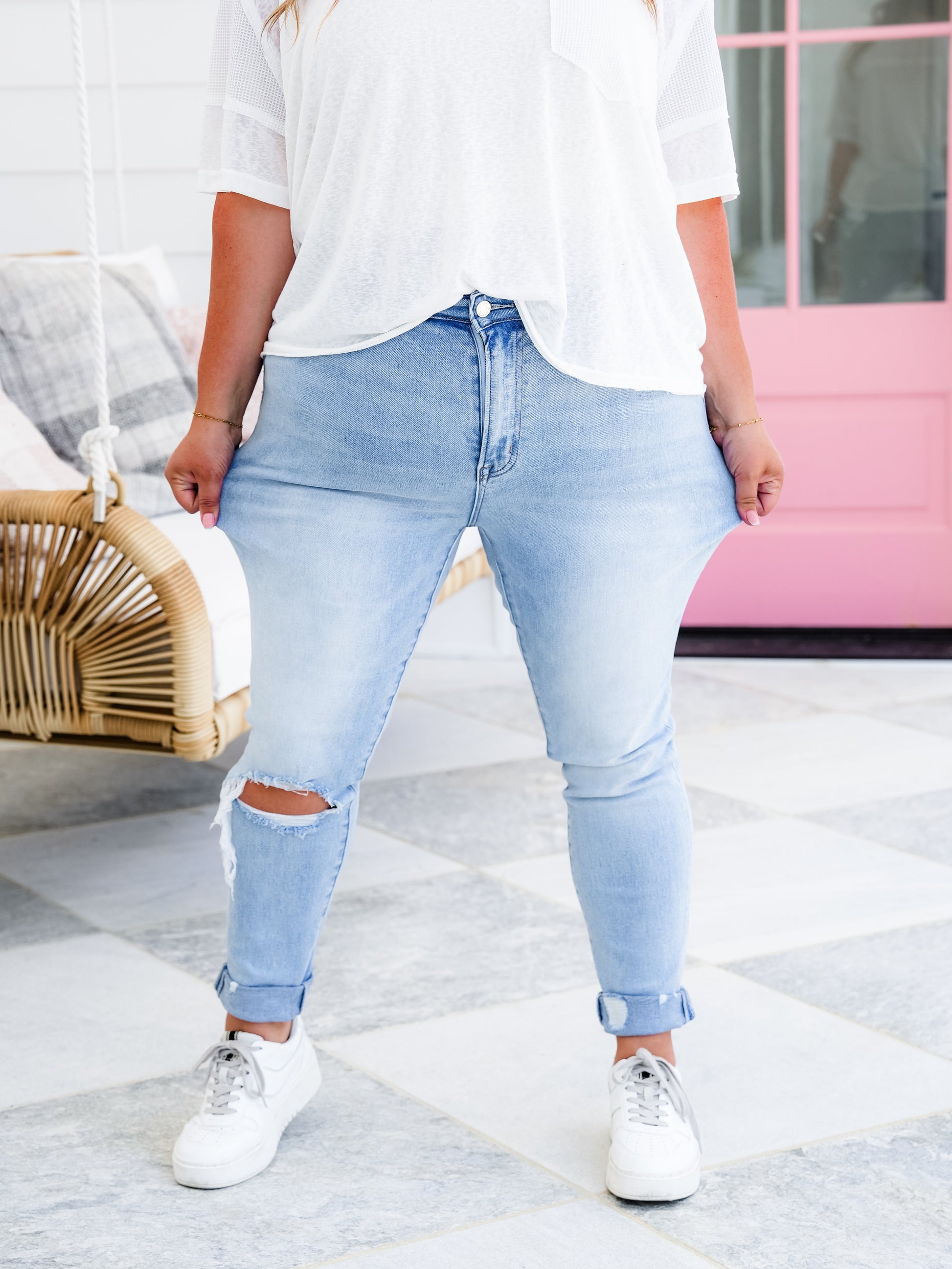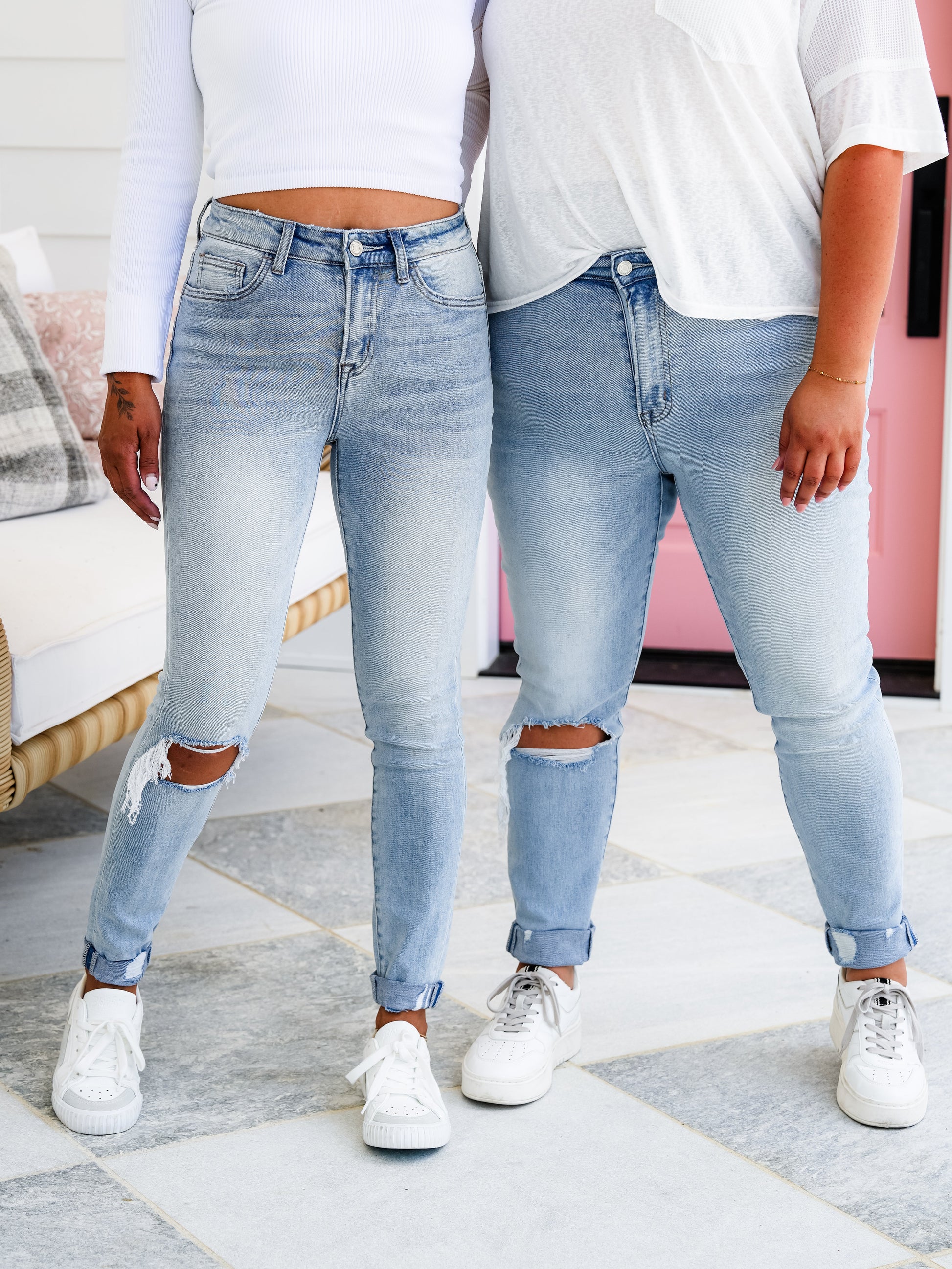 These light washed jeans are INCREDIBLE! They are a mid-rise with a blown out knee and unfinished hem. You will get them cuffed, but you can uncuff them. Trust us, these are so good! They are gorgeous and are so dang flattering! Believe us when we tell you that these will be in heavy rotation all year round, girls!