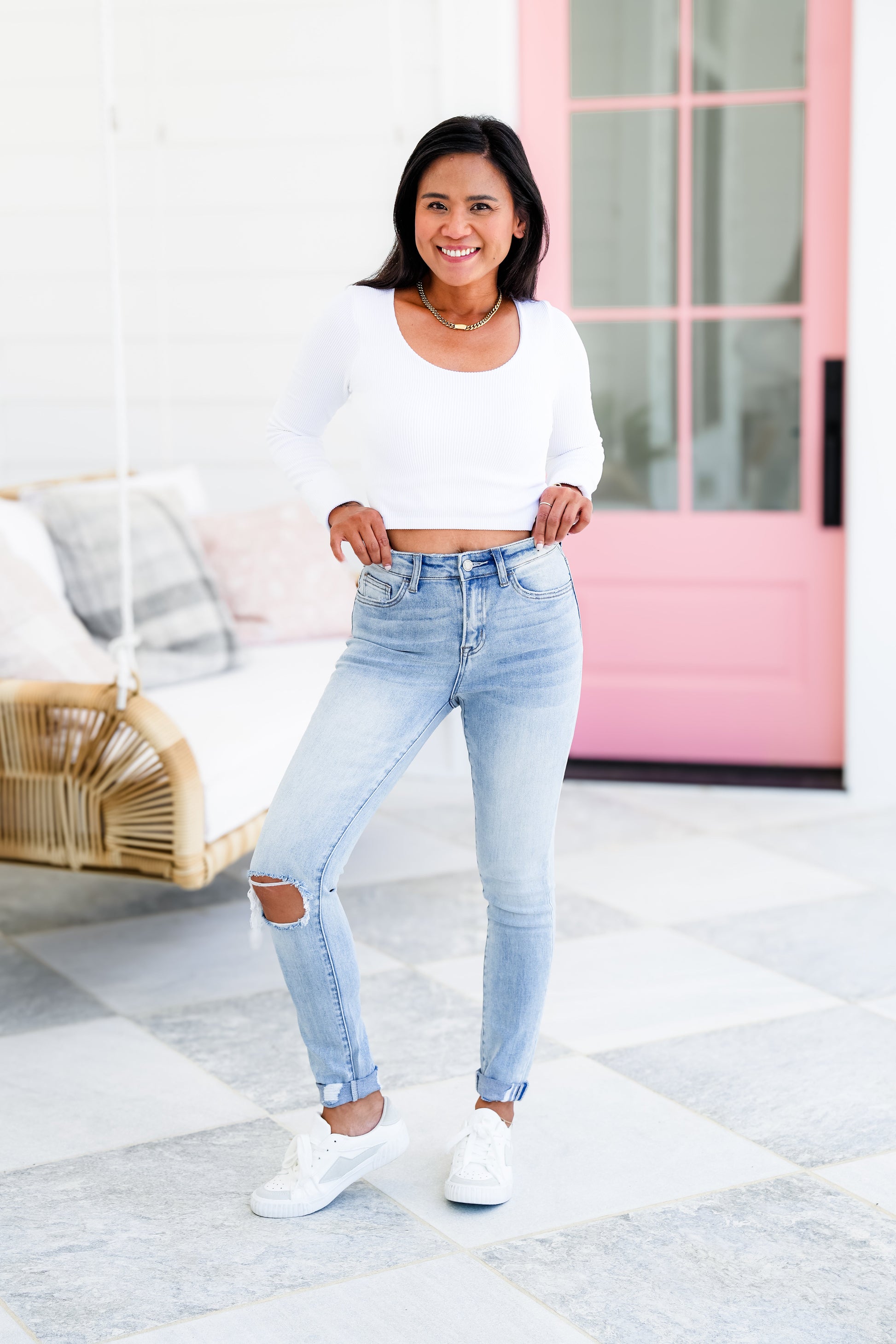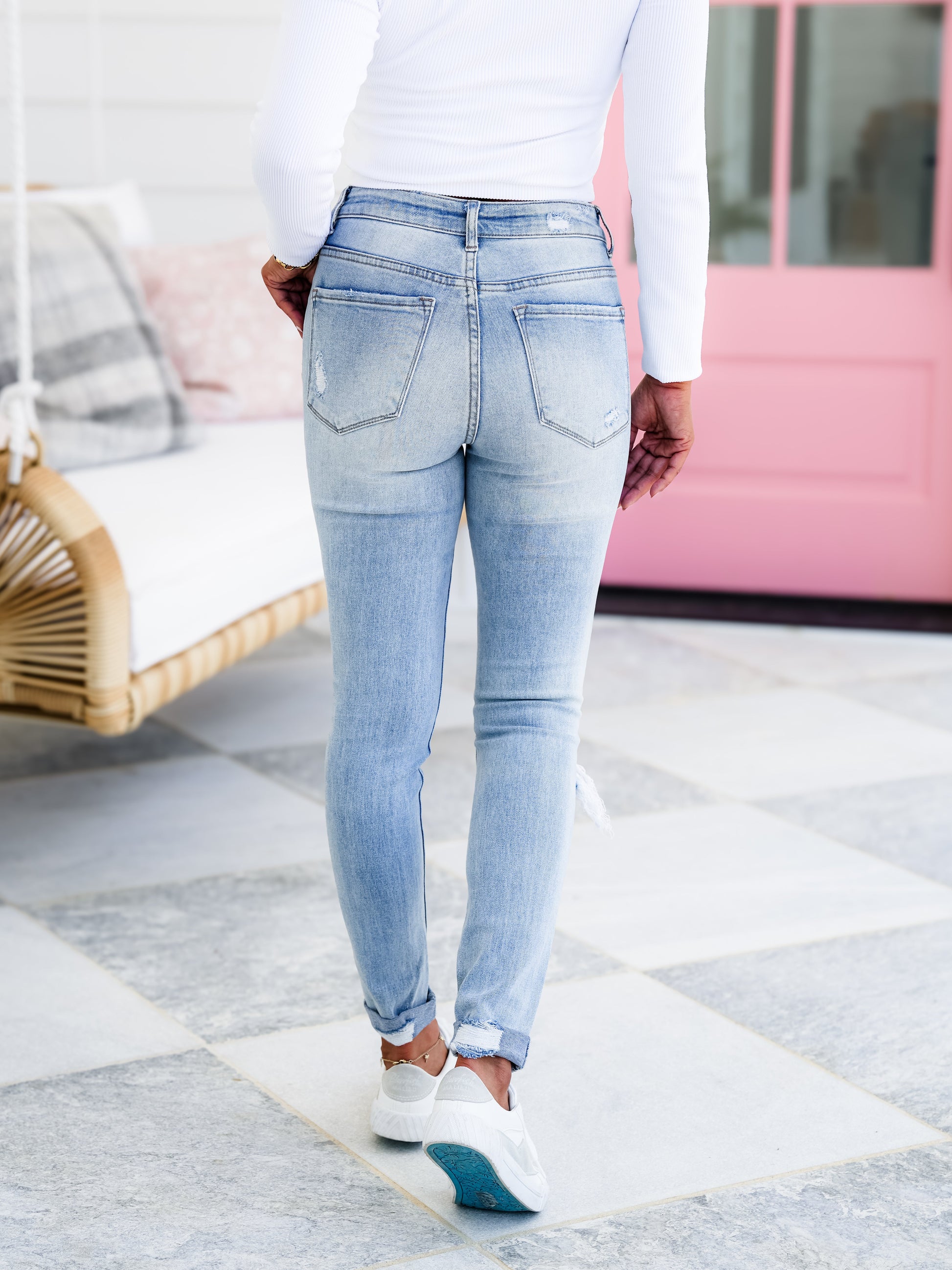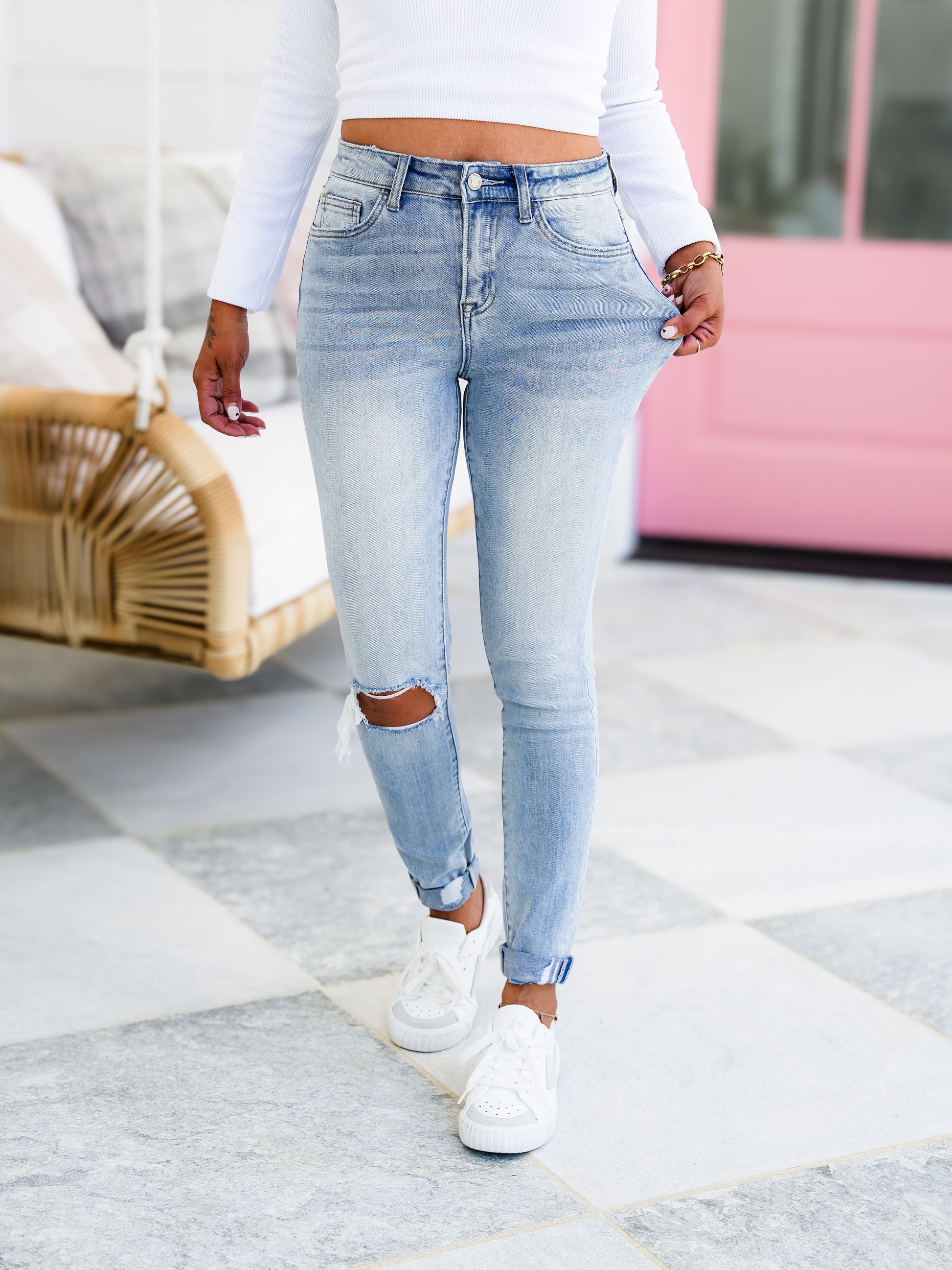 These light washed jeans are INCREDIBLE! They are a mid-rise with a blown out knee and unfinished hem. You will get them cuffed, but you can uncuff them. Trust us, these are so good! They are gorgeous and are so dang flattering! Believe us when we tell you that these will be in heavy rotation all year round, girls!