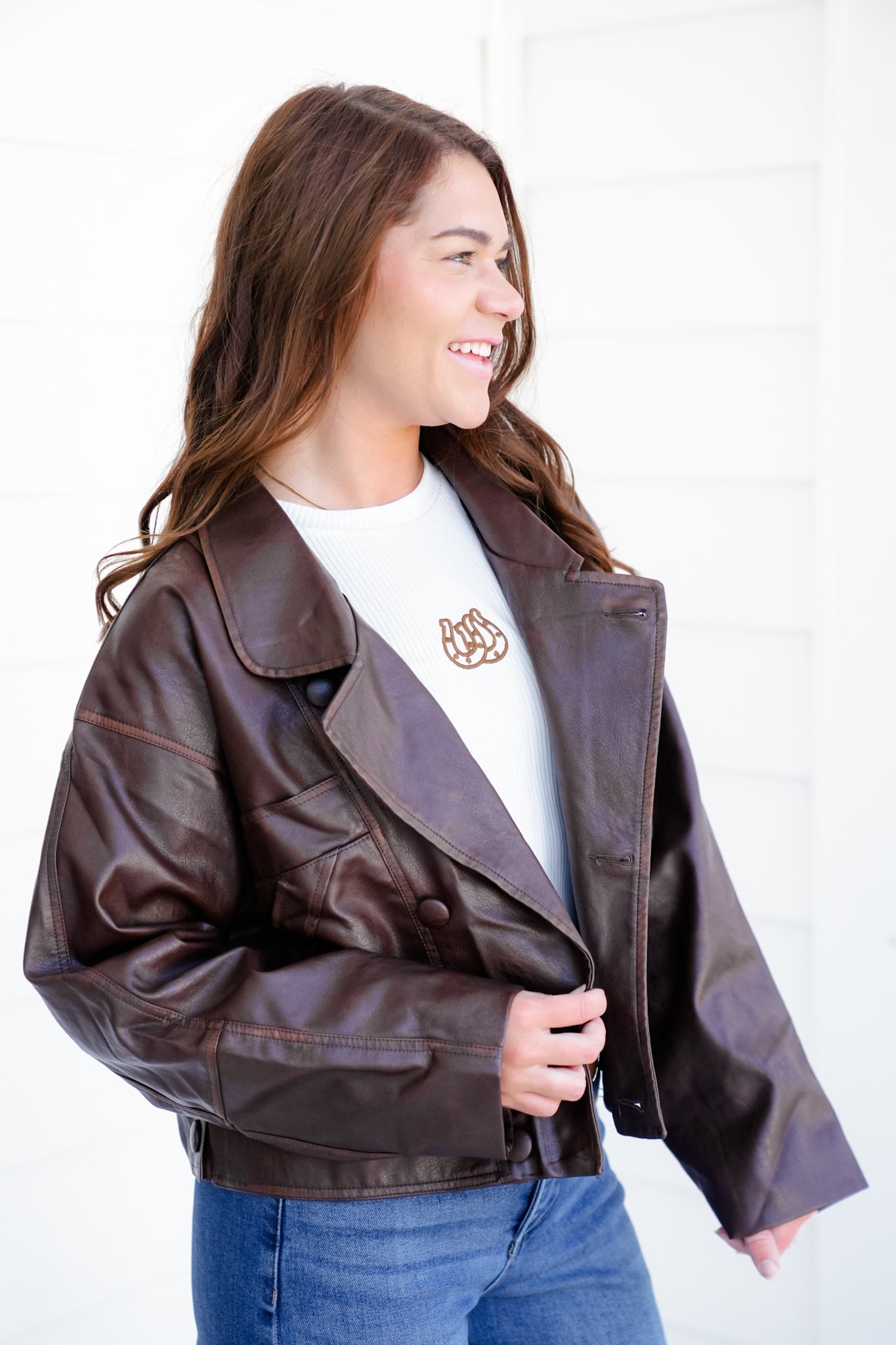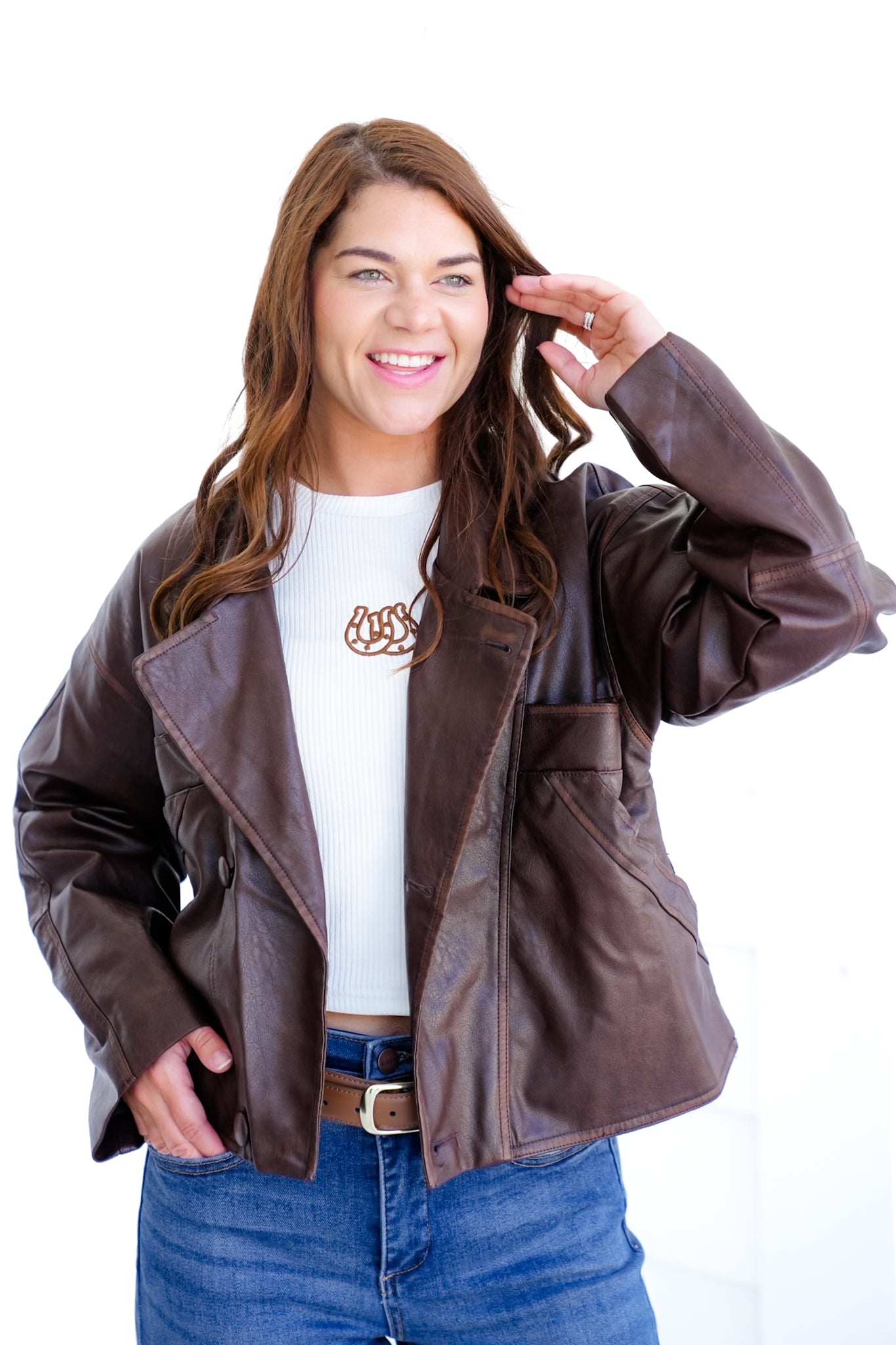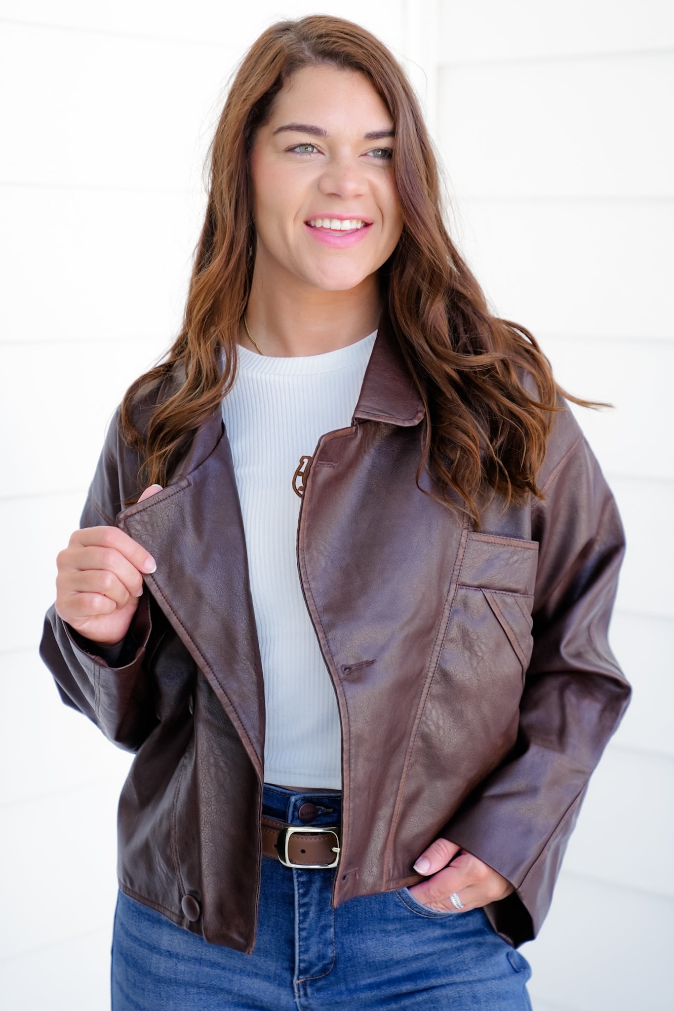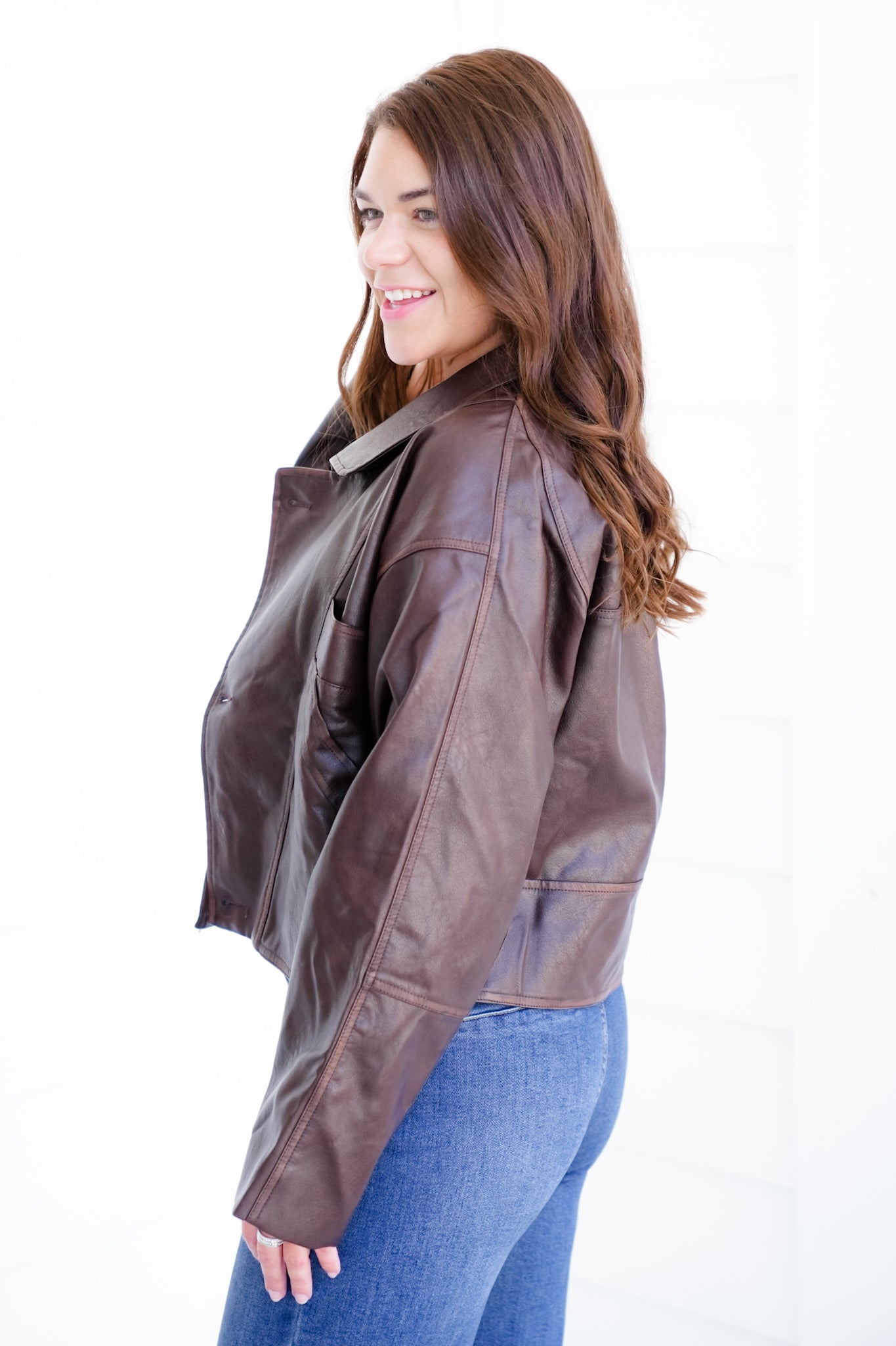 This jacket brings the perfect mix of classic and edgy. The washed brown vegan leather has that cool, vintage-inspired vibe while still being modern enough to pair with your everyday looks. Style it with jeans and boots for a casual night out, or layer over a dress to add instant attitude.