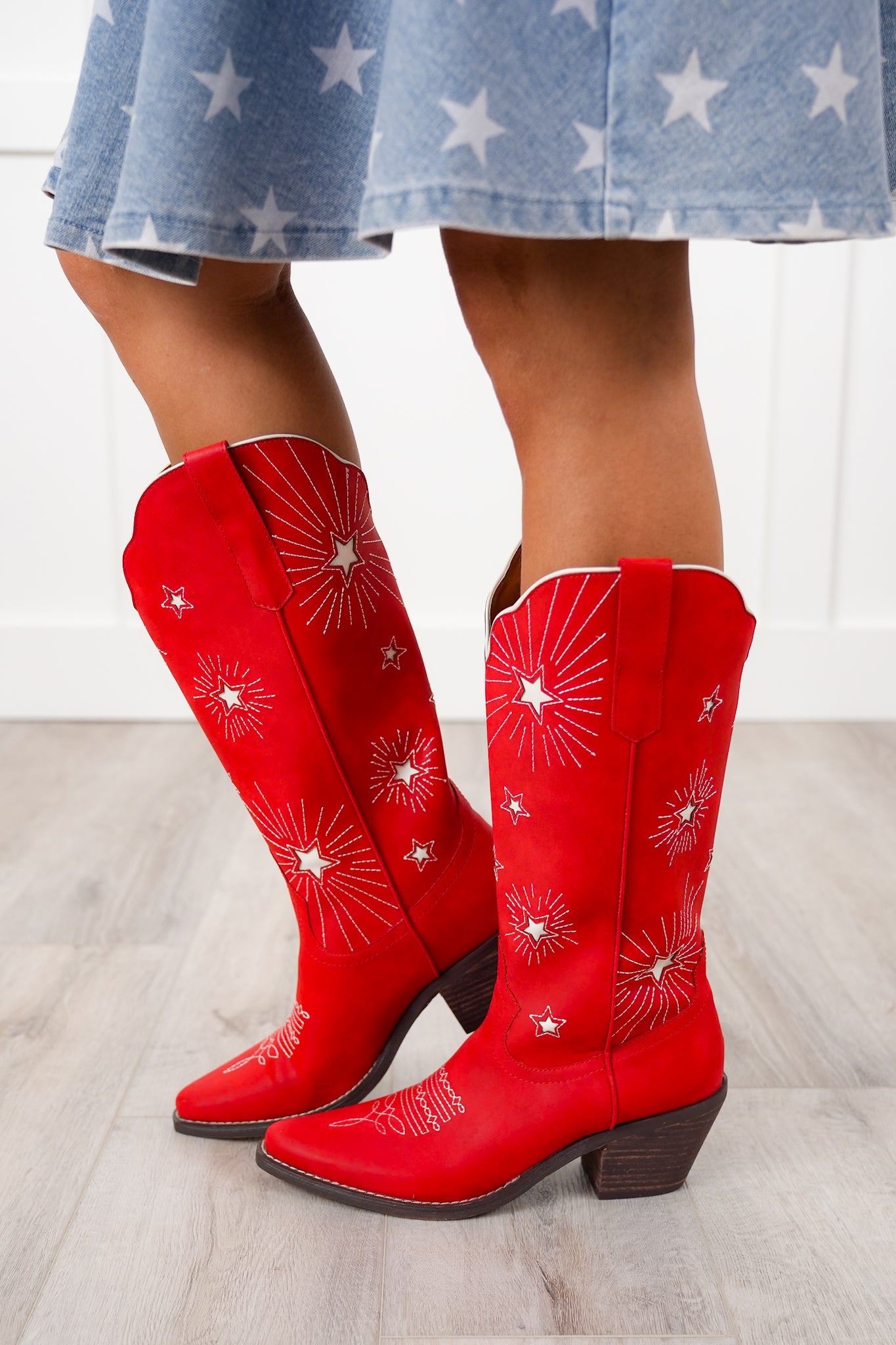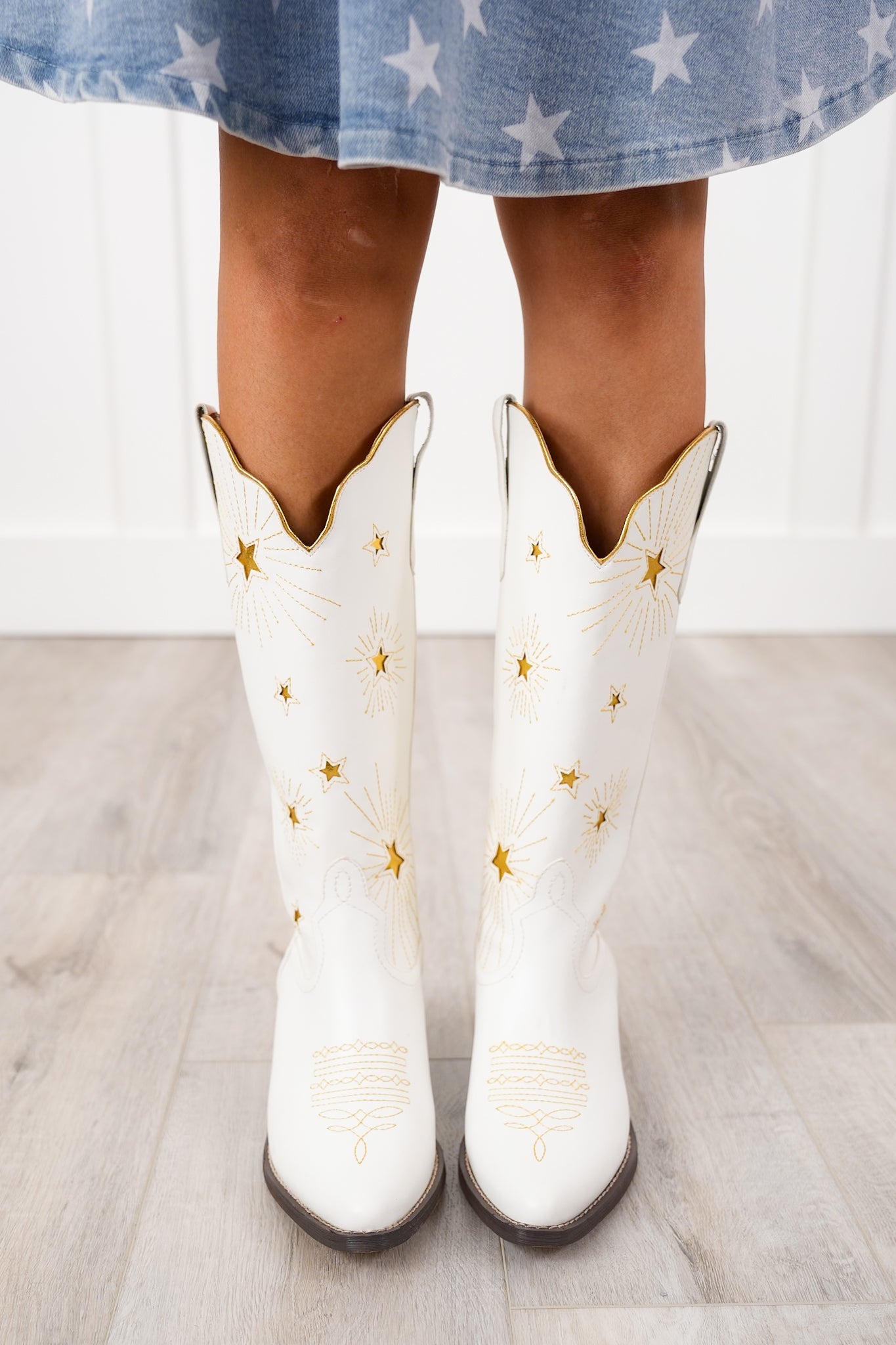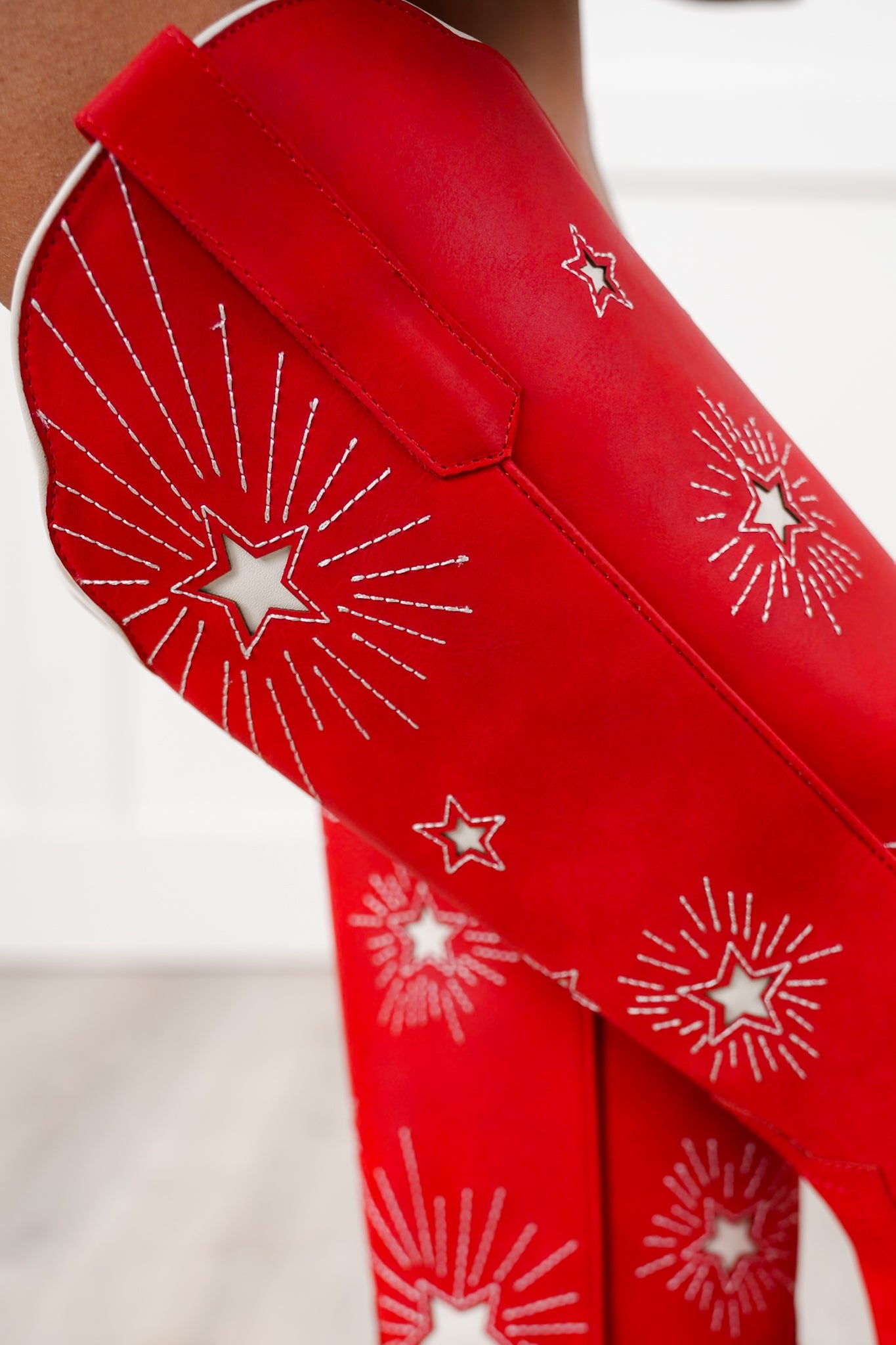 Complete your Americana-inspired look with these western-style knee-high boots. The star cutout details bring a fun, playful twist to a classic silhouette. Wear them with denim skirts, dresses, or shorts for that perfect western-meets-patriotic vibe.