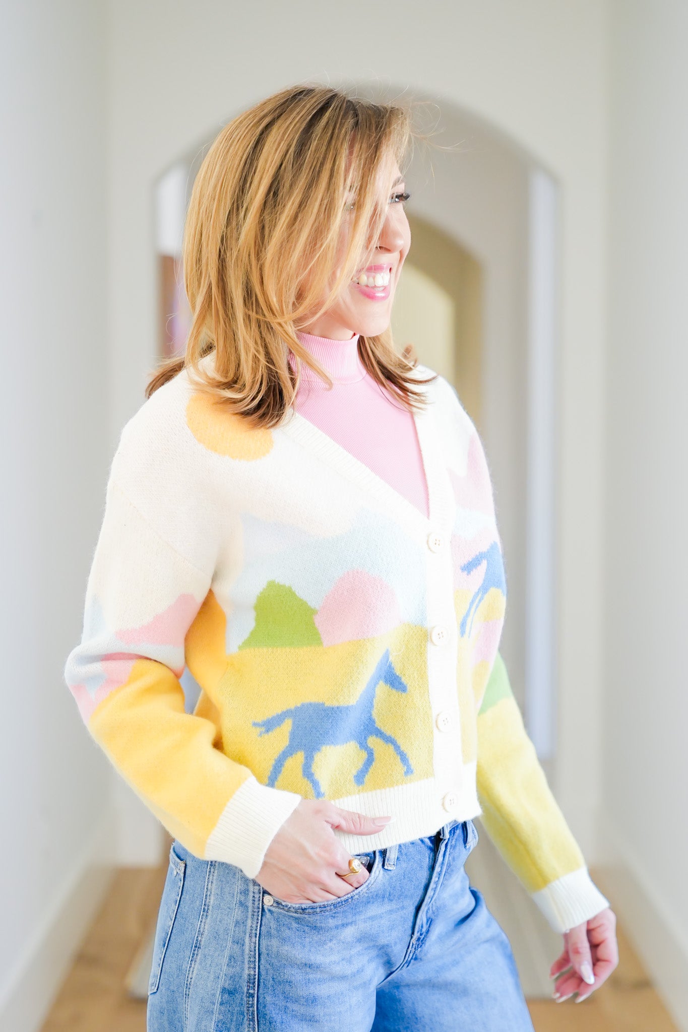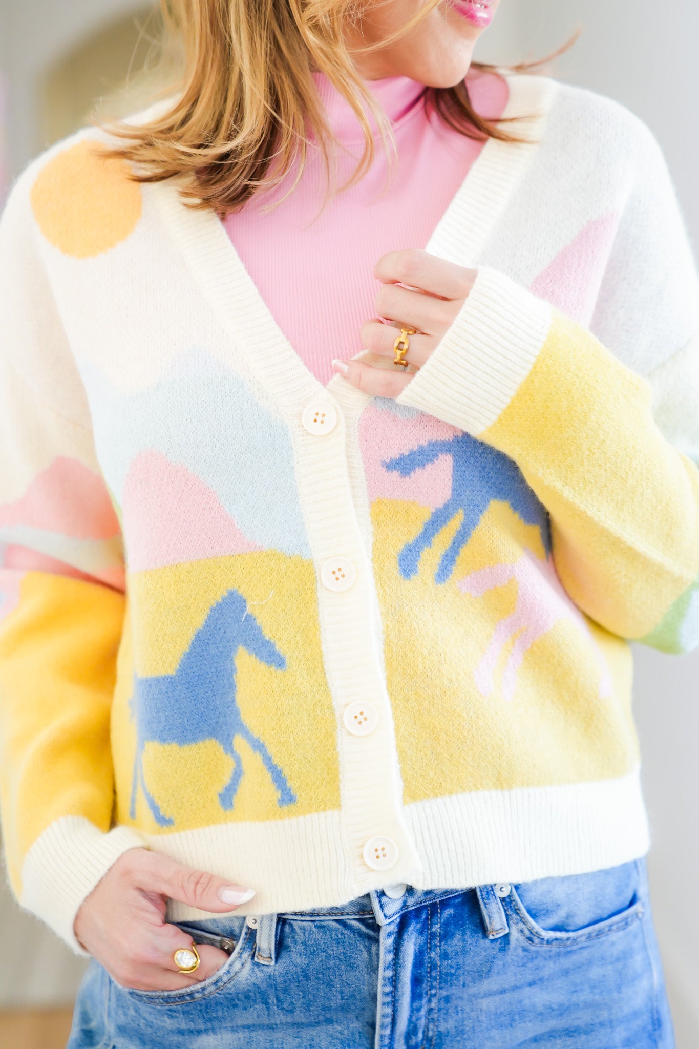 This western theme cardigan is all about standout style with bold horse graphics that instantly catch the eye. The soft knit and button-down front make it easy to wear styled as a top or layered open. Style it buttoned with high-rise jeans and boots, or wear it open over a fitted tee to let the print shine.