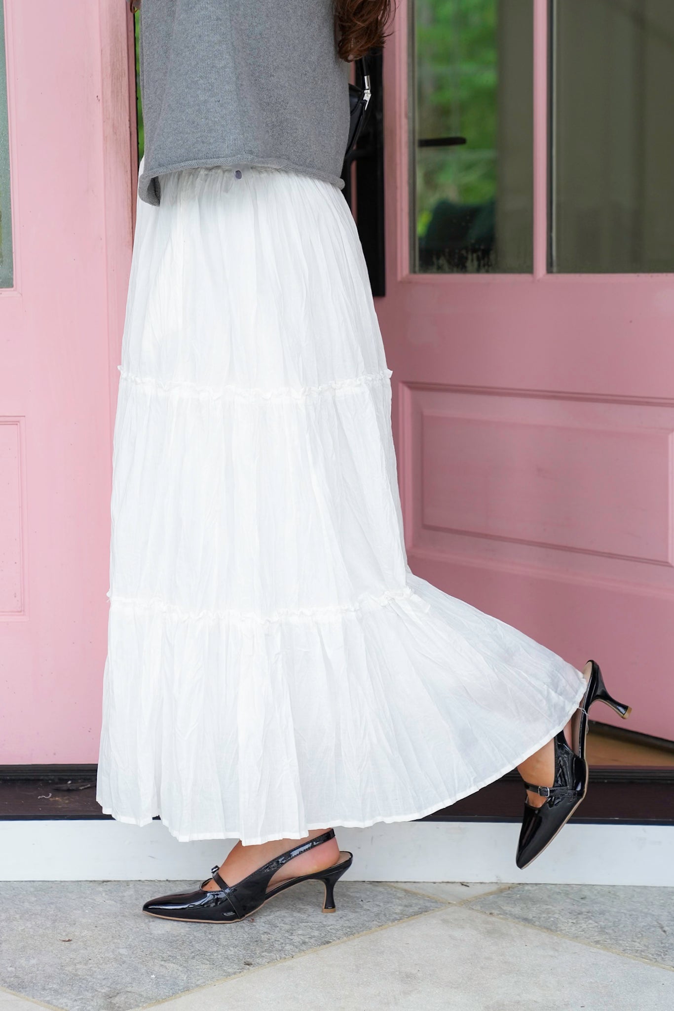 Twirl-friendly and fully charming, this white tiered midi skirt has that easy, breezy look we all crave. The crinkle fabric adds texture without bulk, while the hidden side pockets are the ultimate functional win. Dress it up with a blouse and boots or keep it casual with a tank and sandals, this one goes with everything.