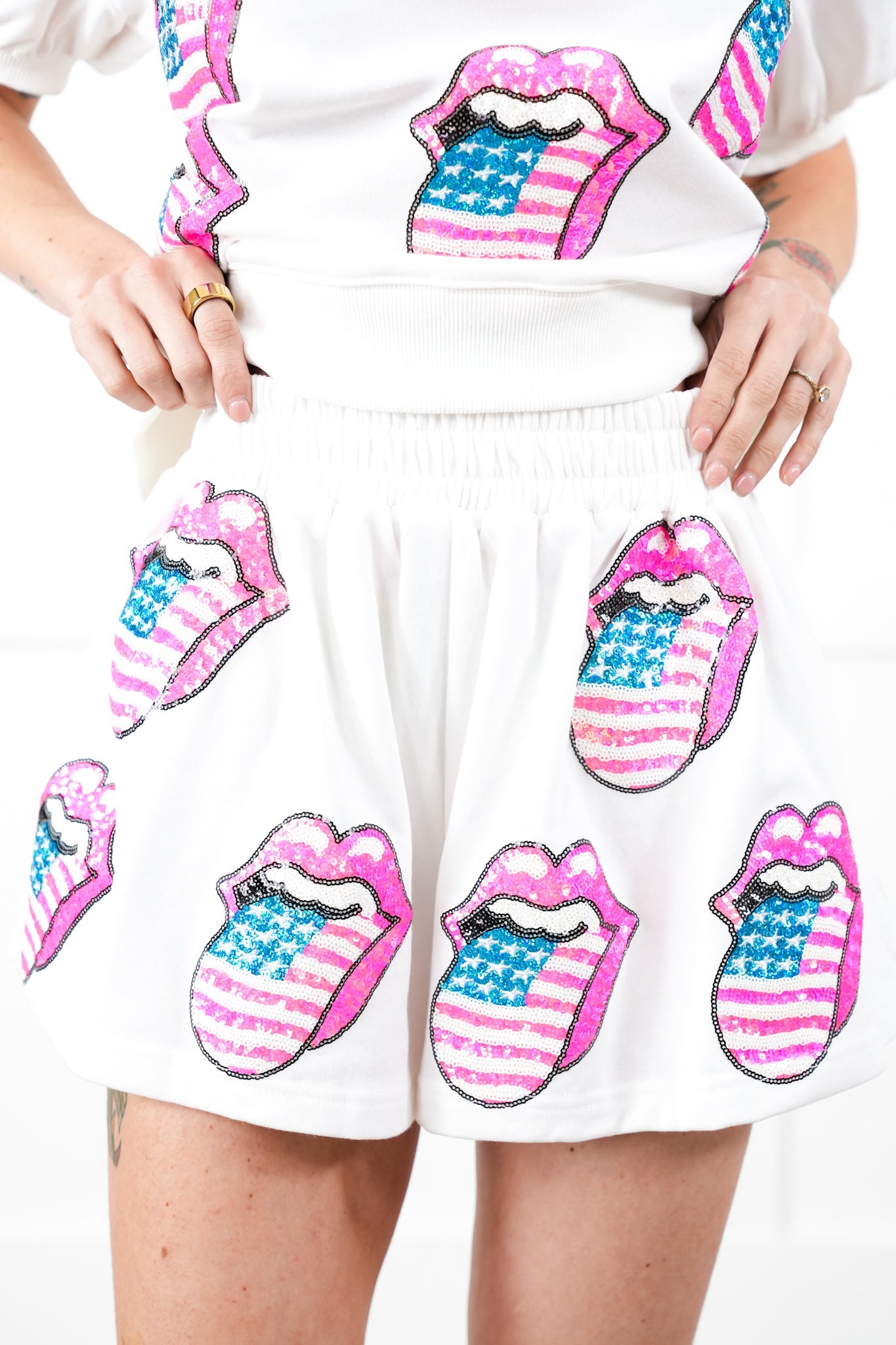 White Elastic Waist Shorts With Rolling Stones Sequin Lips And Tongue Detail