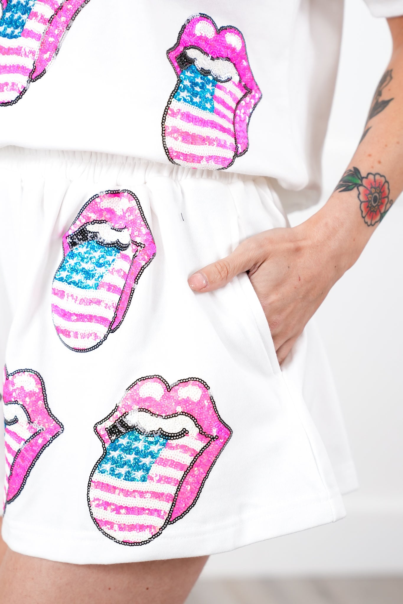 These fun, white shorts are guaranteed to turn heads with their bold, sparkly Rolling Stones lips and tongue detail! With an elastic waistband and side pockets, they combine comfort with a dash of iconic style. Whether you pair them with a simple tee or the matching top (sold separately), these shorts are a statement piece.