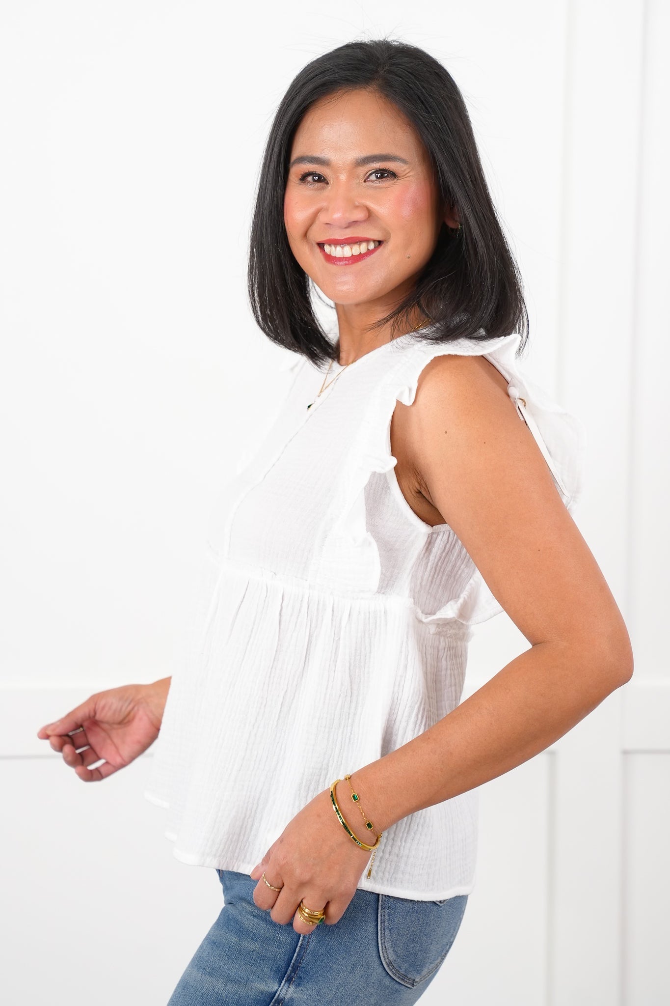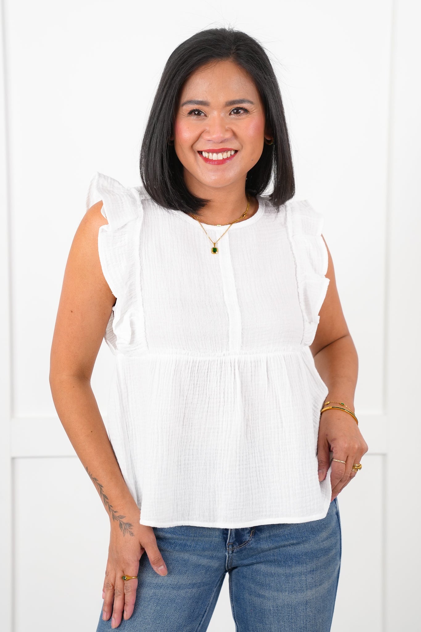 This gauzy baby doll top is sweet, airy, and so easy to wear with its flowy silhouette and charming details. The round neckline, delicate ruffle sleeves, and front seam detail add just the right touch of femininity, making this one a timeless piece you’ll reach for again and again.