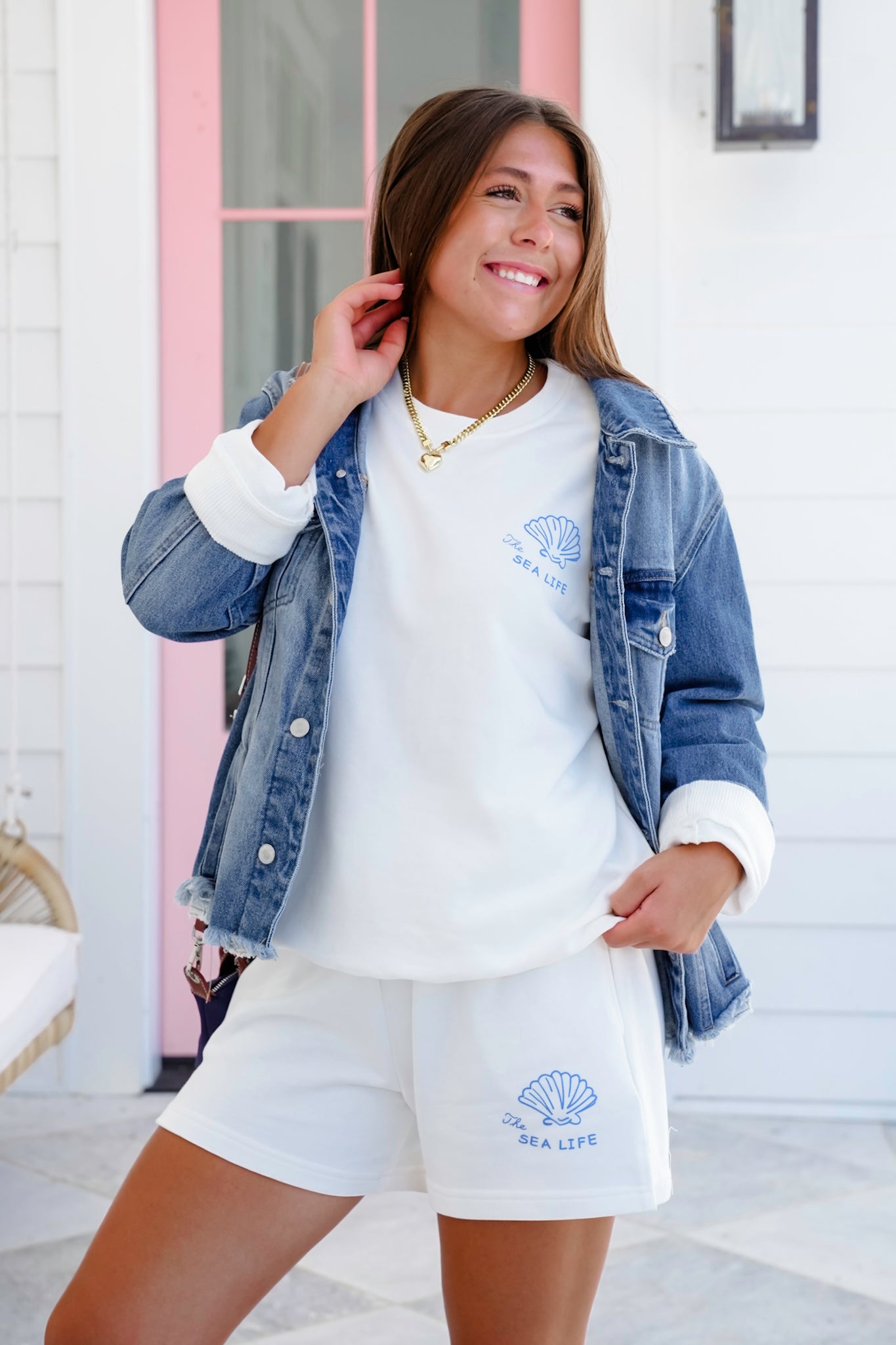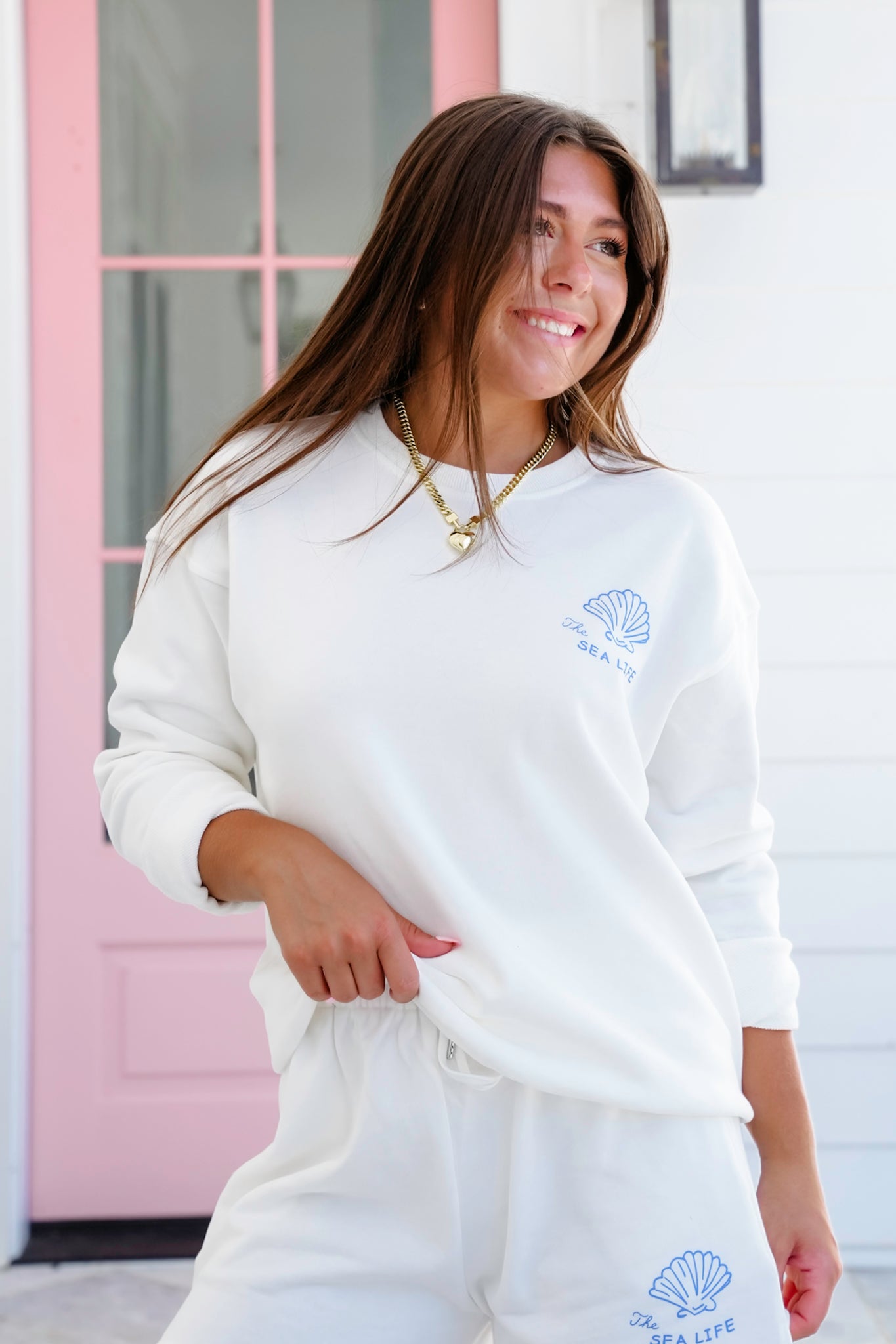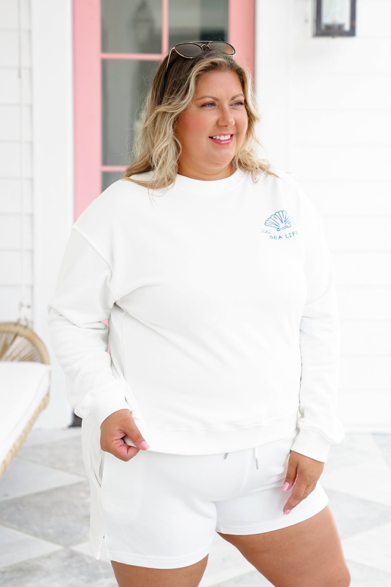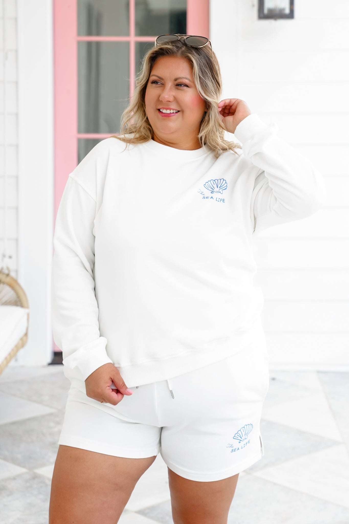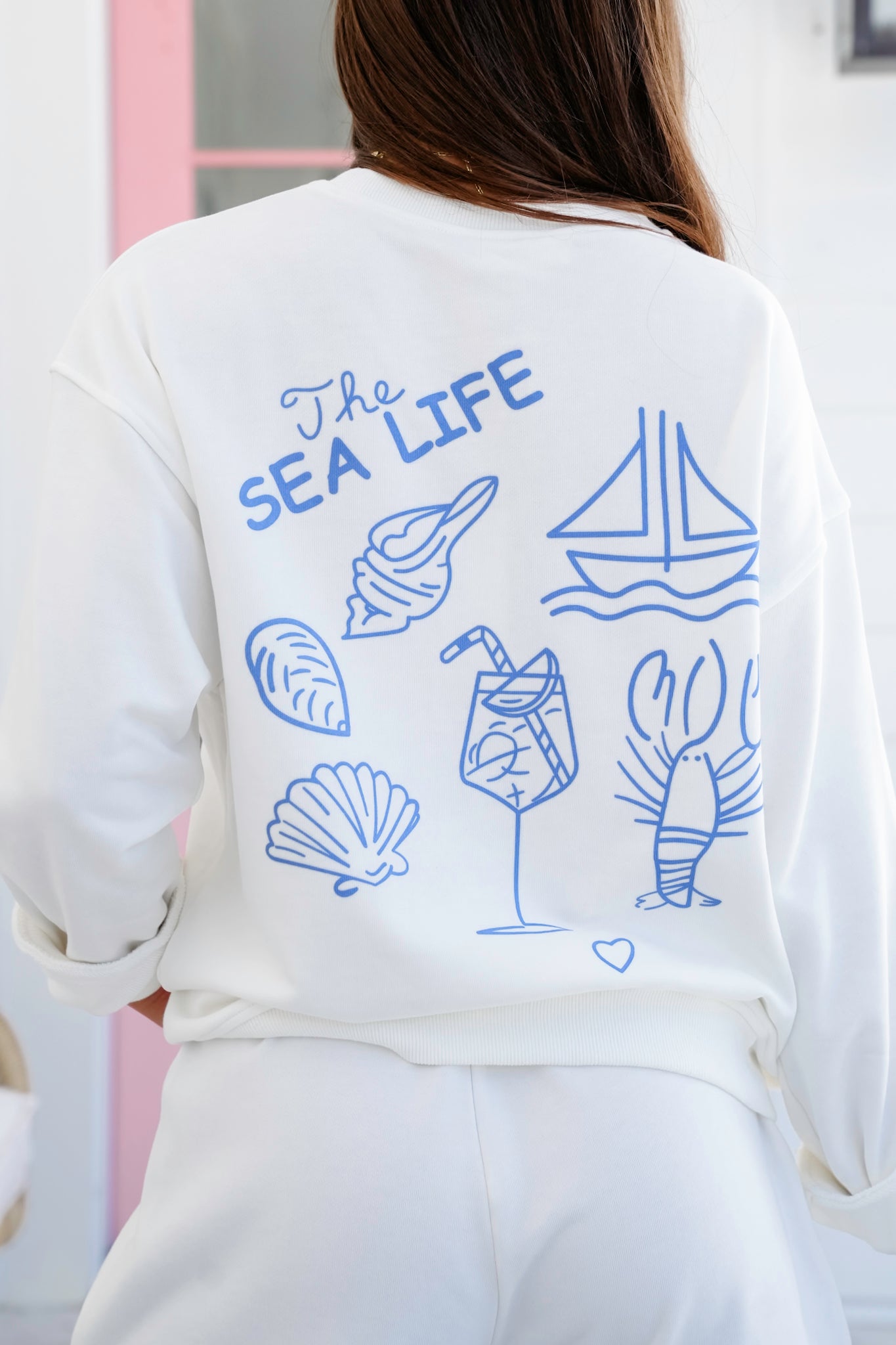 This cozy white sweatshirt is your new laid-back bestie. Featuring charming blue “The Sea Life” graphics on the chest and back, it brings a playful nod to days spent by the water. Pair it with the matching shorts (sold separately) for a walk on the beach, or half-tuck it into jeans with flip-flops for bonfire nights.
