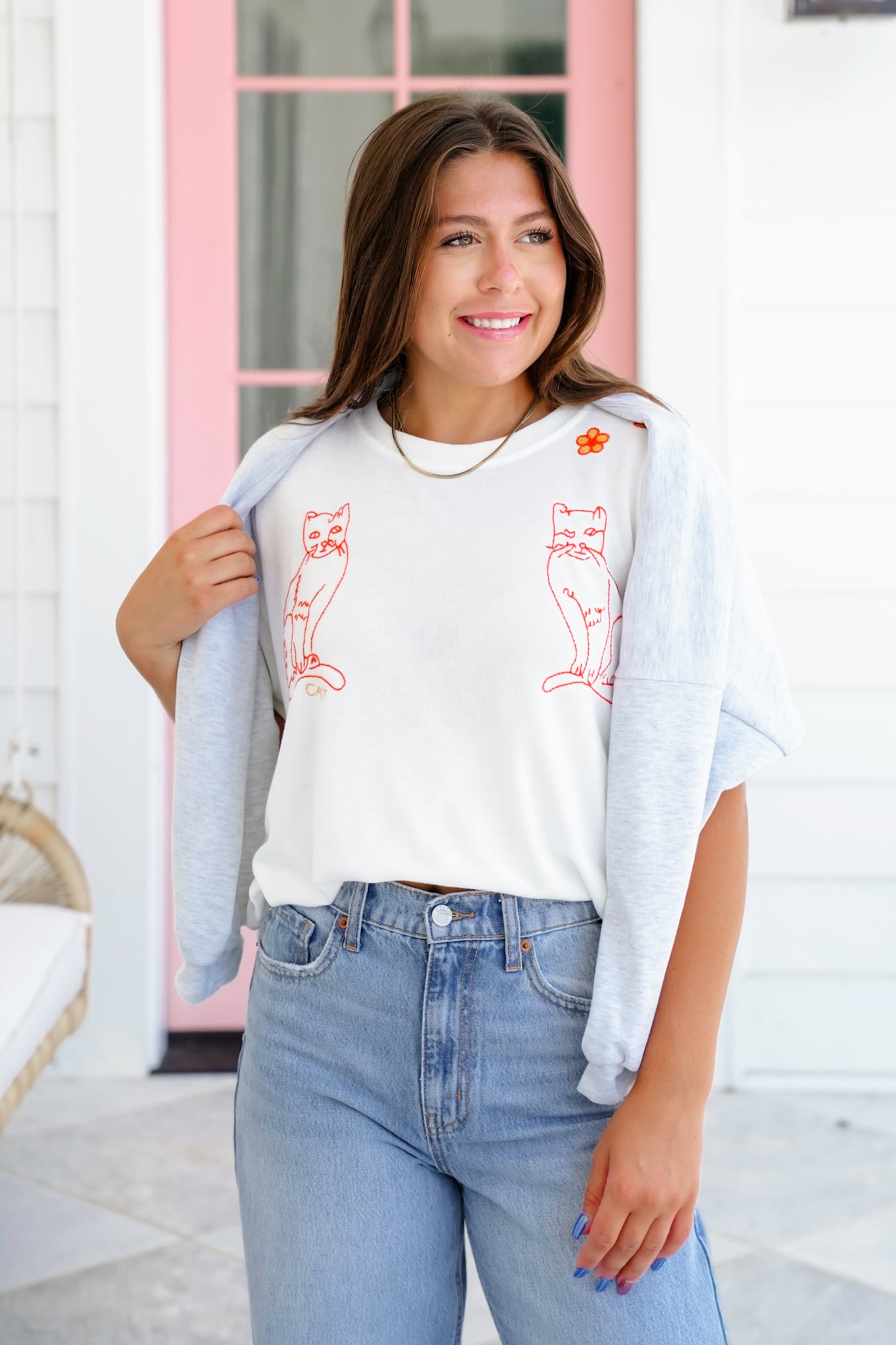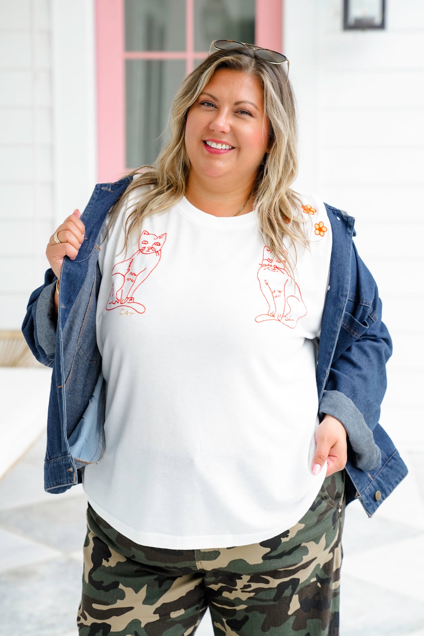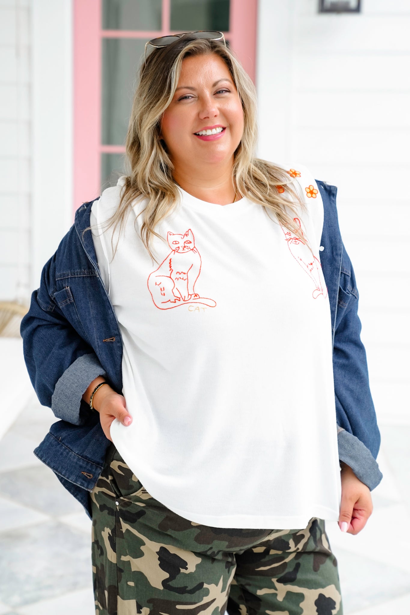This tee is pure, playful fun, featuring sweet orange cat sketches and little floral accents across the shoulders. Pair it with denim cutoffs and sandals for an easygoing weekend look, or slip it over leggings for a laid-back day.