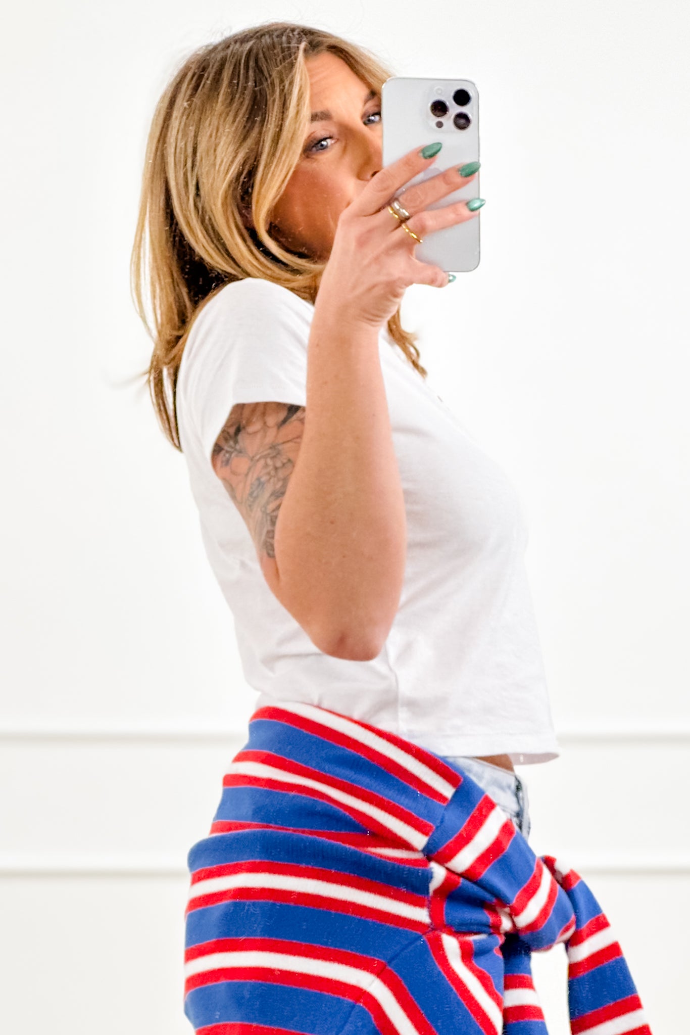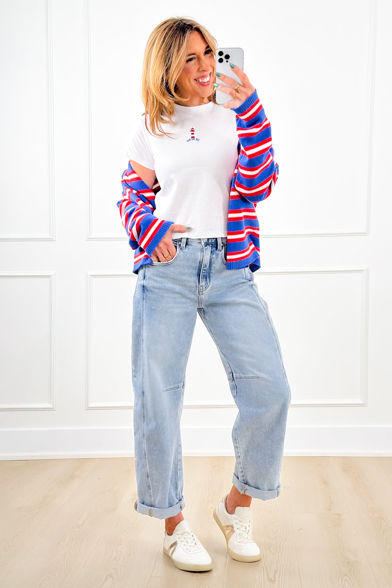 Sea la vie… turns out a tiny lighthouse is all it takes to make a white tee way cuter. That embroidered detail is such a fun little surprise that sets it apart while keeping everything clean and easy. Lightweight and comfy for all-day wear, and it pairs perfectly with denim, shorts, or layered under a cardigan.