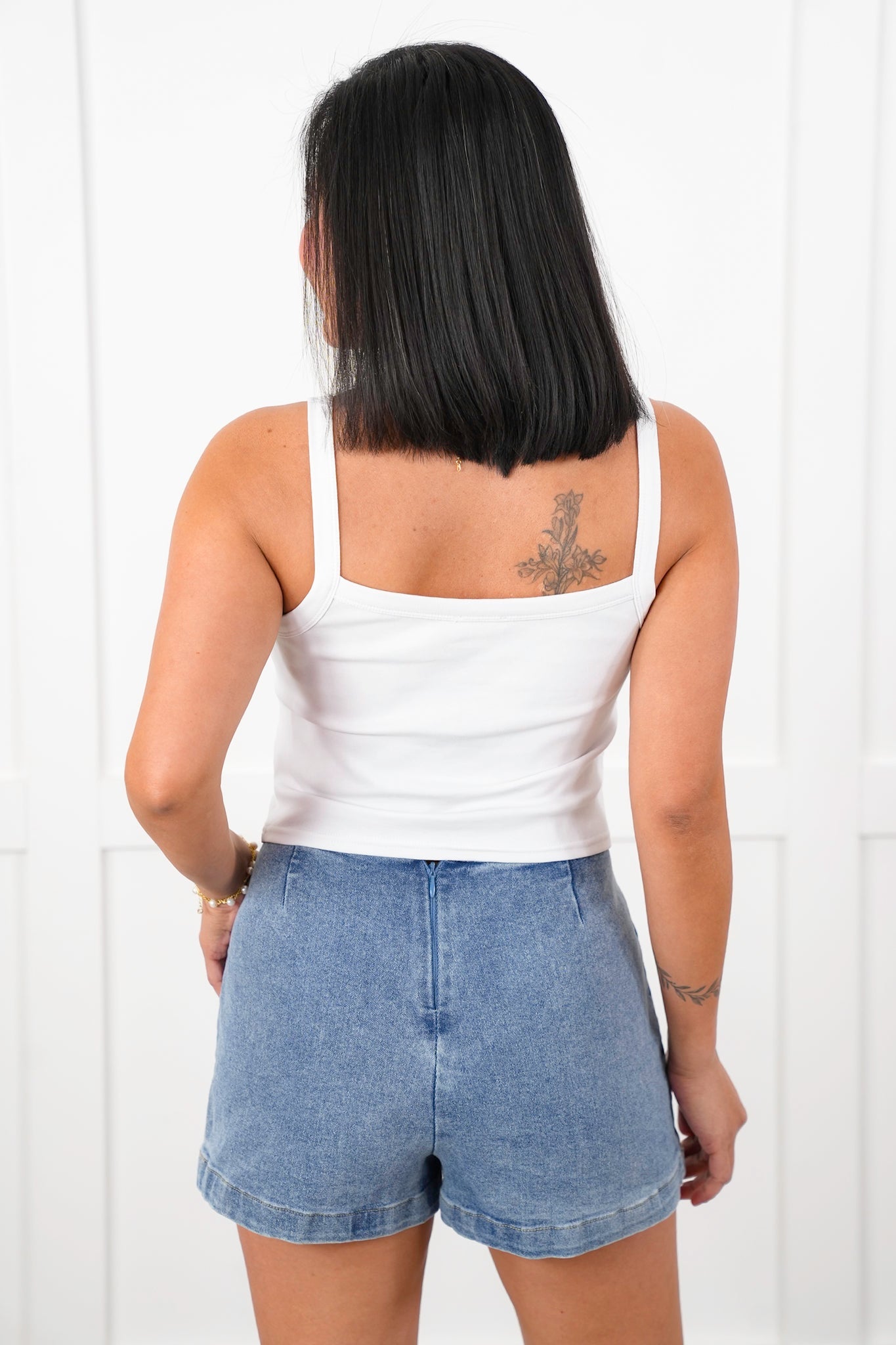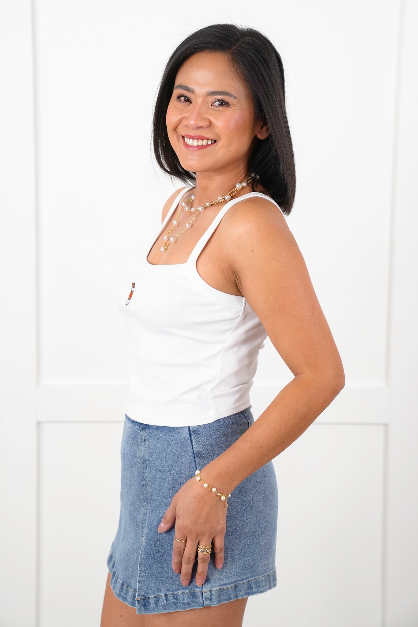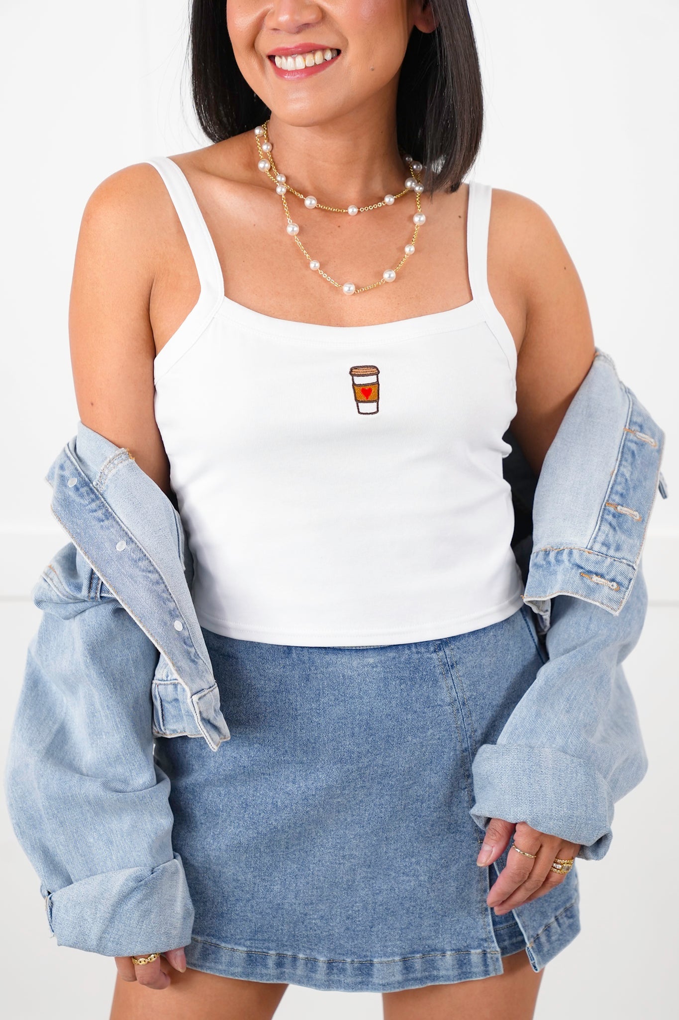 White Tank Top with Embroidered "Coffee Cup" Detail
