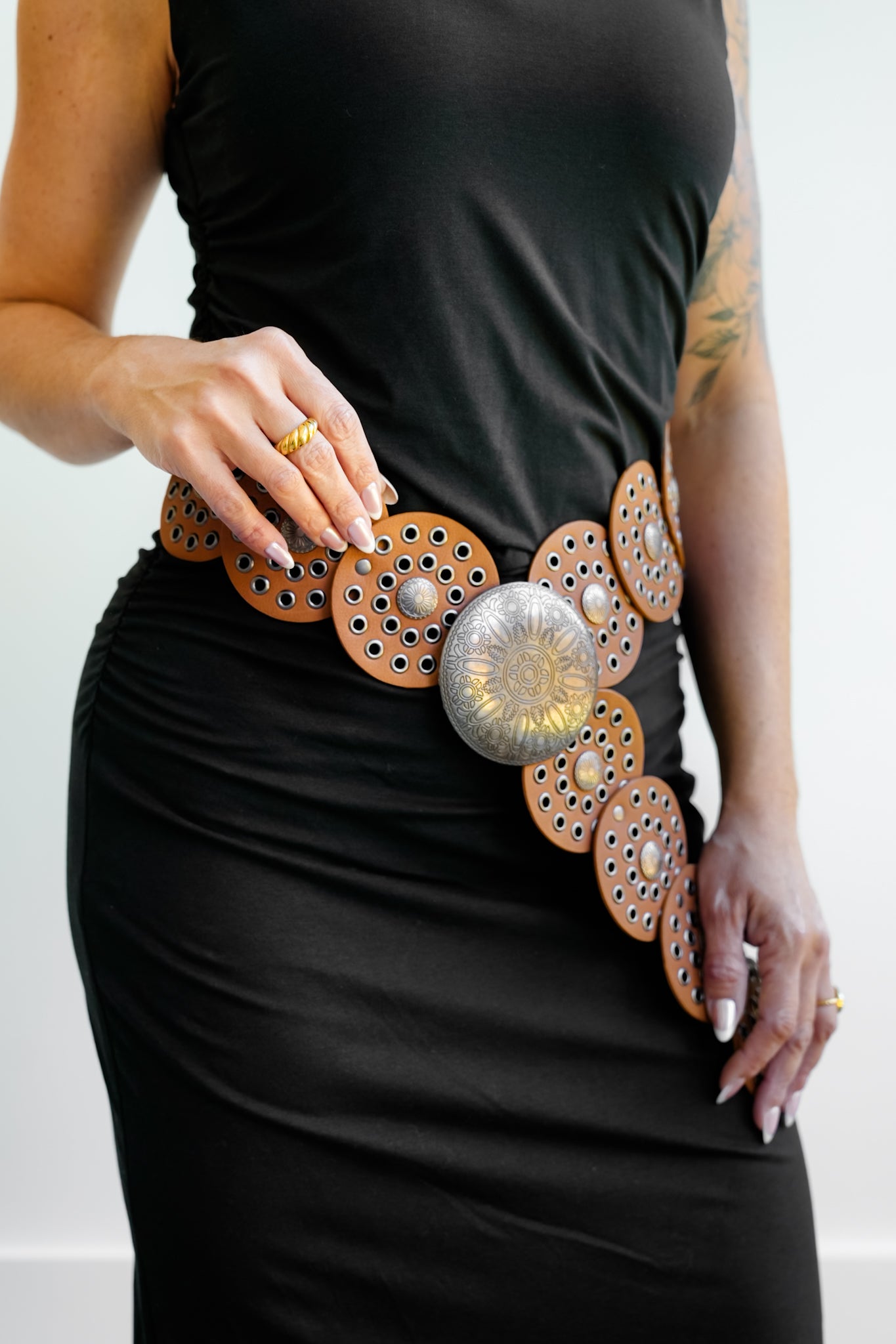 This belt is all about making an outfit pop with bold western energy and eye-catching circle details that instantly elevate your look. The wide design defines the waist beautifully, and the grommet accents give it that standout, styled finish. Wear it over dresses, with high-rise denim, or layered with skirts to turn even the simplest outfit into a full look.